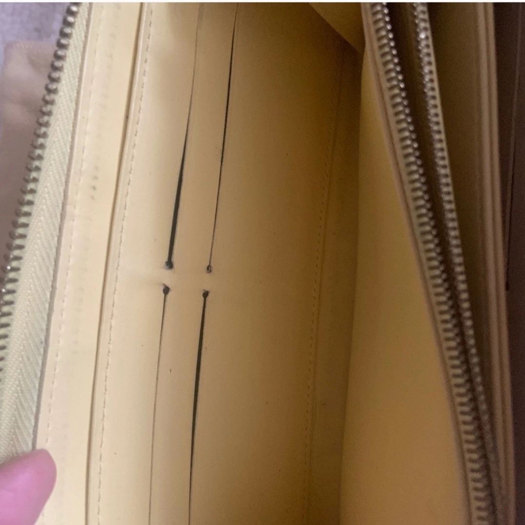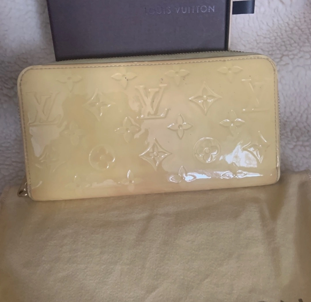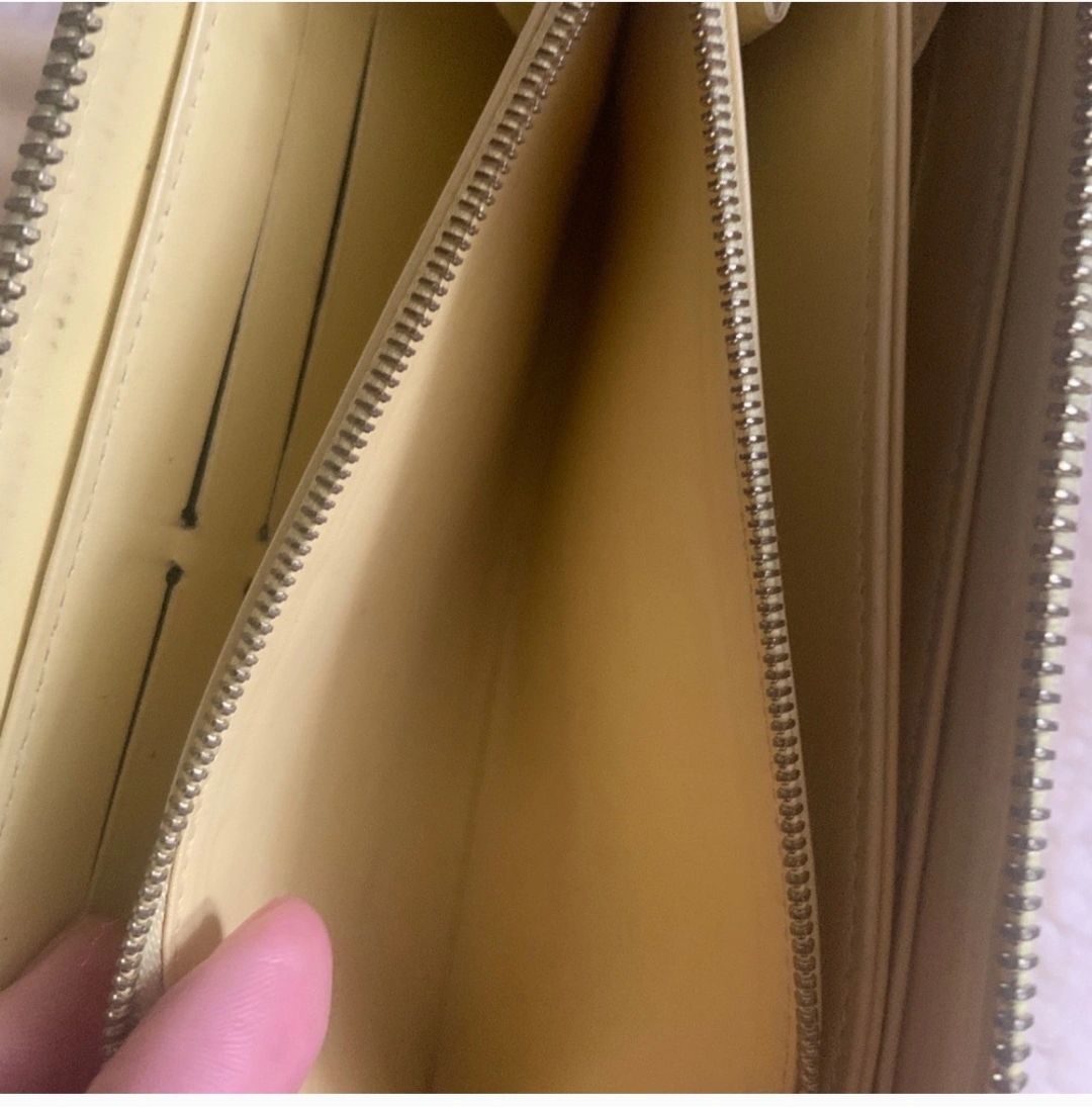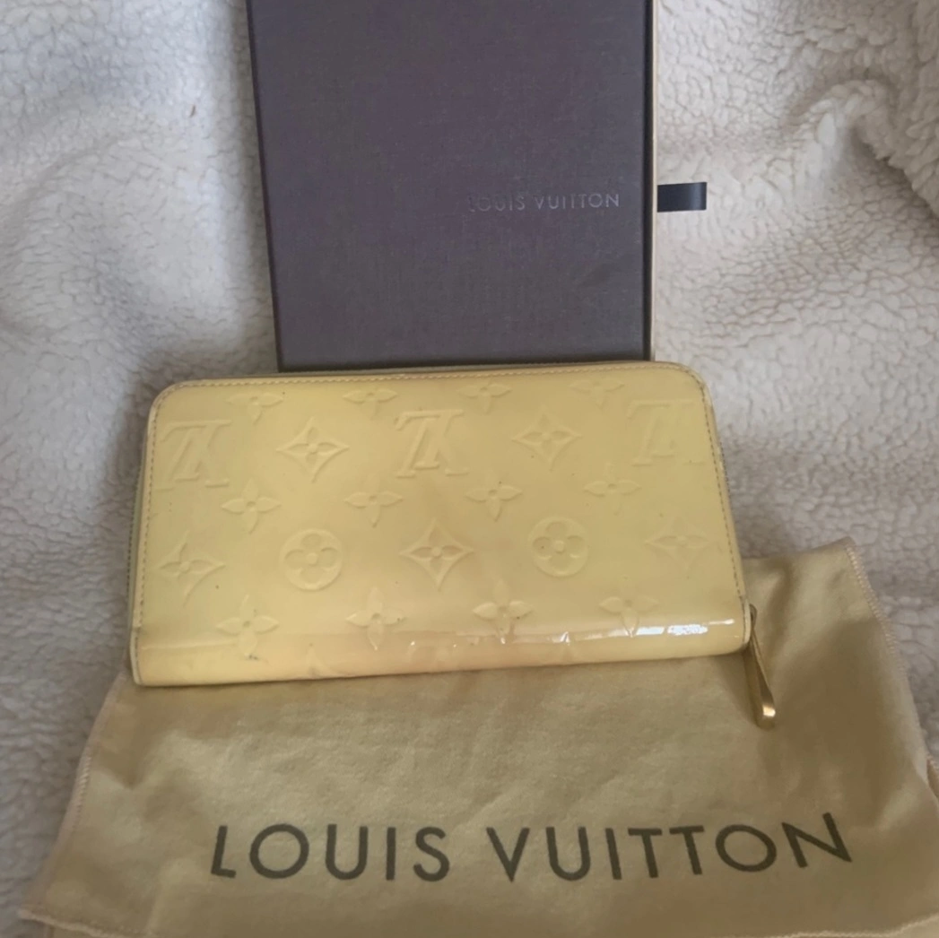 Pre-owned Louis Vuitton wallet. Pale yellow patent leather. Monogram embossed. Gold-toned zipper and hardware. Comes with box and dust bag.