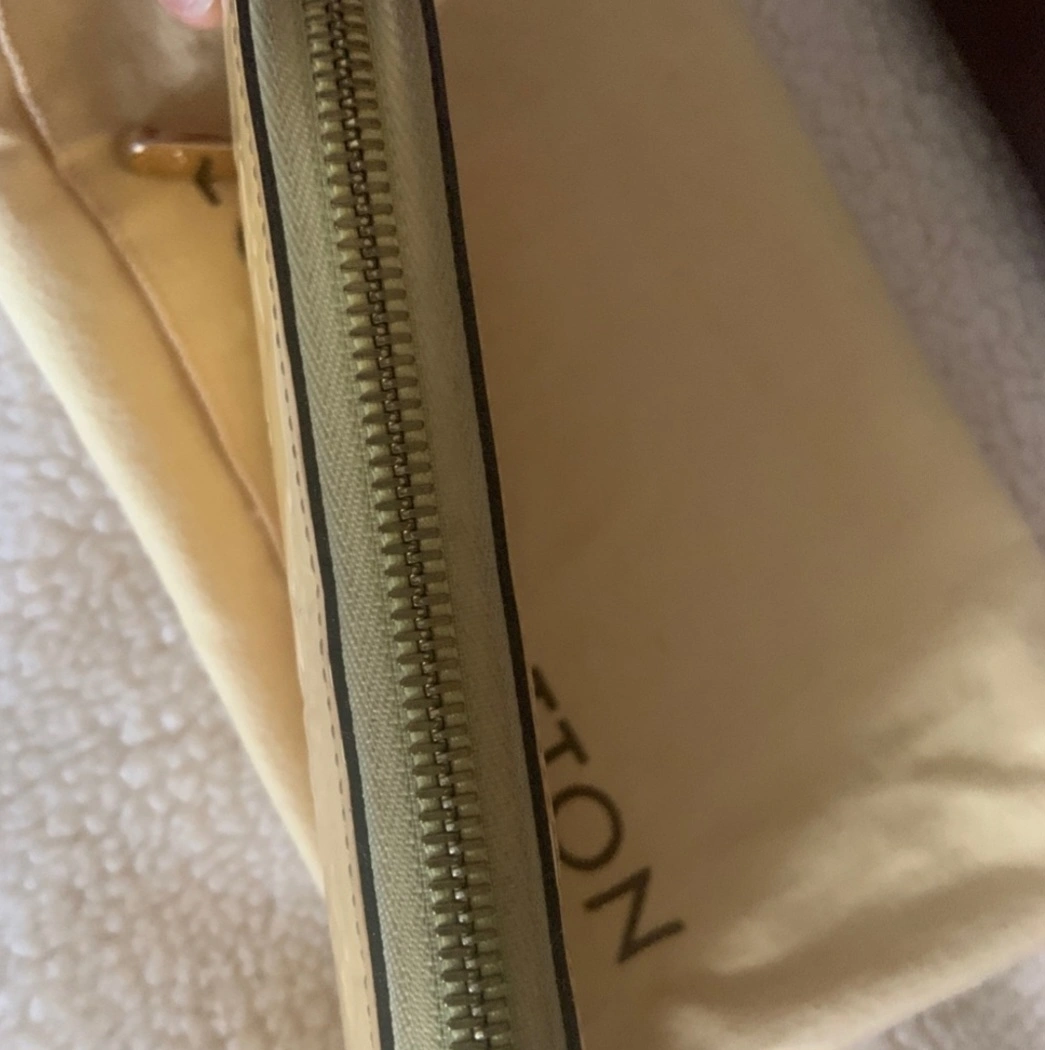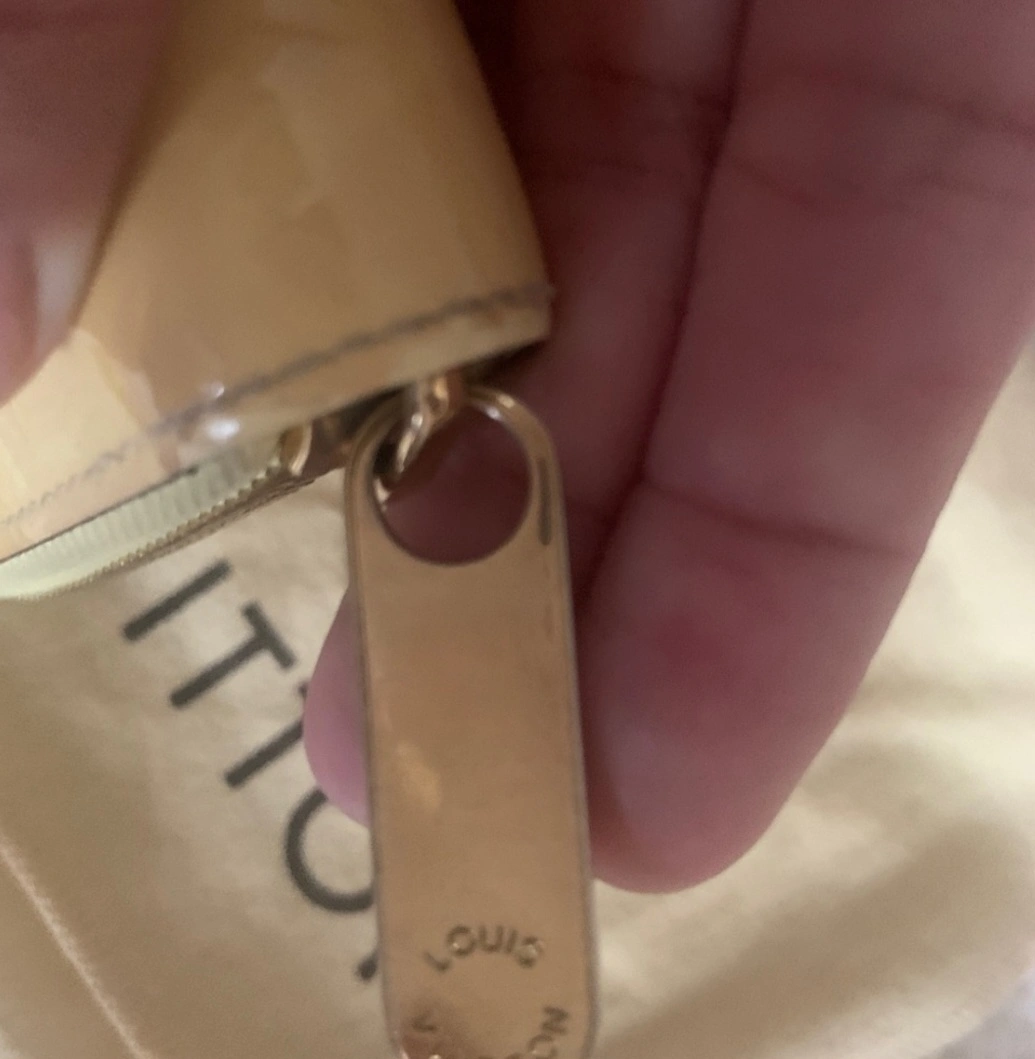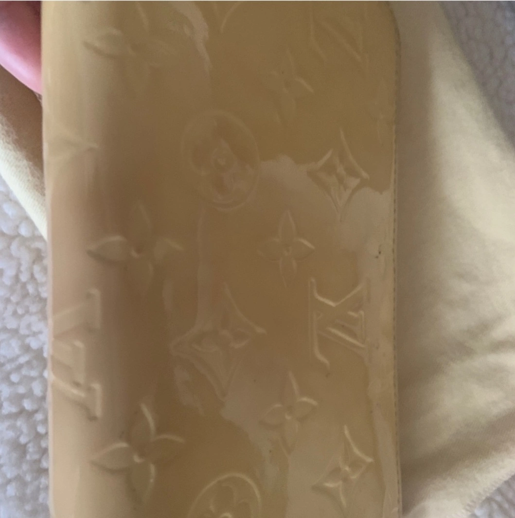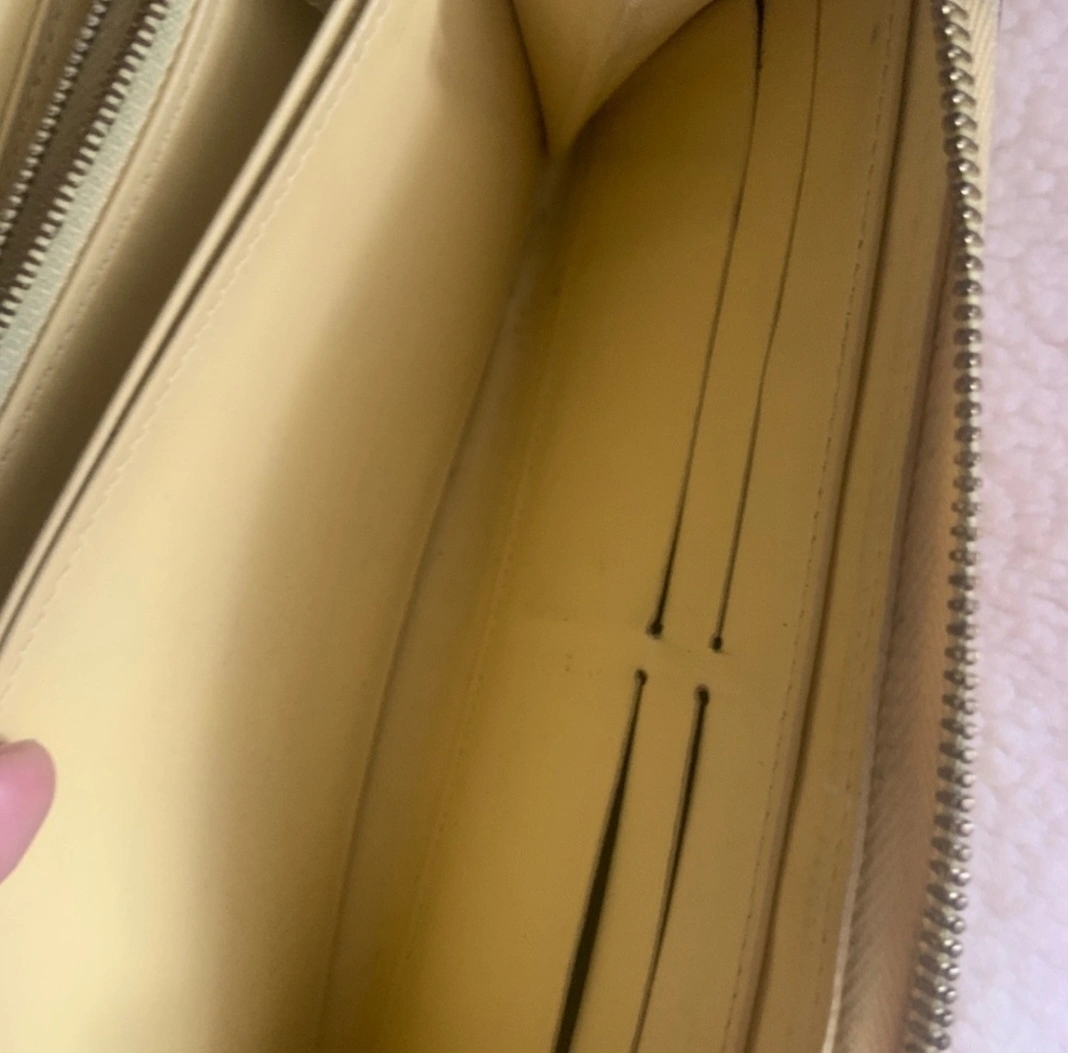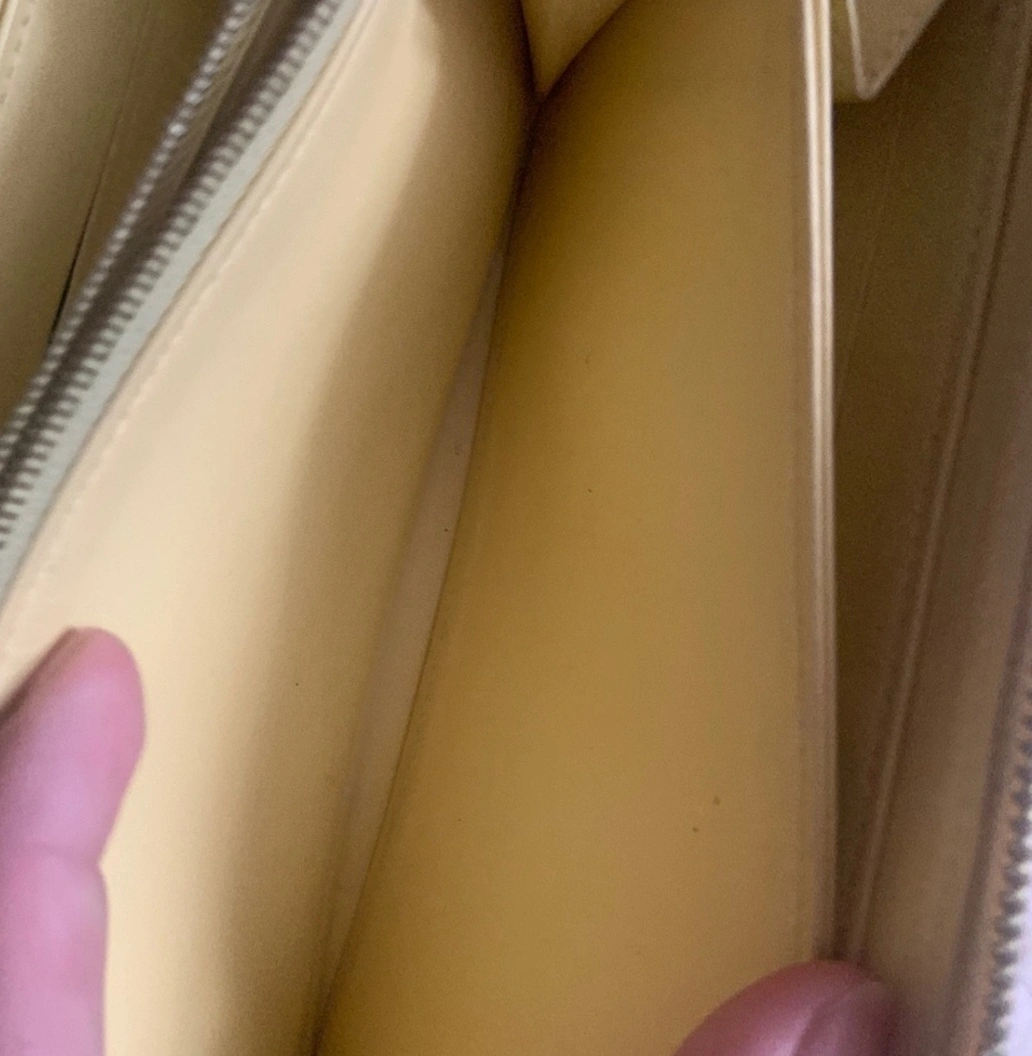 Pre-owned Louis Vuitton wallet. Pale yellow patent leather. Monogram embossed. Gold-toned zipper and hardware. Comes with box and dust bag.