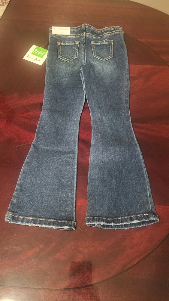 Two NEW pairs of Love Fire jeans for sale! One pair is a light wash - baggy straight leg, and the other is a darker wash - pull on flare leg. Both are size 4 and have a trendy style. Perfect for your little one!