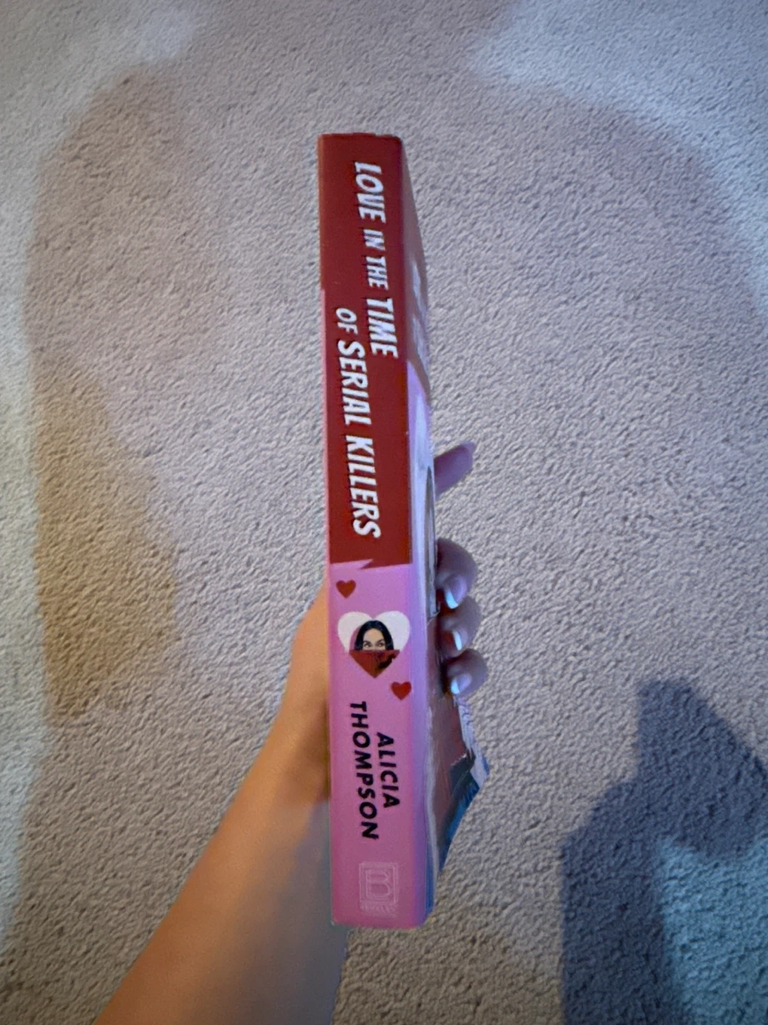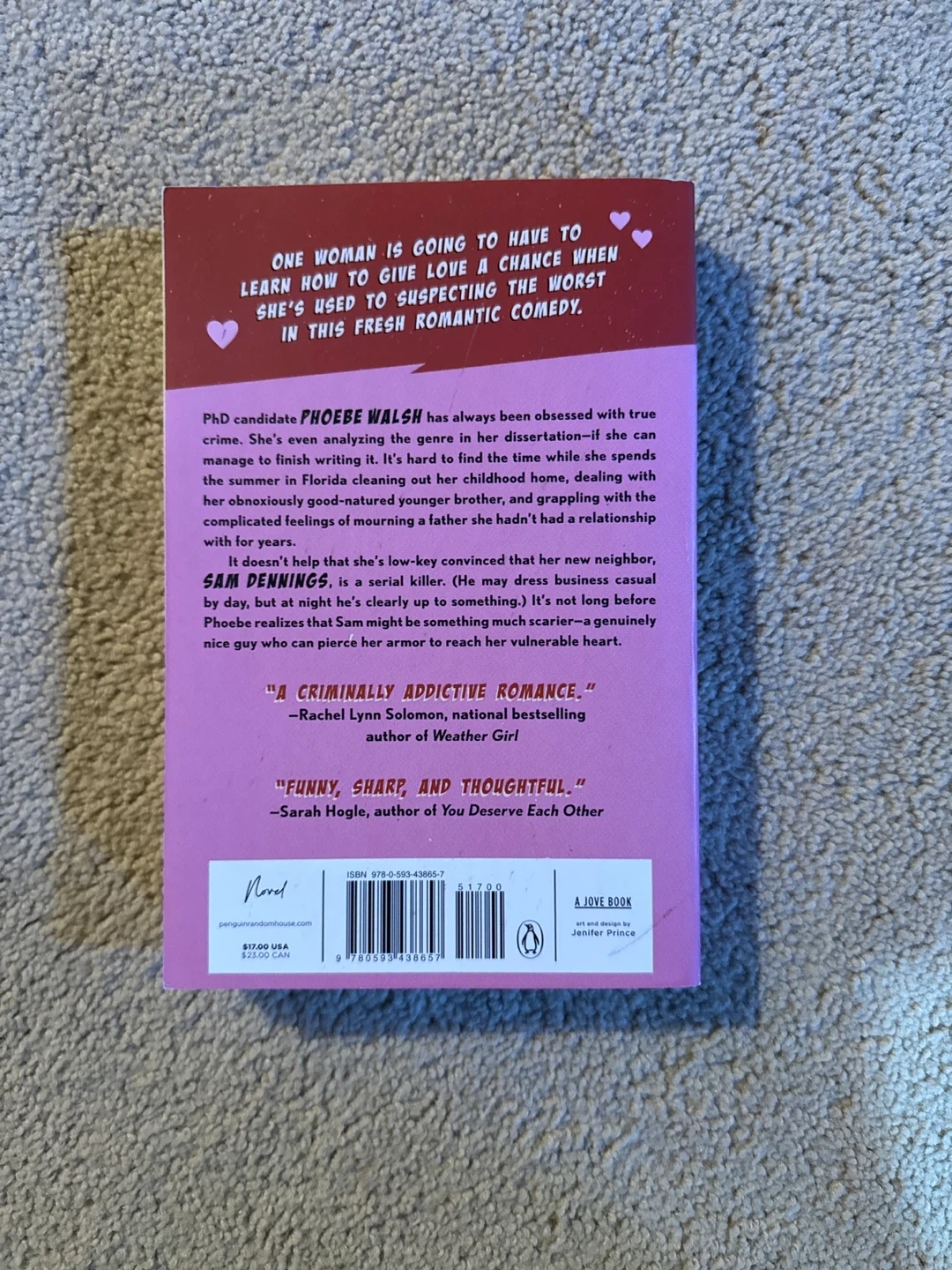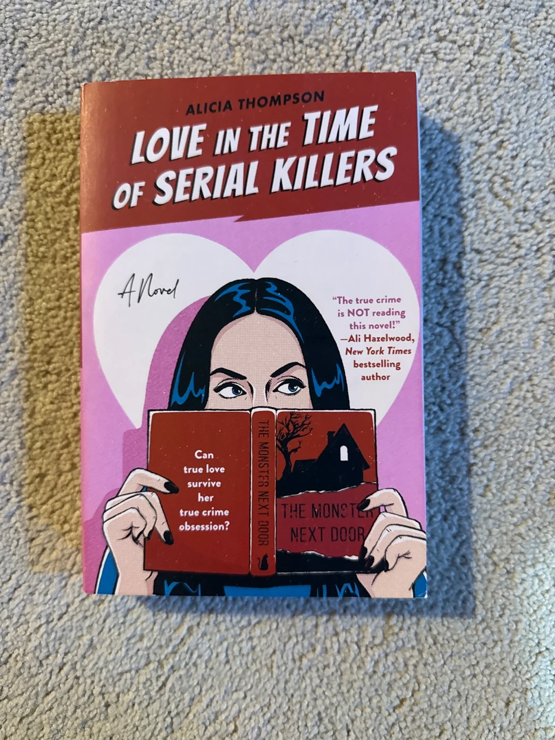 Selling the novel Love in the Time of Serial Killers by Alicia Thompson. It's a novel that follows Phoebe Walsh, who's always been obsessed with true crime. She's even analyzing the genre in her dissertation! The book is a romantic comedy