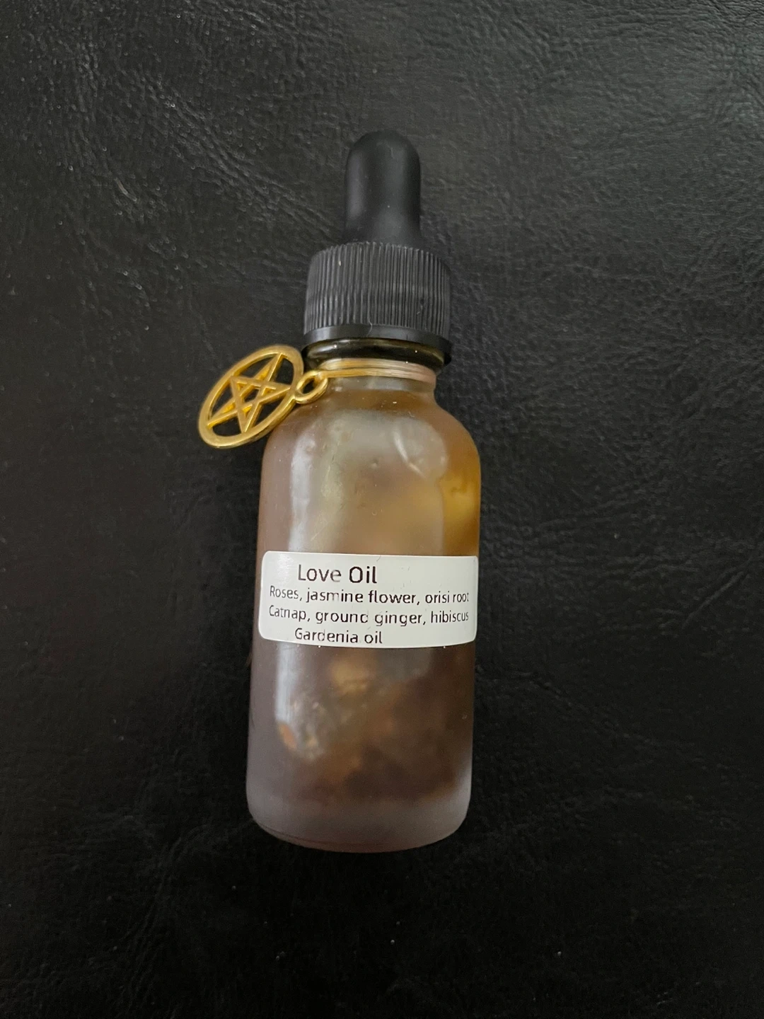 Selling a bottle of Love Oil. It contains roses, jasmine flower, orisi root, catnap, ground ginger, hibiscus, and gardenia oil