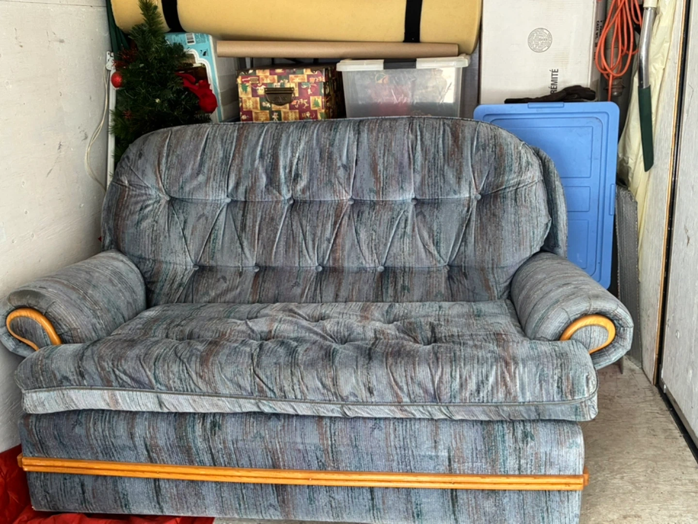 Selling a loveseat sofa. It's in good condition and ready for a new home. The sofa features a blue and grey striped pattern with wooden armrests and base accents. Perfect for a small living space or apartment