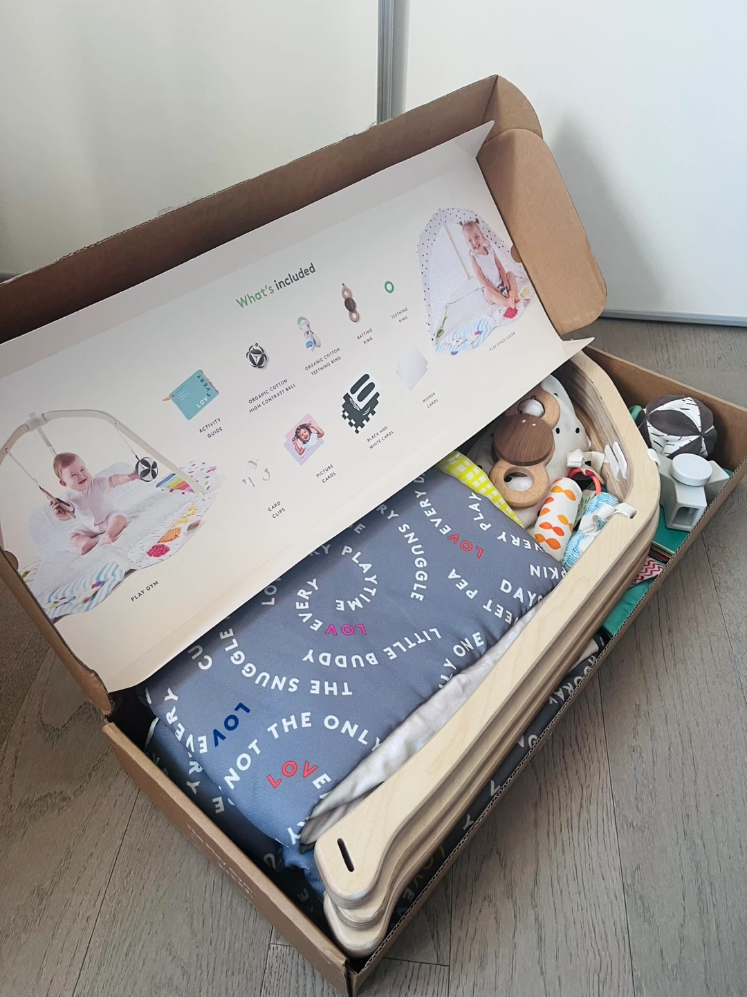 Gently used Lovevery Play Gym in great condition! It comes with all the original accessories and attachments, play guide book, and original box. (original price over $250) Note: picture cards show some wear but there are no tears or damage that affect play. Mat has been washed. From the Lovevery website: - Play Guide with essential stage-based activities and tips to elevate the developmental experience - Grows with your child from day 1 for playtime with purpose - 5 Developmental Zones foster exploration and growth - Includes 5 detachable activity toys and 3 sets of cards - Double-sided Play Space Cover surrounds your baby with a high-contrast pattern and transforms your Play Gym into a cozy play fort for toddlers Dimensions: Play mat zones closed (in): 23.9H x 37.9W x 42.9L Play mat zones open (in): 23.9H x 50W x 47L Materials & care: - The Play Gym is OEKO-TEX® STANDARD 100 certified and tested to be baby safe; materials include real wood, silicone, and cotton - The play mat and Developmental Zones are machine-washable in cold water and on gentle air dry - Wipe down wooden and plastic components with a damp cloth as needed