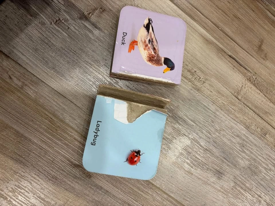 Everything is good except the little book which is ripped into two parts and the cover photo that comes in the box (as shown in the pictures). Baby toy is washable. Pickup near Garcia park, Mississauga (Credit view & Brittania Rd W)