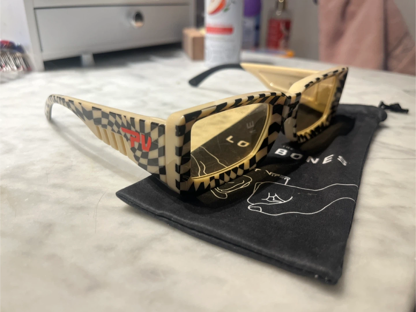 Selling a pair of Low Bones sunglasses with a cool checkered pattern! They come with a black carrying pouch to keep them safe and scratch-free