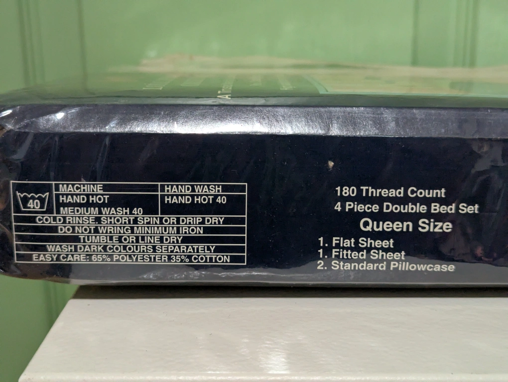 Off-white, queen-sized four piece bed set. Features a flat sheet, fitted sheet, and two standard pillowcases. Made with poly/cotton fabrics. You could have a restful night's sleep in these sheets. Brand new, open to offers.