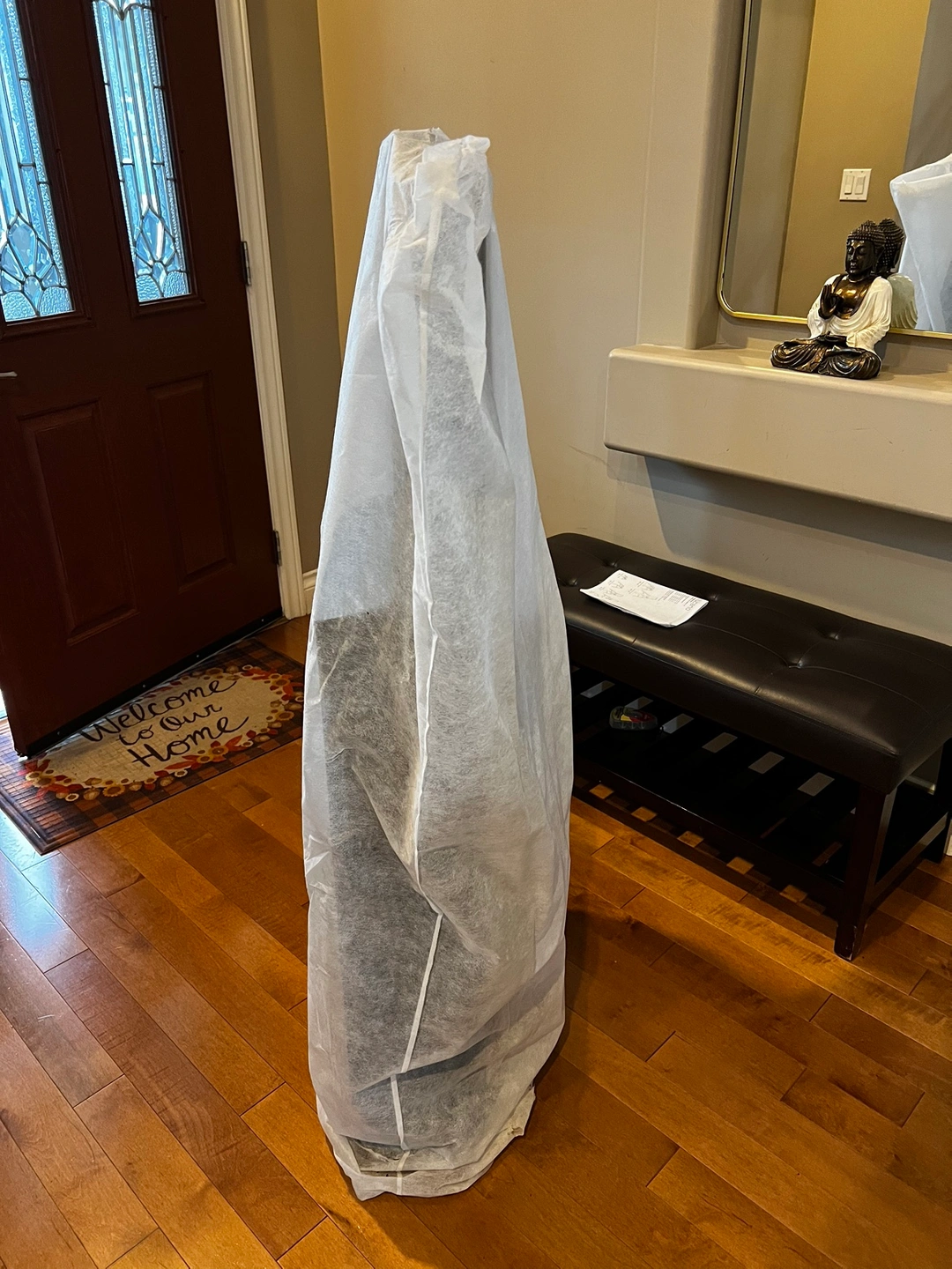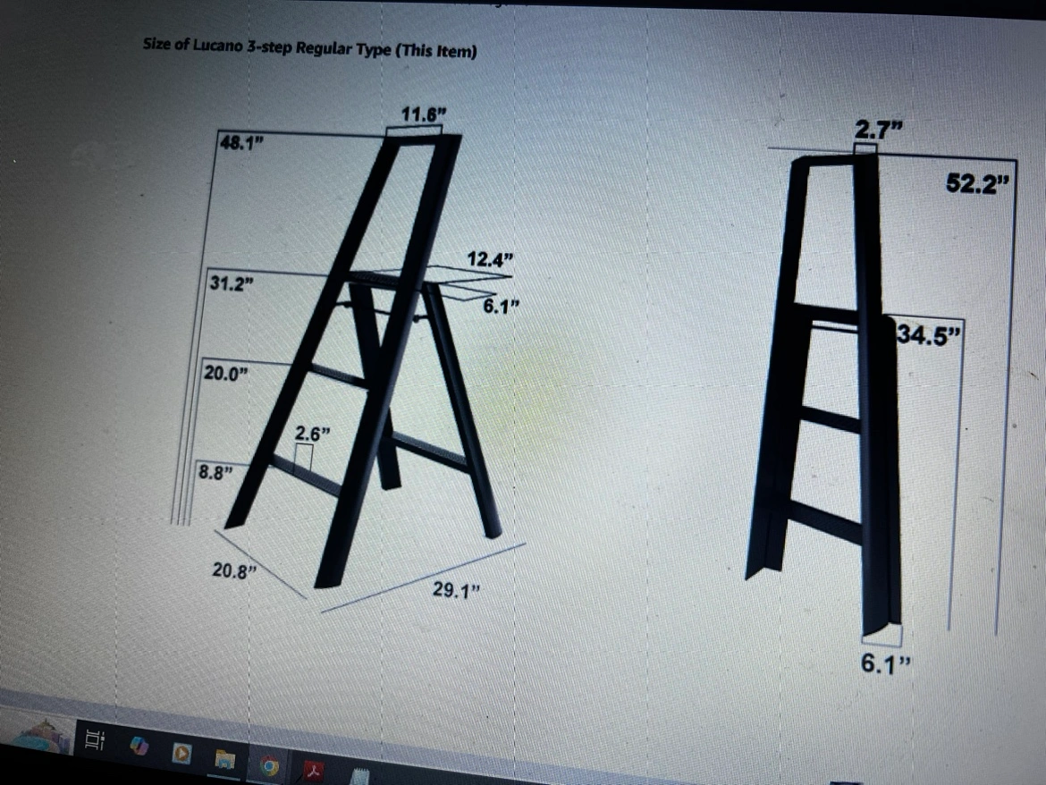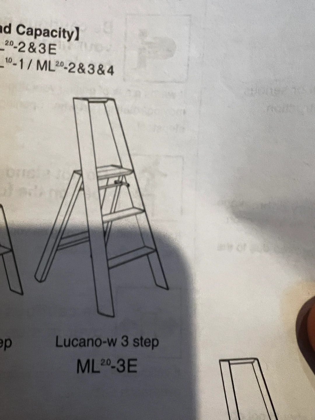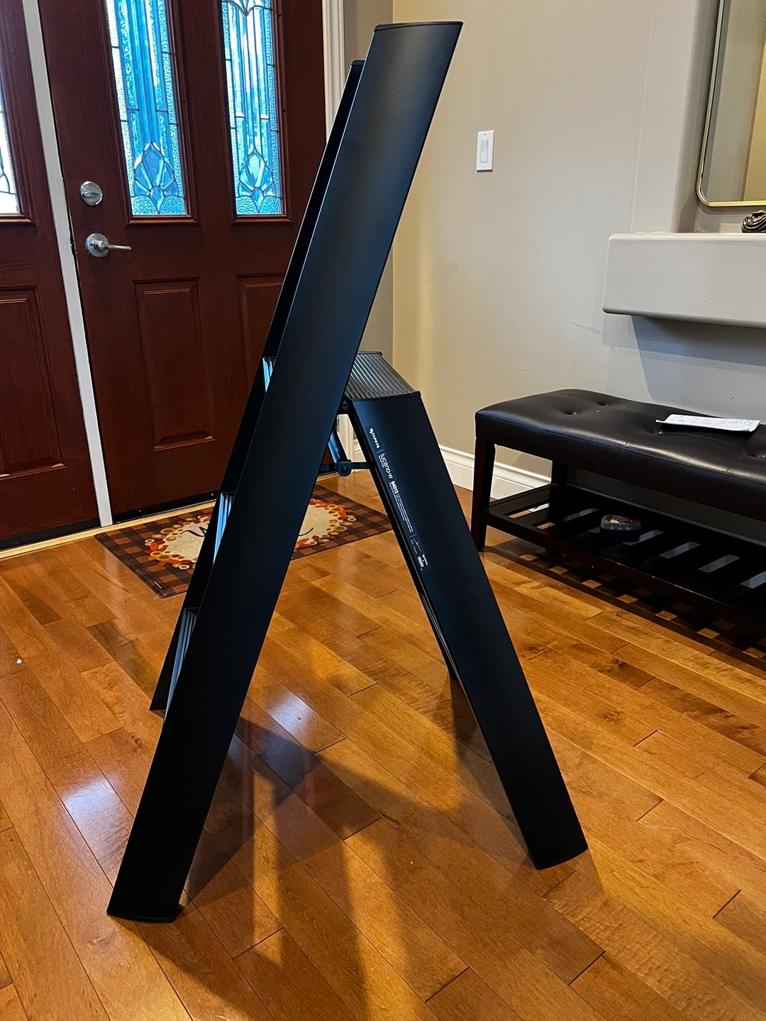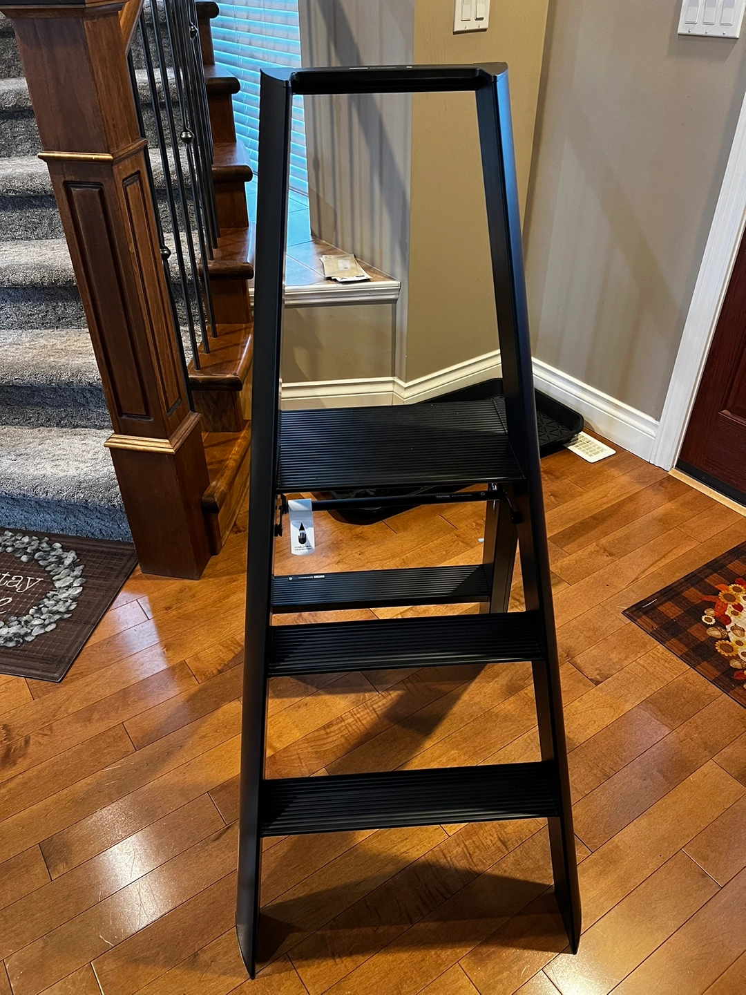 Made of both aluminum and steel make it durable without being heavy. (It only weighs about 10 pounds, but supports up to 300lb.) When folded, the ladder takes up minimal space and stands upright on its own Safety latch Non-skid feet Grooved treads Safety bar Made in Japan *ONLY one small rubber top missing no issues with functionality Pickup 150 and 69 avenue Or Delivery on request
