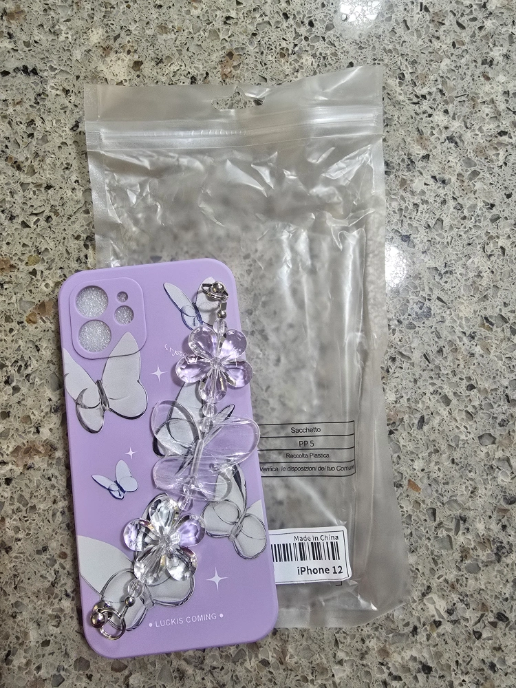This is a cute purple iPhone 12 case from Luckis Coming! It features a butterfly design with clear flower-shaped beads. The case is in new condition and comes in its original packaging