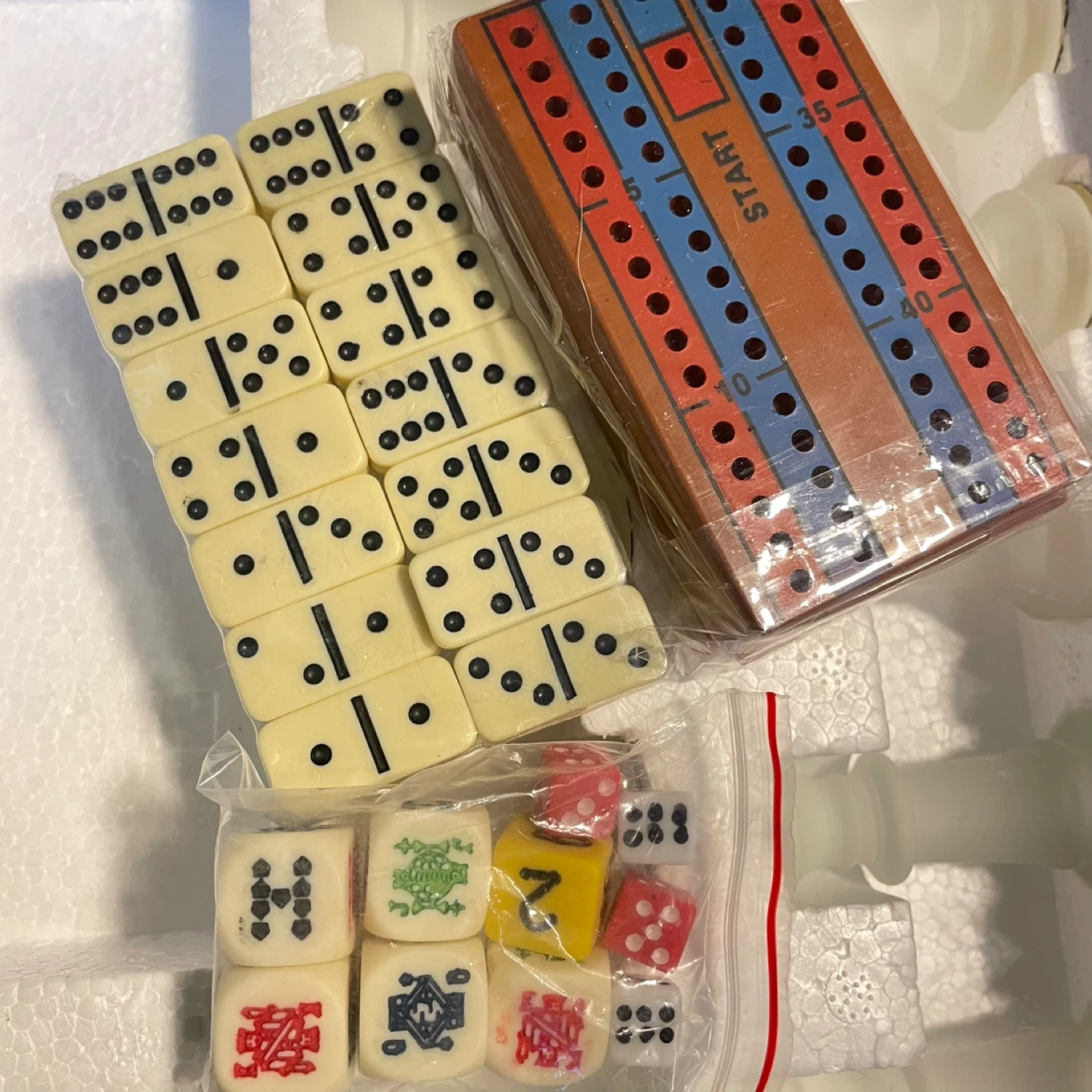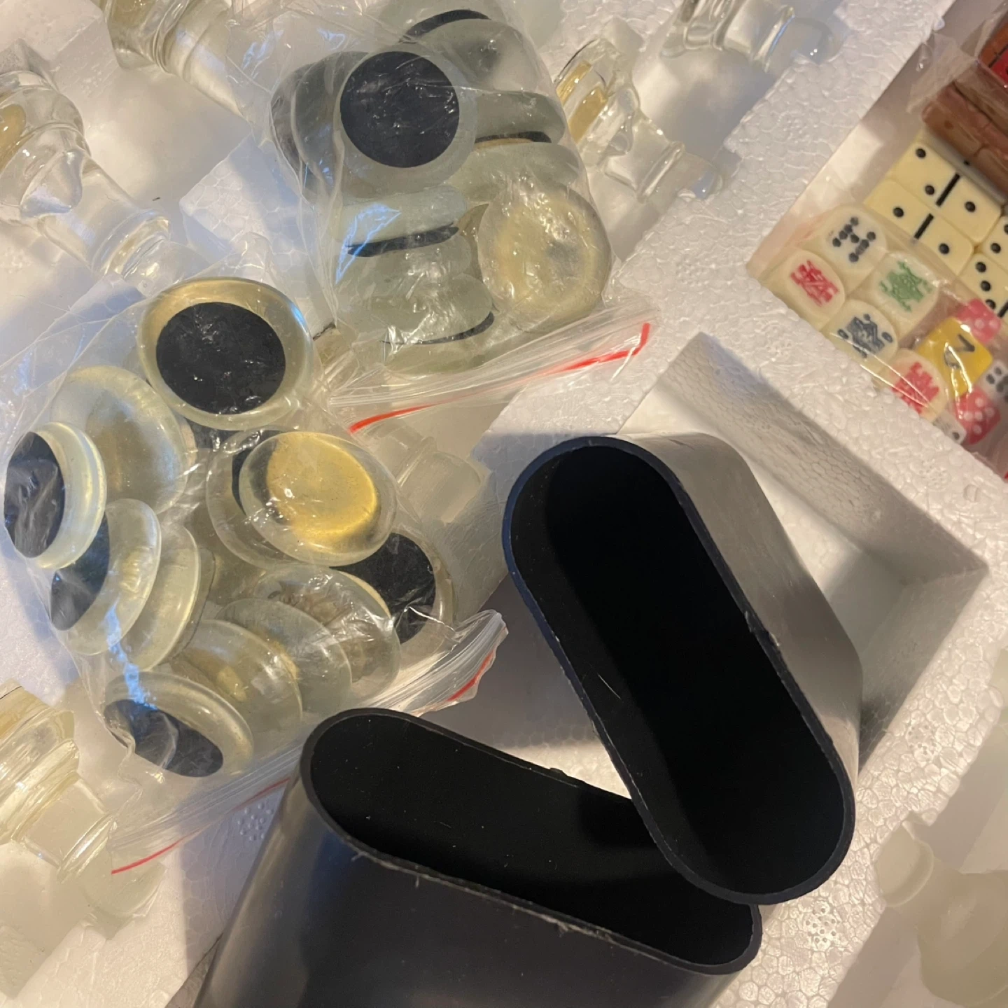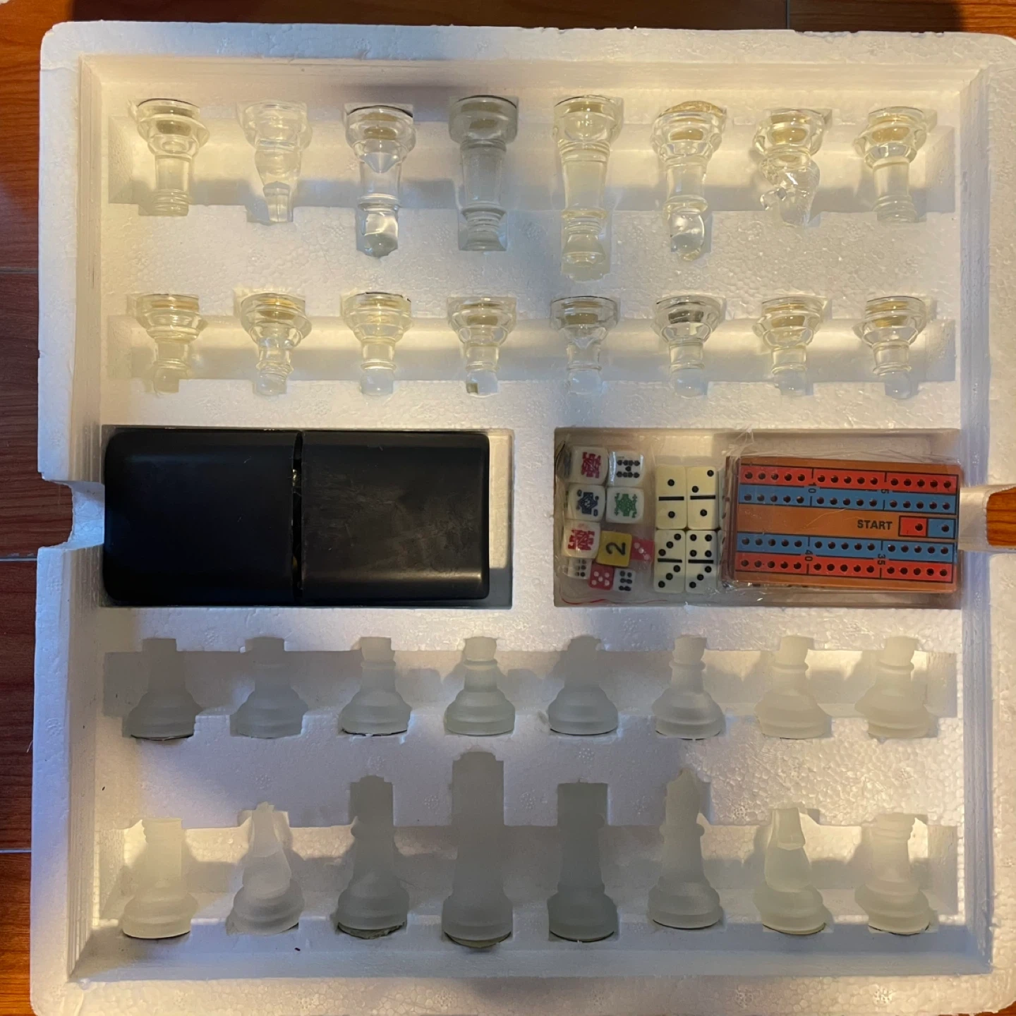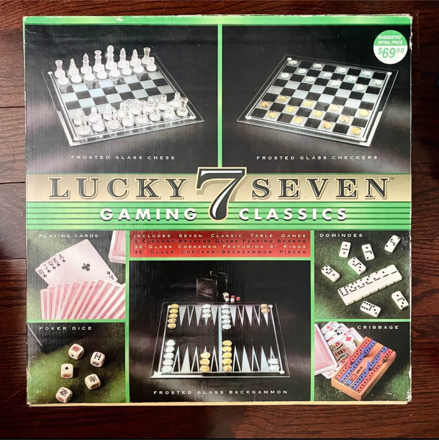 **Pick up at Don Mils & Steeles** With the Lucky 7 Gaming Classics Set you have all the gaming fun you'll ever need in the one box! Two beautifully crafted frosted glass game boards allow for sophisticated games of backgammon, chess and checkers. Completing this set is a deck of playing cards, dominoes, cribbage and poker dice.. this set has everything! 7 in 1 gaming set includes: Frosted glass chess. Frosted glass checkers. Frosted glass backgammon set. Dominoes. Poker dice. Cribbage. NOTE: Only the deck of playing cards is missing (pls see photos). You can easily replace it with one from a dollar store. Beautifully crafted frosted glass boards with padded feet and contrasting glass game pieces. So many great games in the one box. A must have for every household - have friends over for poker or games nights! Chess has seen a huge revival in recent years thanks to shows like The Queen’s Gambit — making this a timeless and stylish addition to any home. Vintage boxed game set. Includes frosted glass chess, checkers, backgammon, dominoes, cribbage, poker dice and playing cards. Seven classic table games