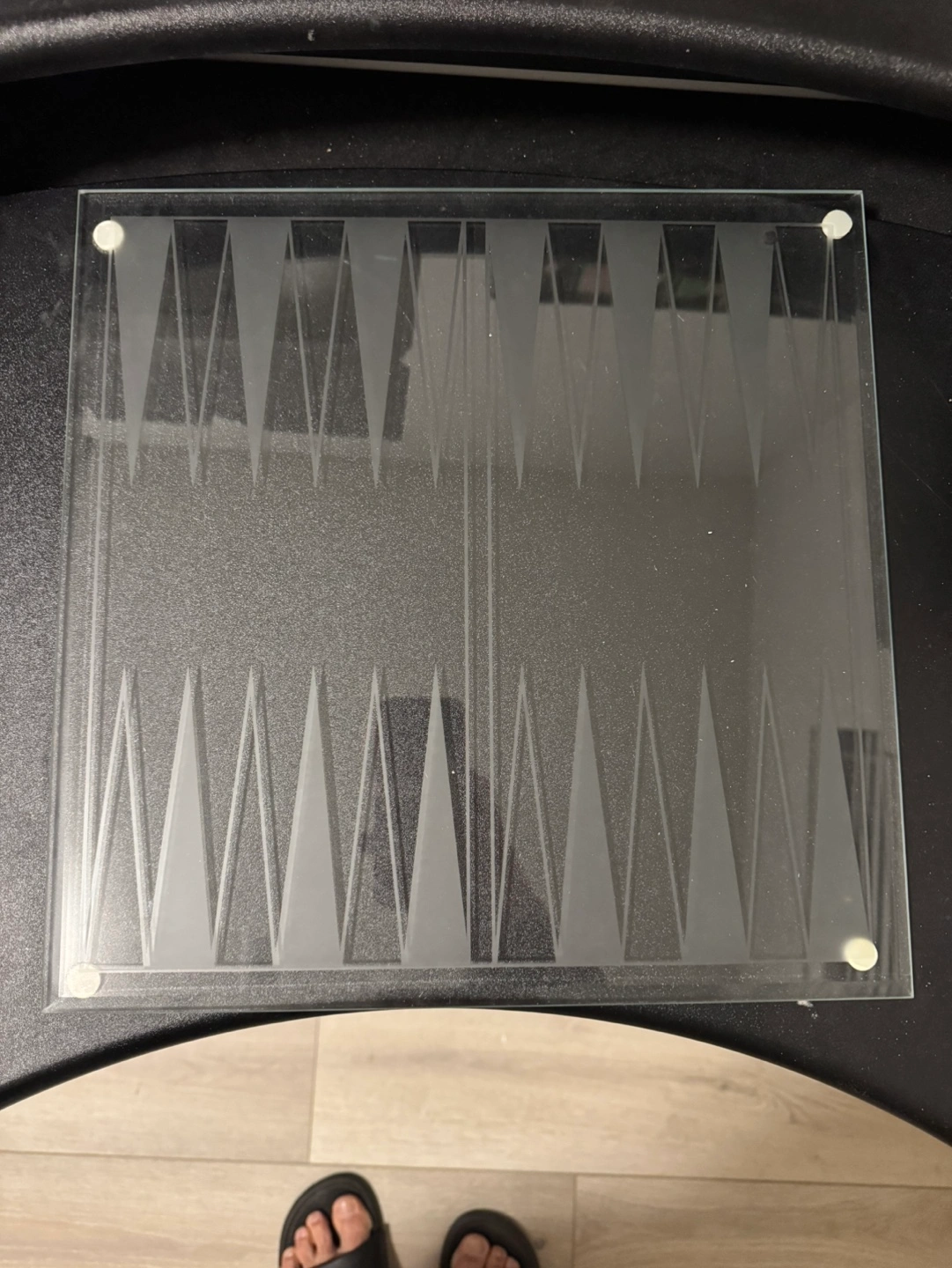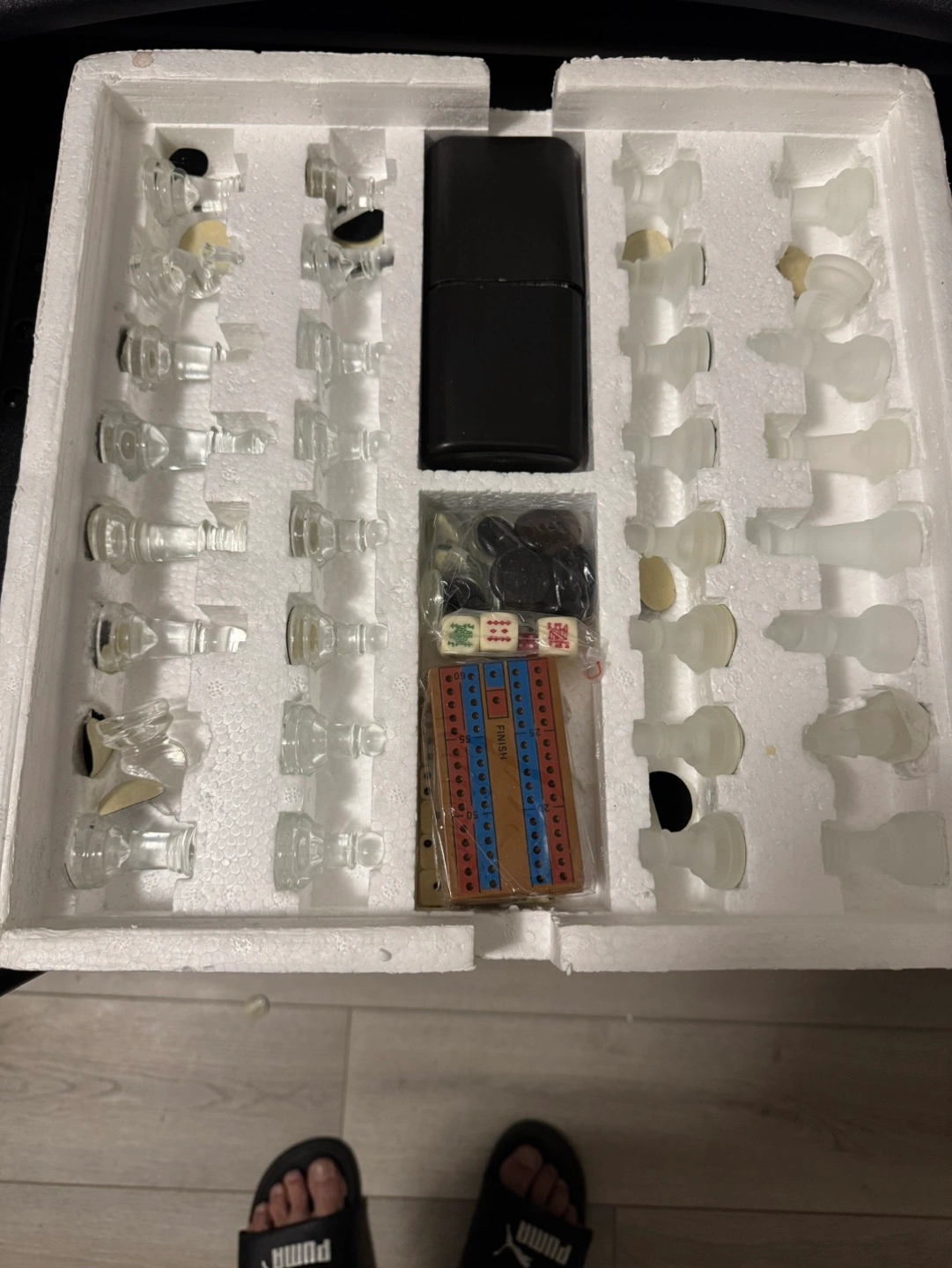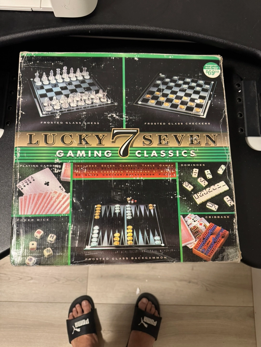 7 games in 1 box comes with Frosted glass backgammon and chess game board, comes with pieces. Chess Checkers Backgammon Cribbage Cards Poker dice Dominoes All in good condition, no chips or cracks.
