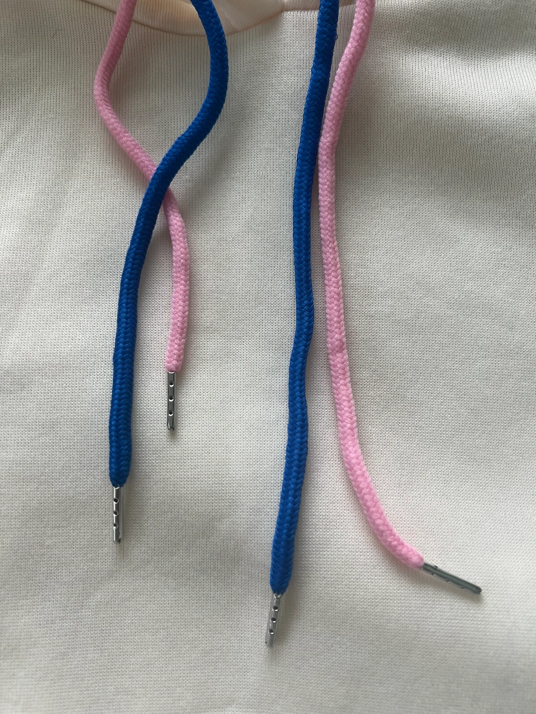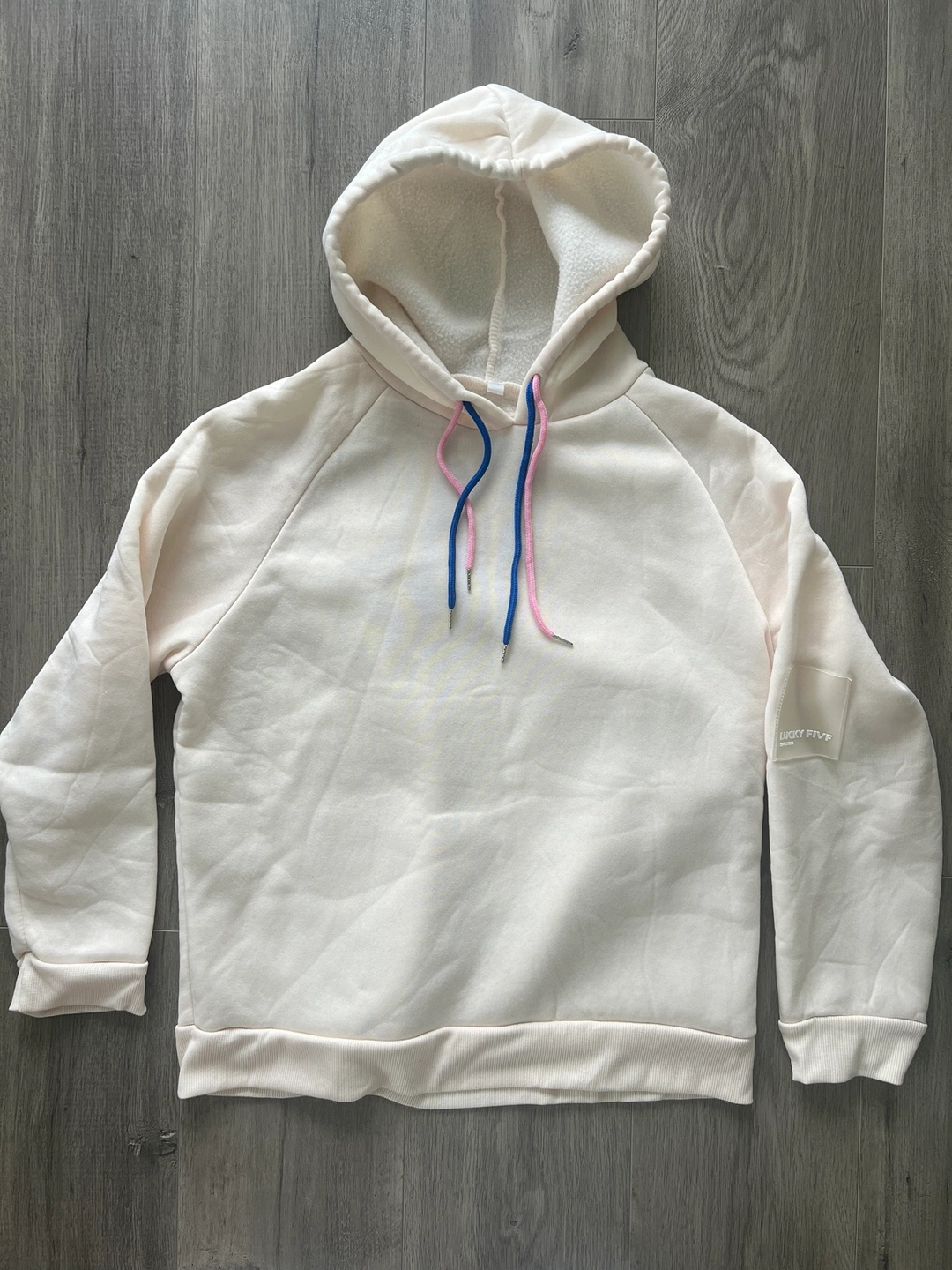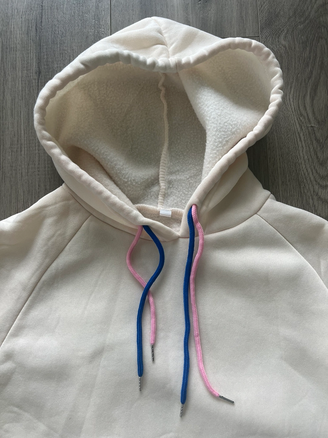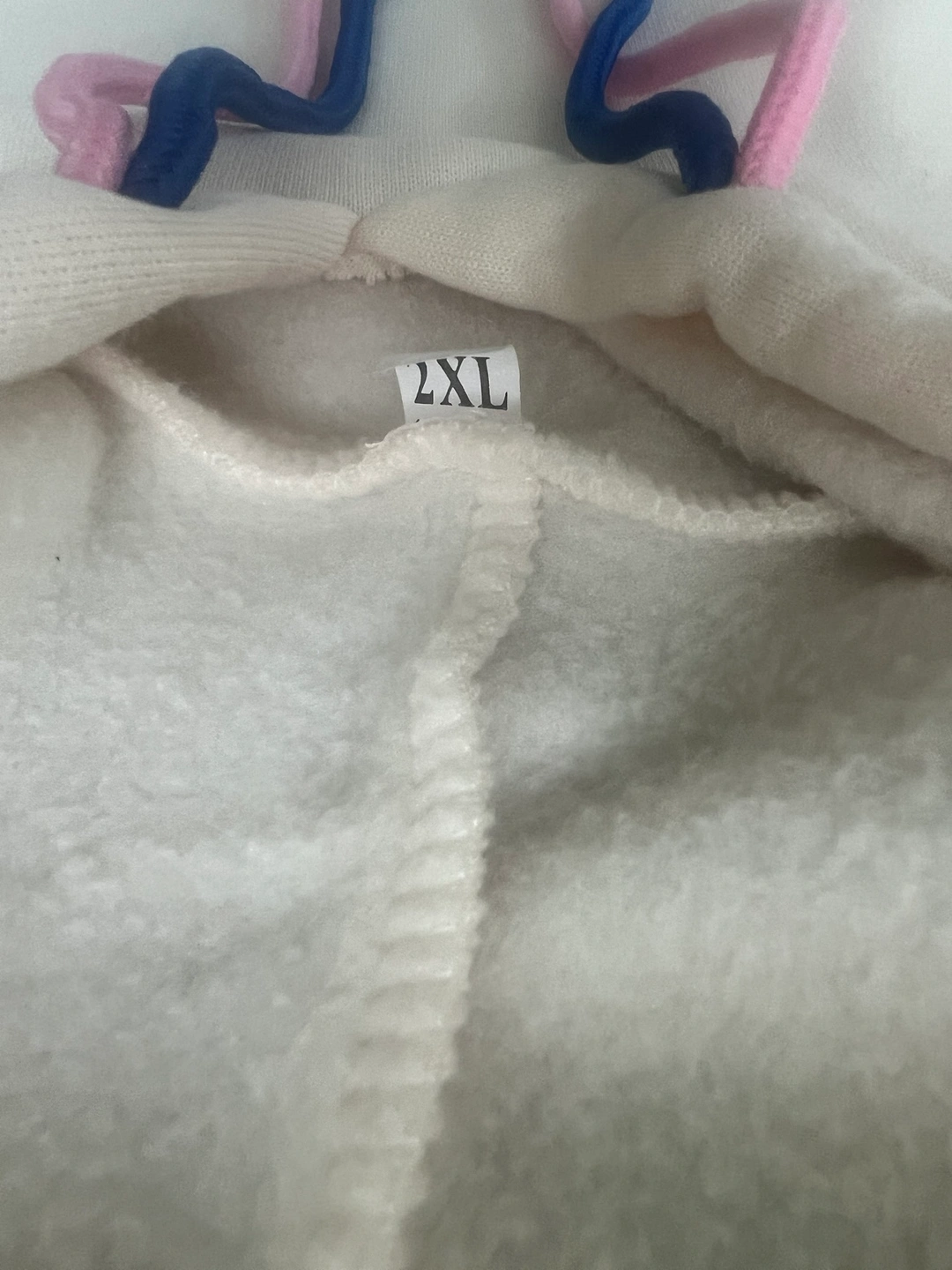 A cream coloured hoodie with blue and pink drawstrings. Size 2XL