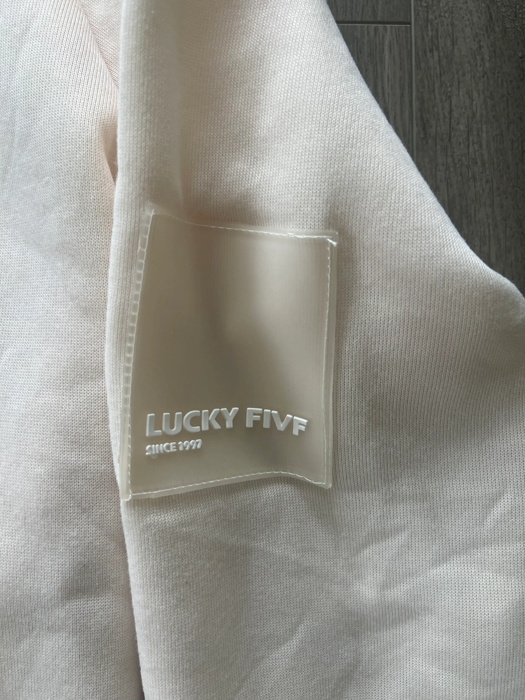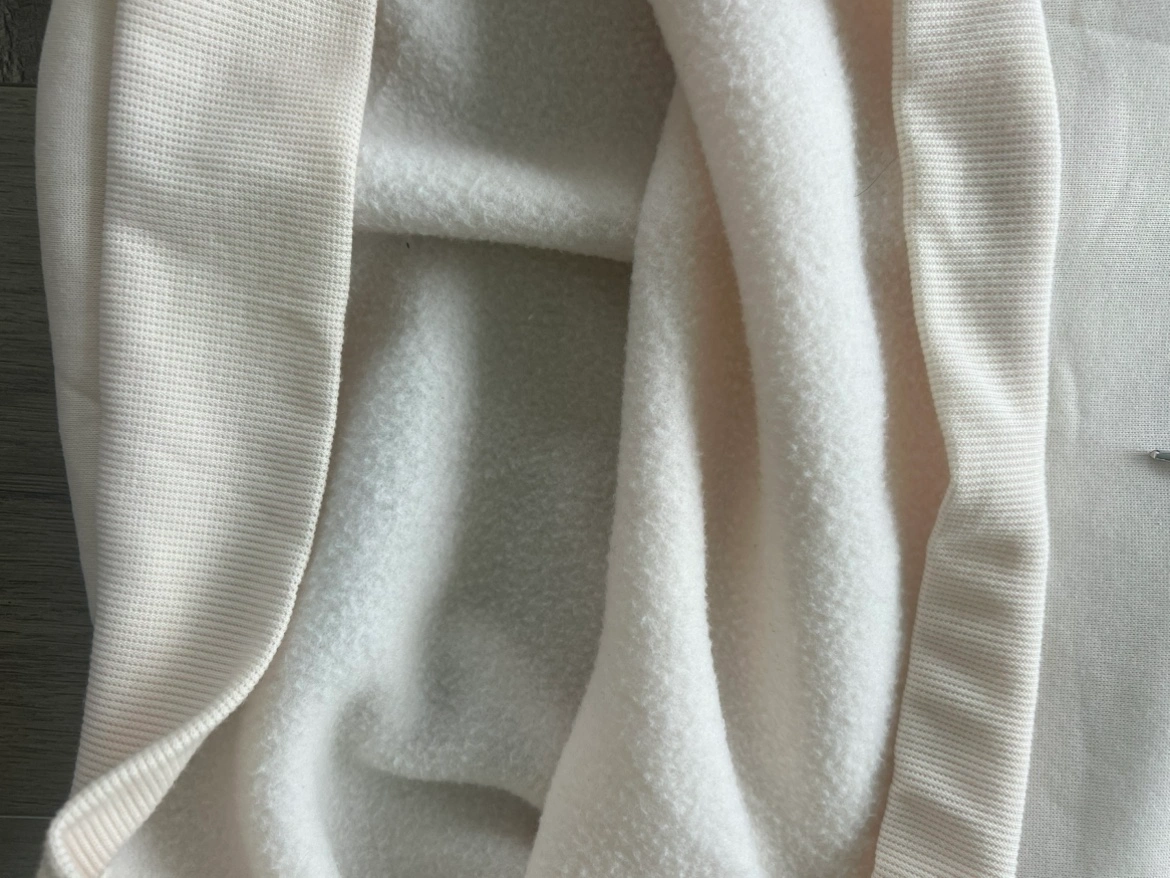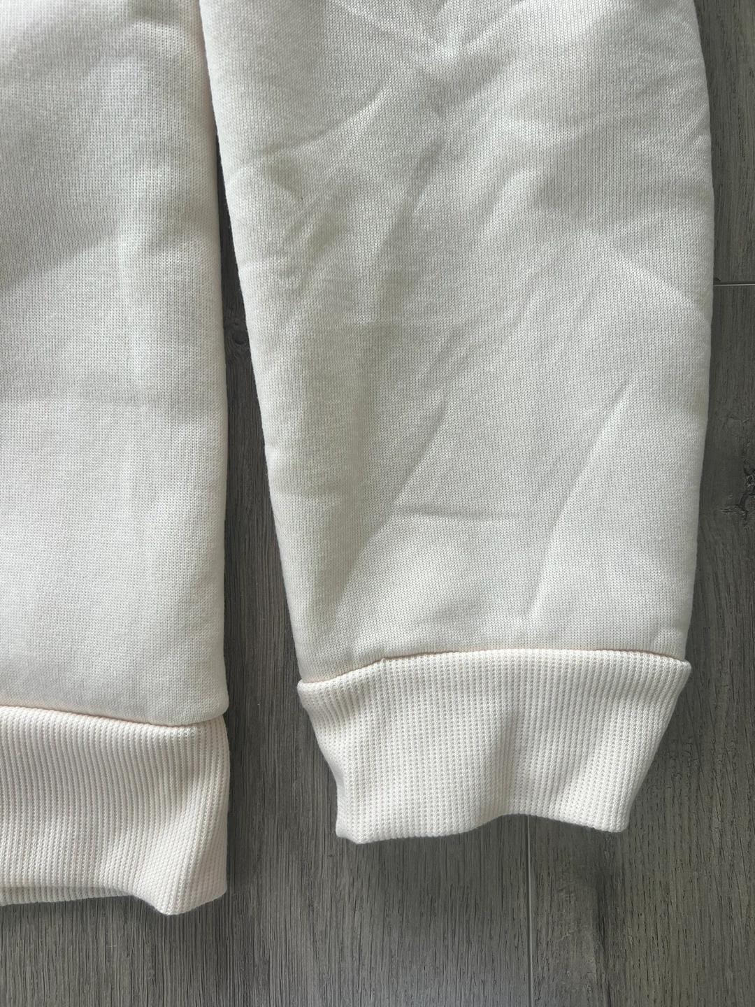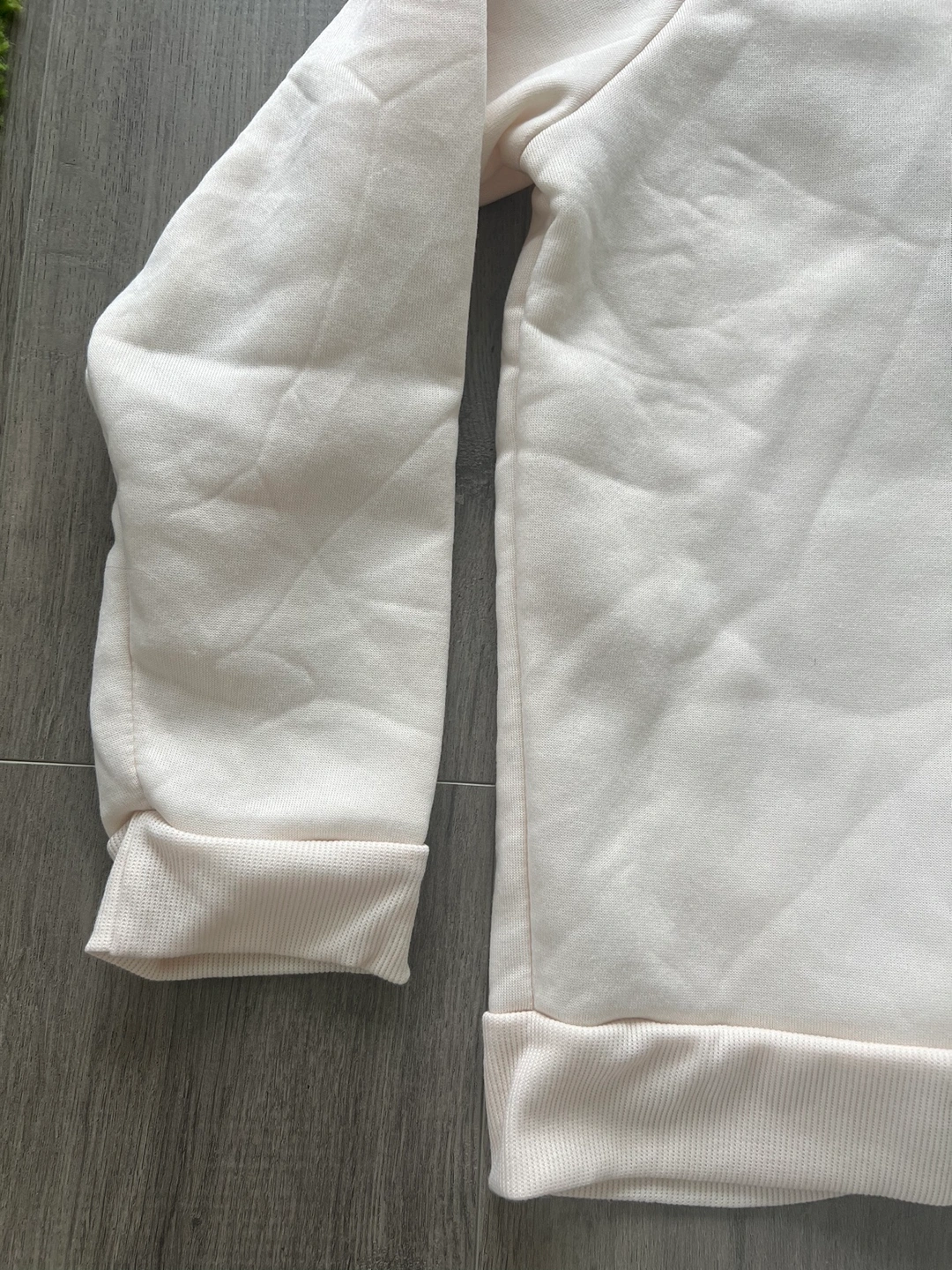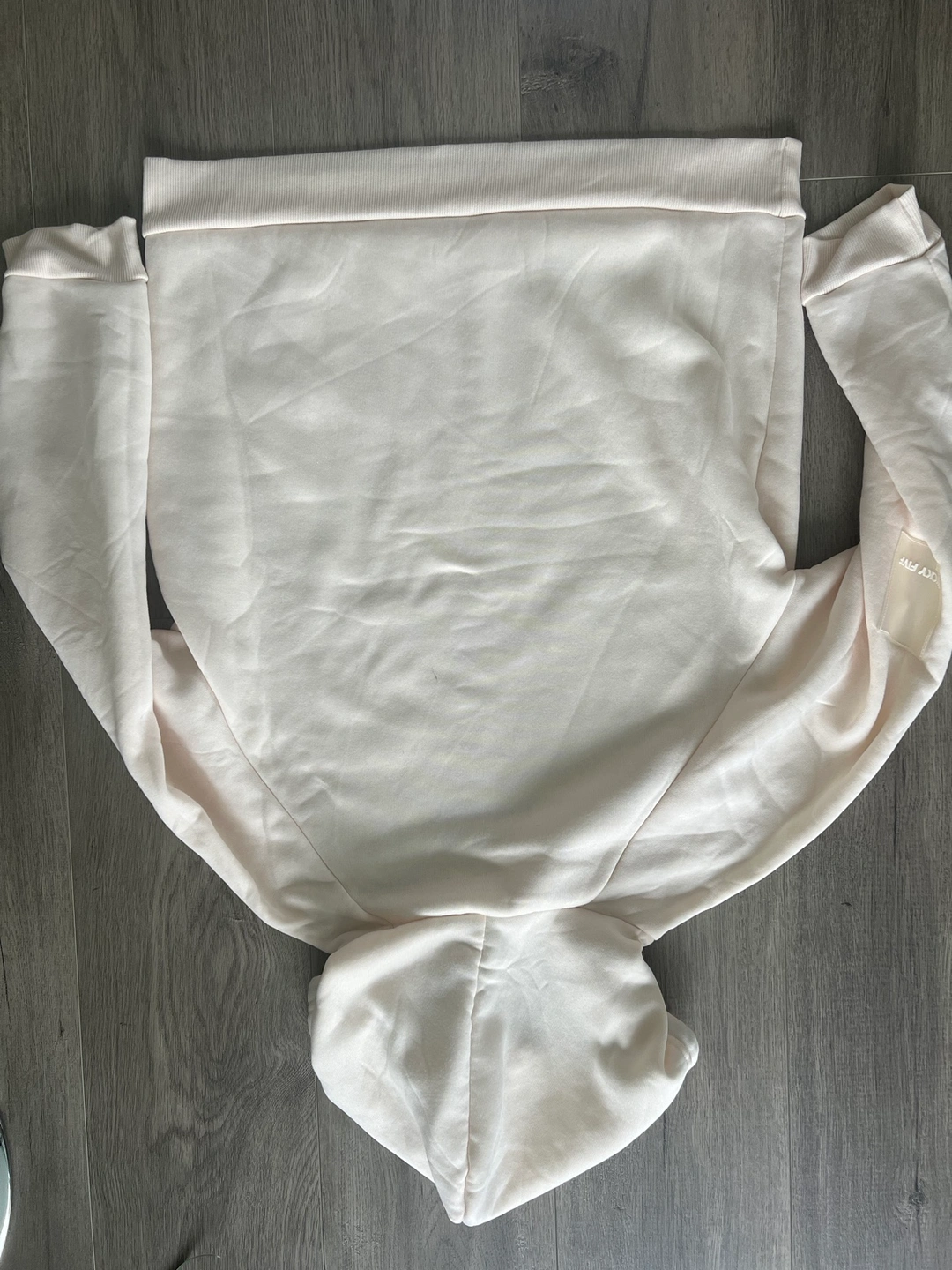 A cream coloured hoodie with blue and pink drawstrings. Size 2XL