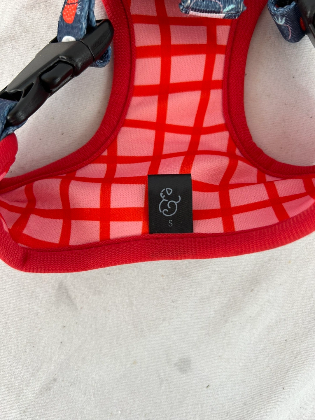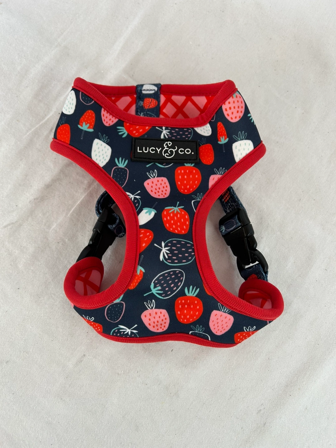 Adorable dog harness. Small size. Features a fun strawberry print. Red and navy blue colours. Neoprene material. Adjustable straps.