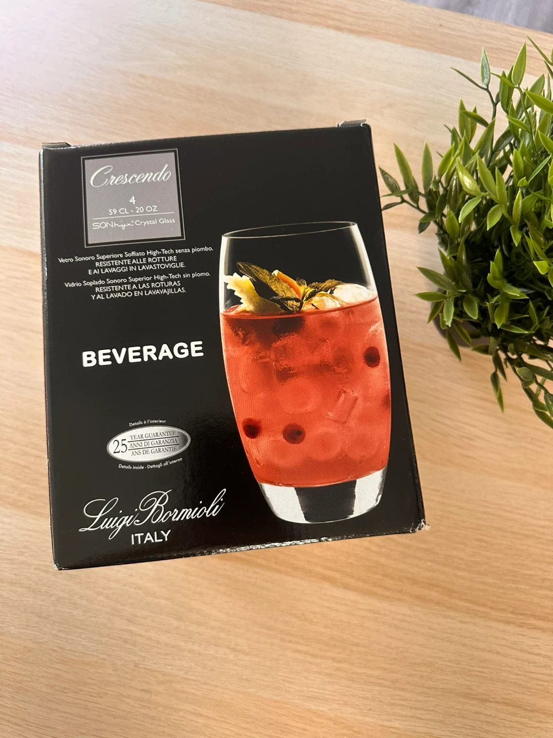 Selling a set of 4 Luigi Bormioli Crescendo beverage glasses! They're 20 oz (59 cl) each and made of SON.hyx crystal glass. Comes in the original box, so they're perfect for gifting or just upgrading your glassware collection