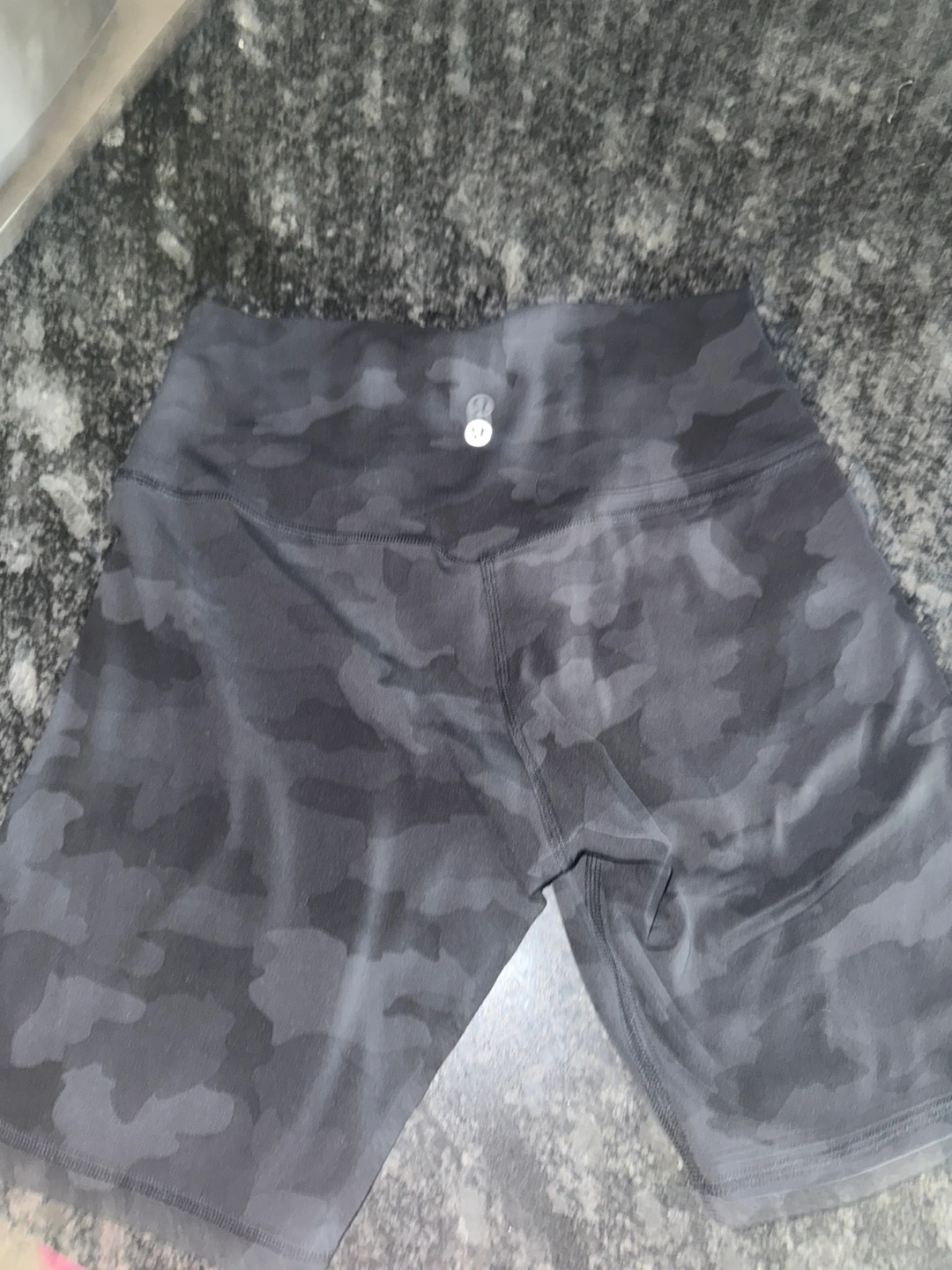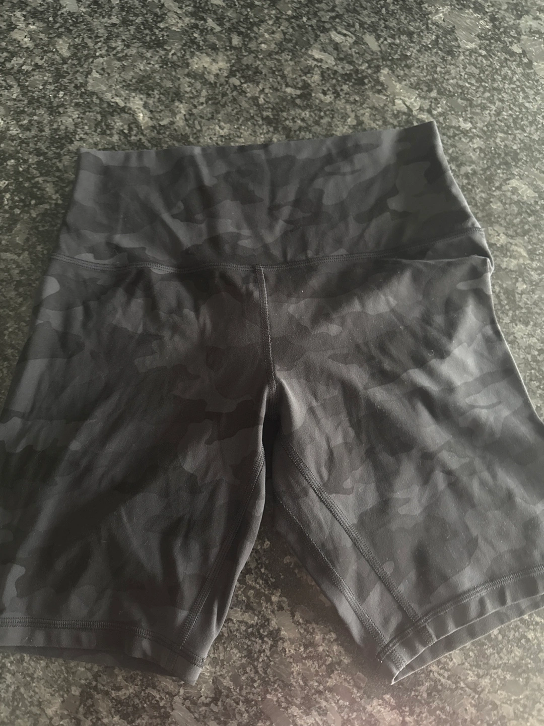 Selling a pair of Lululemon Align biker shorts in a cool camo pattern! These are a size small and made with a comfy blend of 80% nylon and 20% Lycra