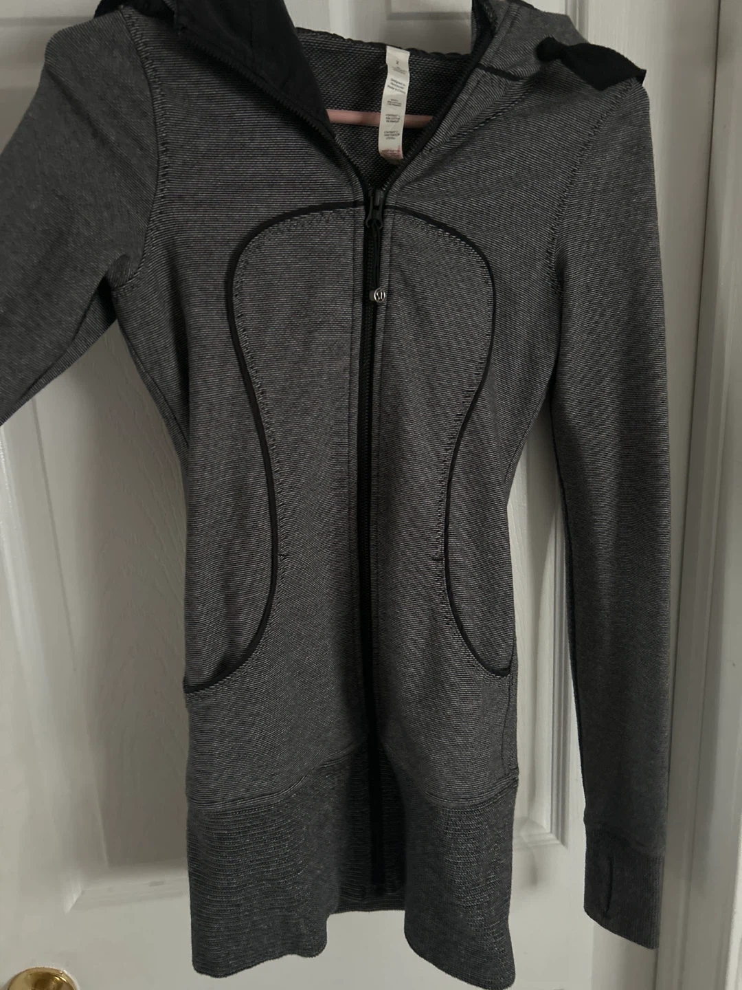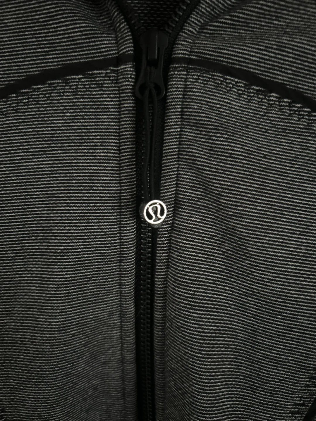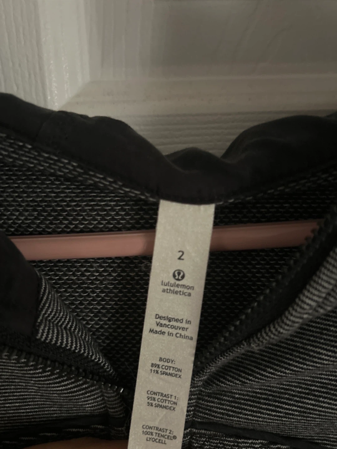 Selling a Lululemon Athletica hoodie in a stylish grey striped pattern! It's a size 2 and made with comfy materials: 89% cotton and 11% spandex for the body, and a contrast of cotton and spandex as well