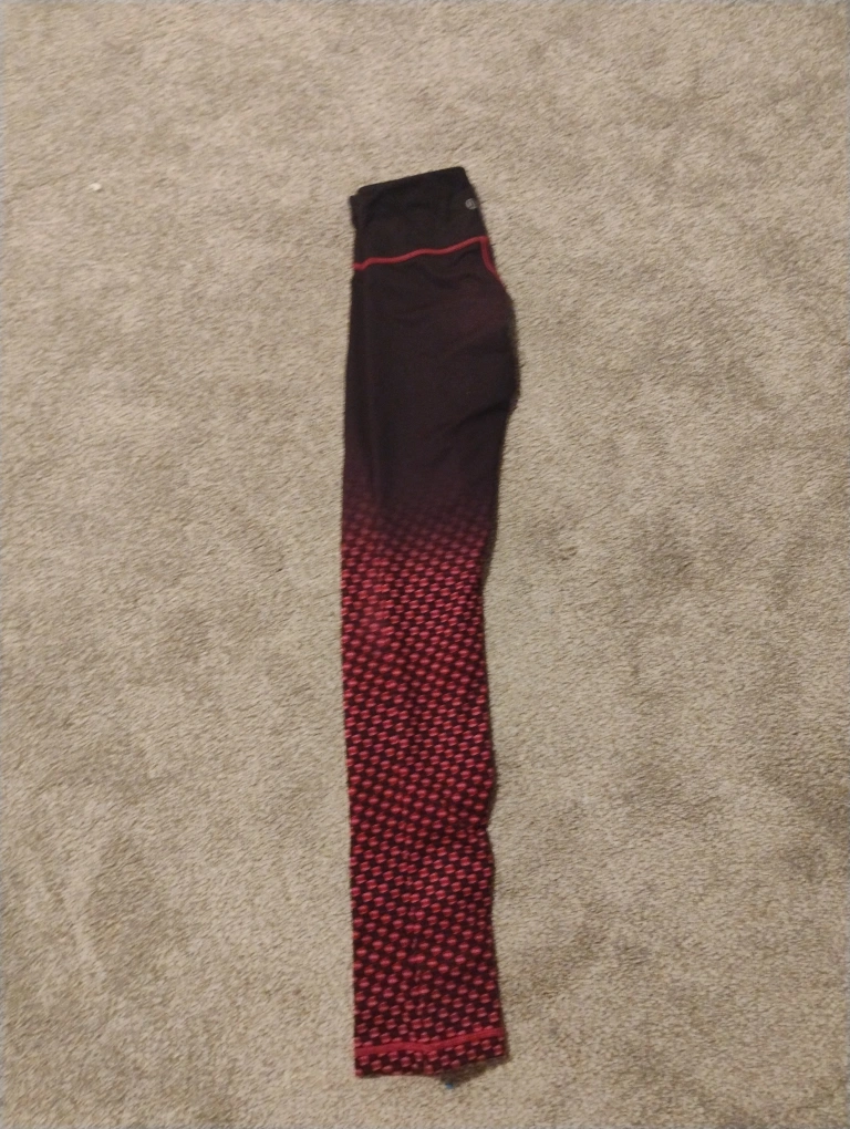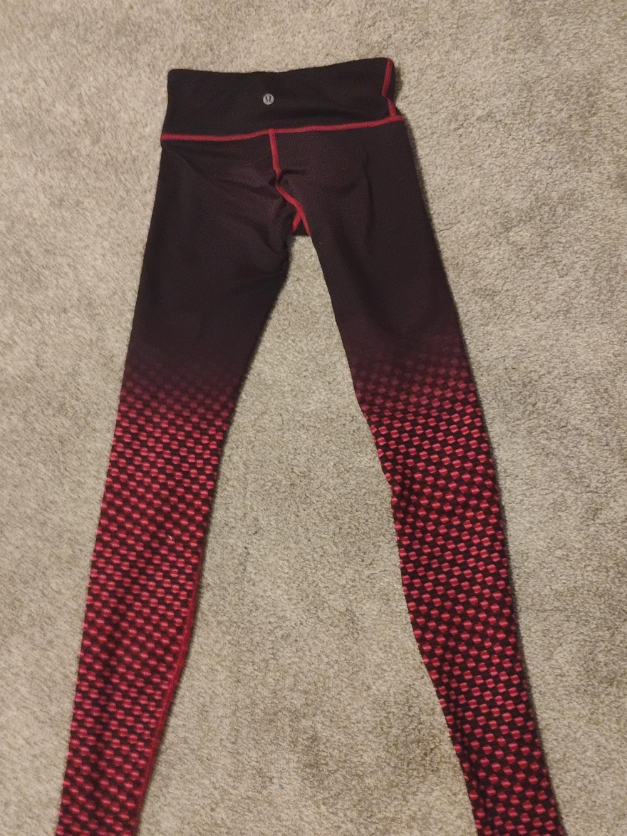 Selling a pair of Lululemon leggings in a black and red ombre pattern. They're in great condition and ready for a new home! Perfect for yoga, running, or just lounging around
