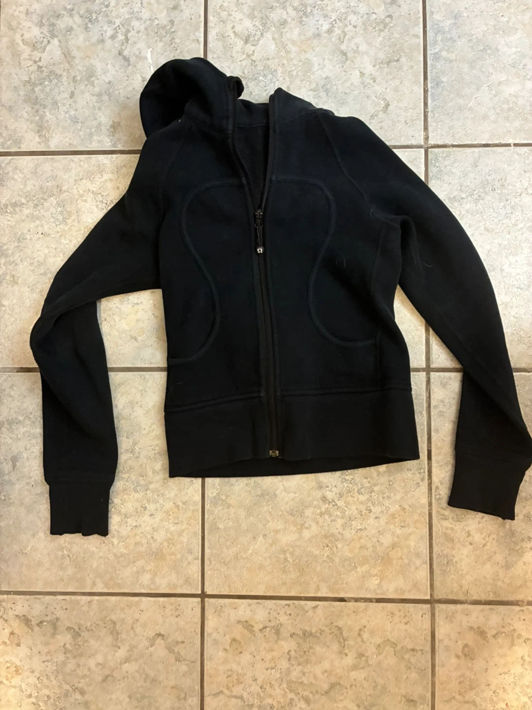 Selling a Lululemon black Scuba hoodie. It's in great condition and perfect for layering or wearing on its own. This hoodie is a comfortable and stylish addition to any wardrobe xs size 0 fit 7 to 11 year old or very small adult