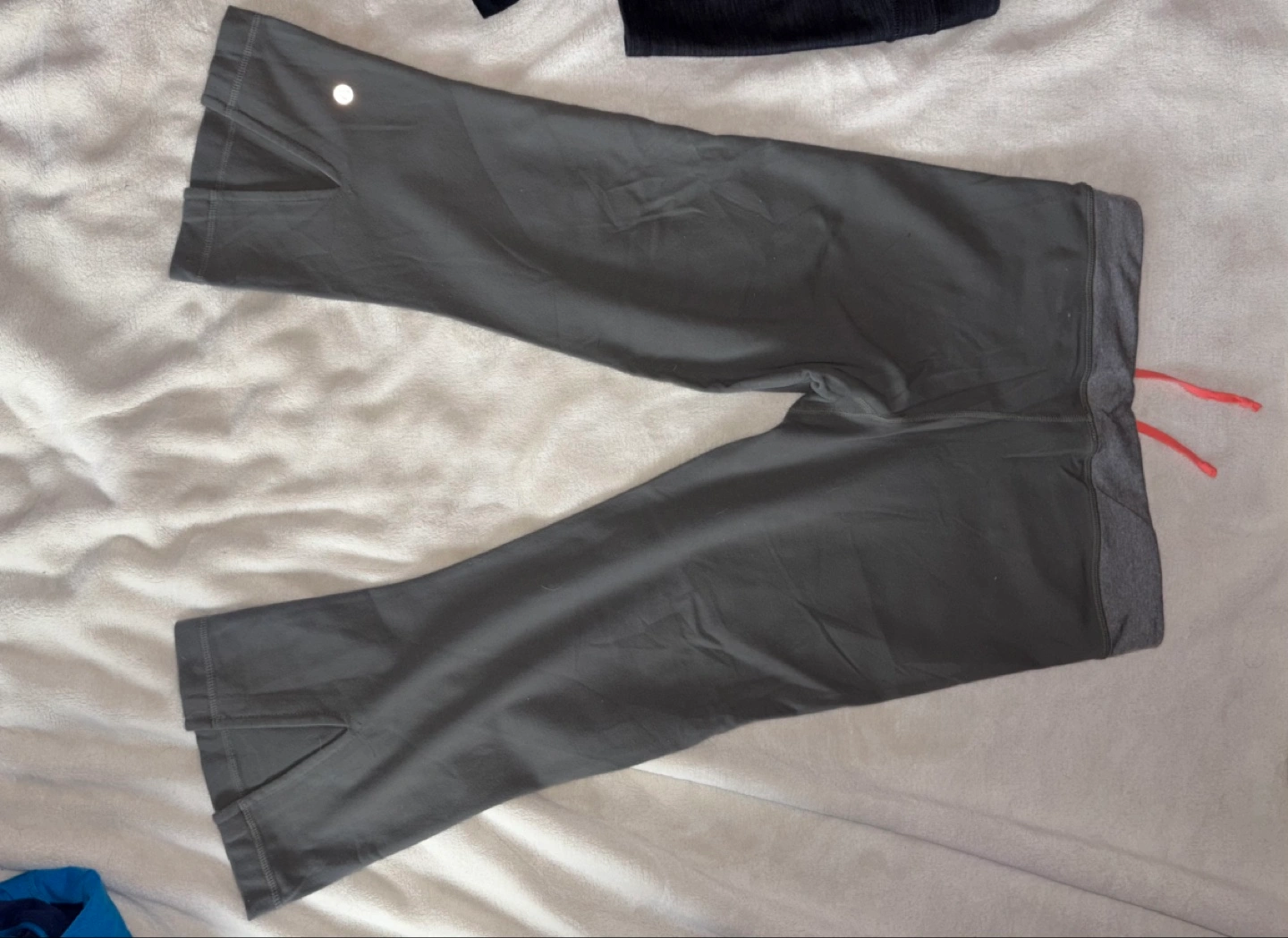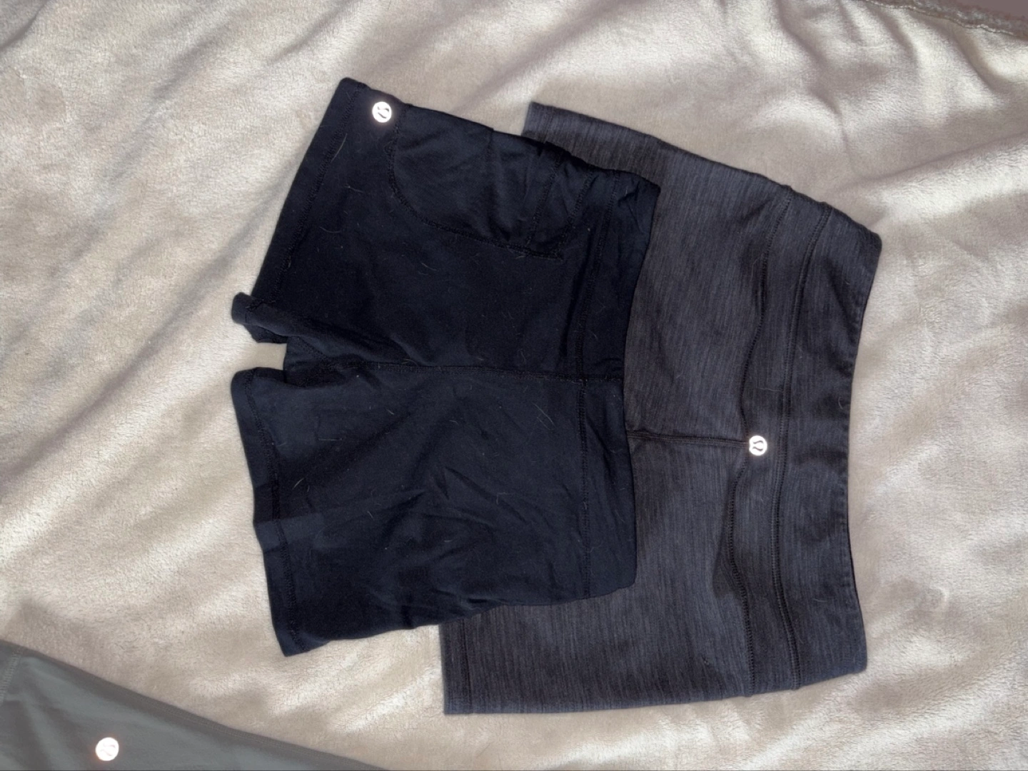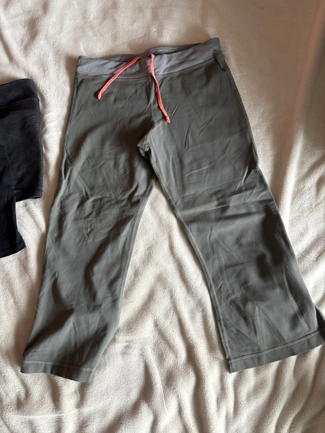 Lululemon bundle includes grey cropped workout pants, full-length wide leg pants, and 2 pairs of shorts. Size 4. Very good used condition from smoke free pet friendly home.