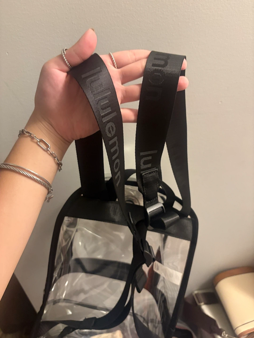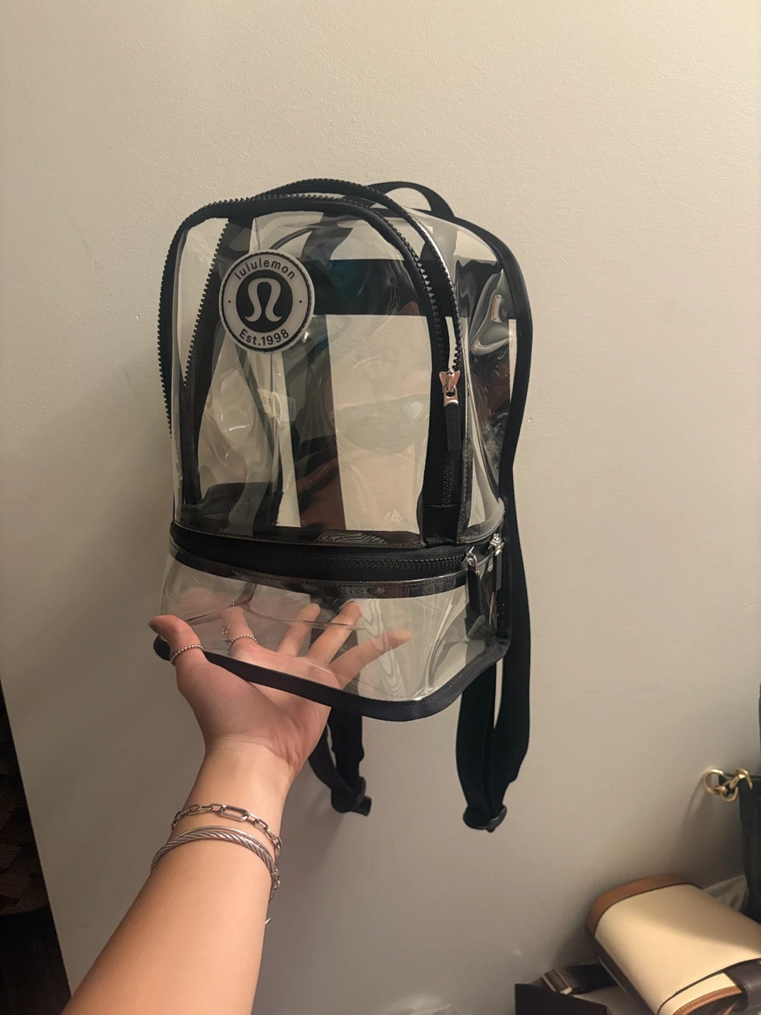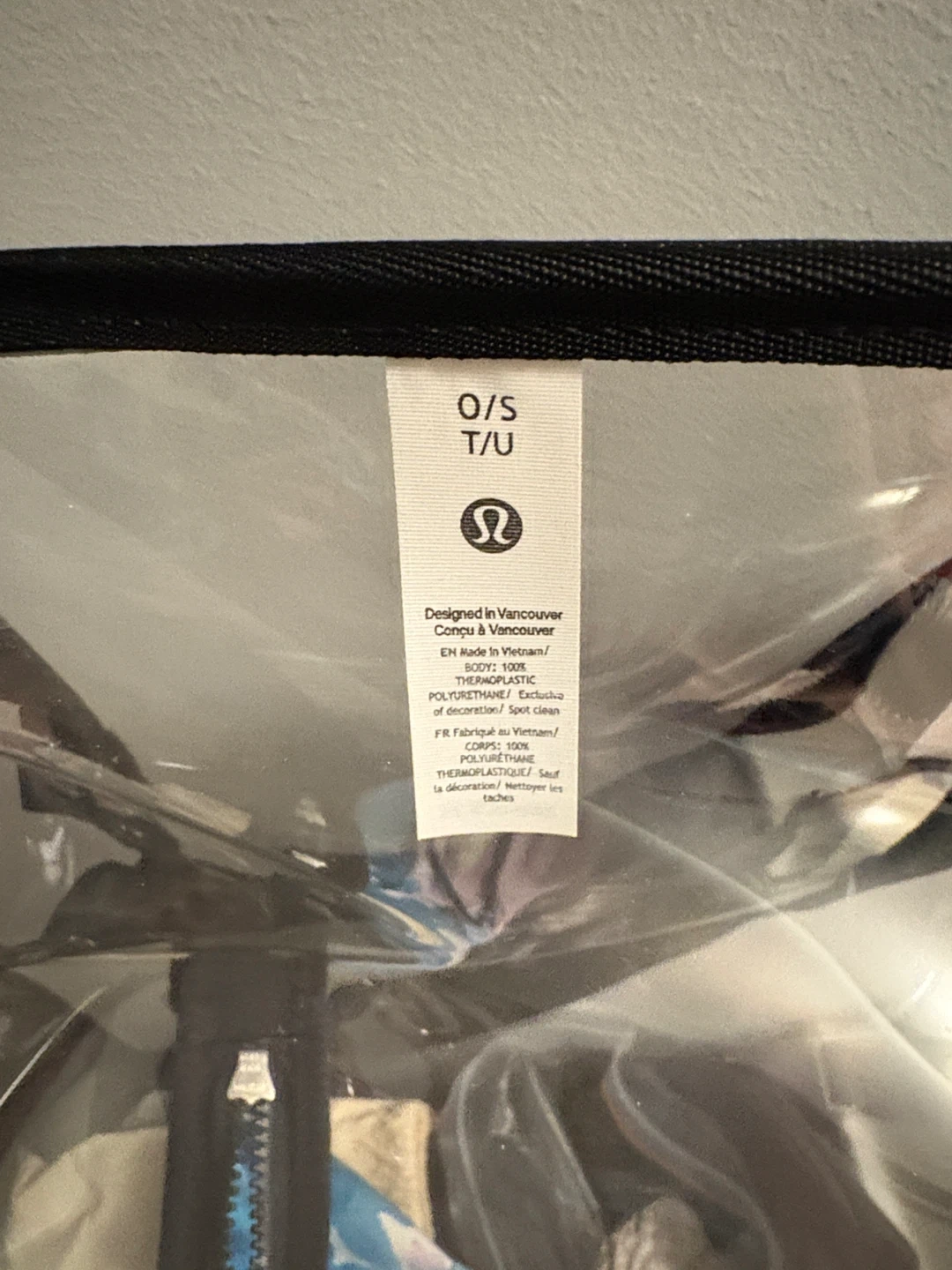 Selling a Lululemon clear backpack in one size. It's perfect for carrying your essentials while keeping things visible. The backpack is made of durable thermoplastic polyurethane and features black straps with the Lululemon logo. Great for school, work, or travel!