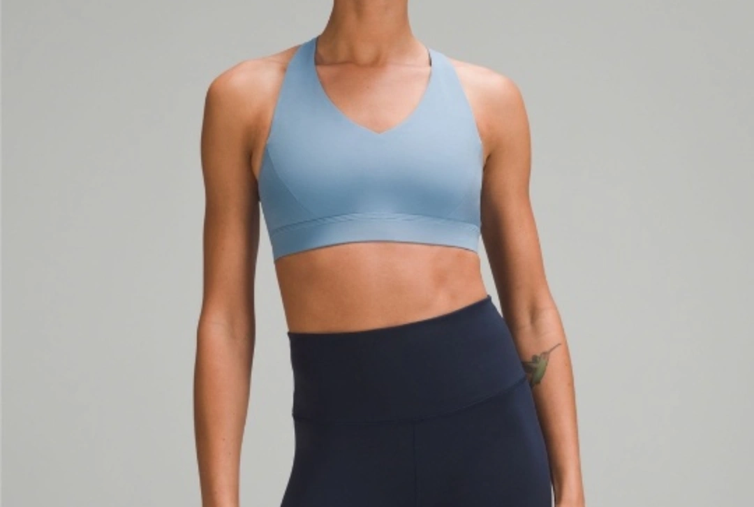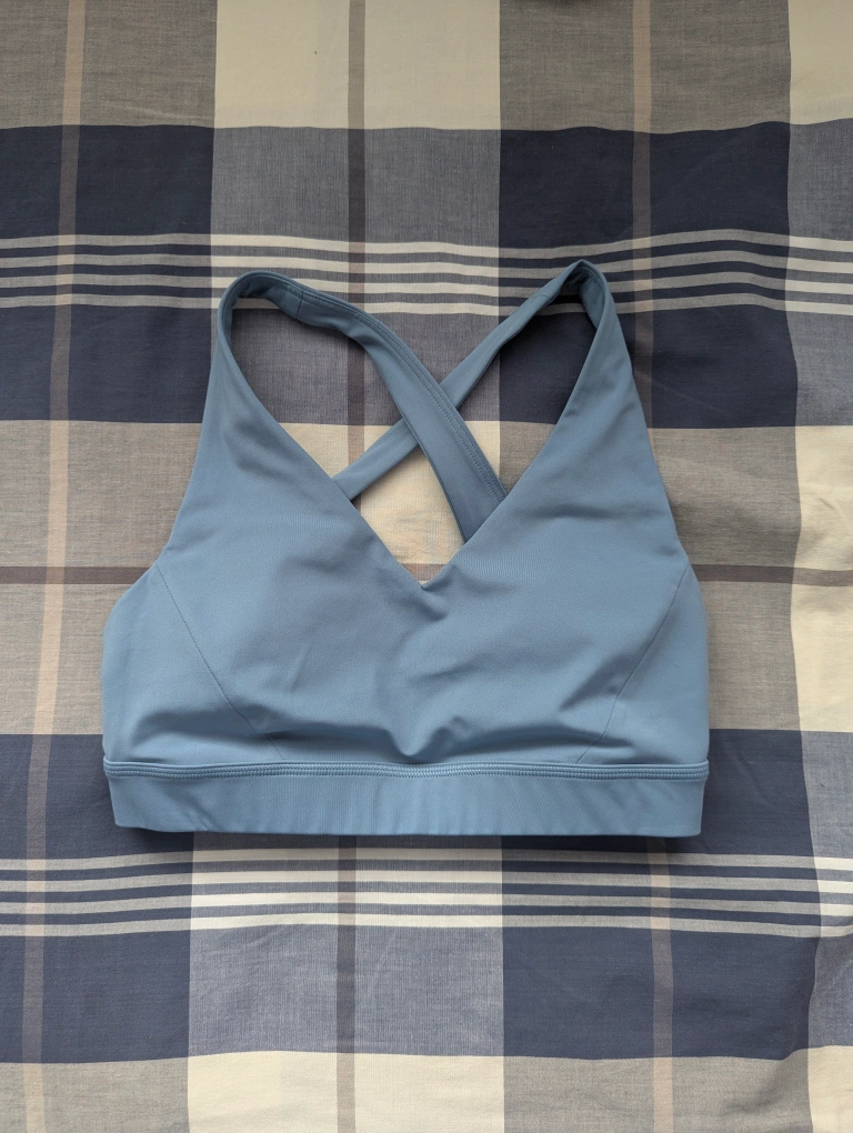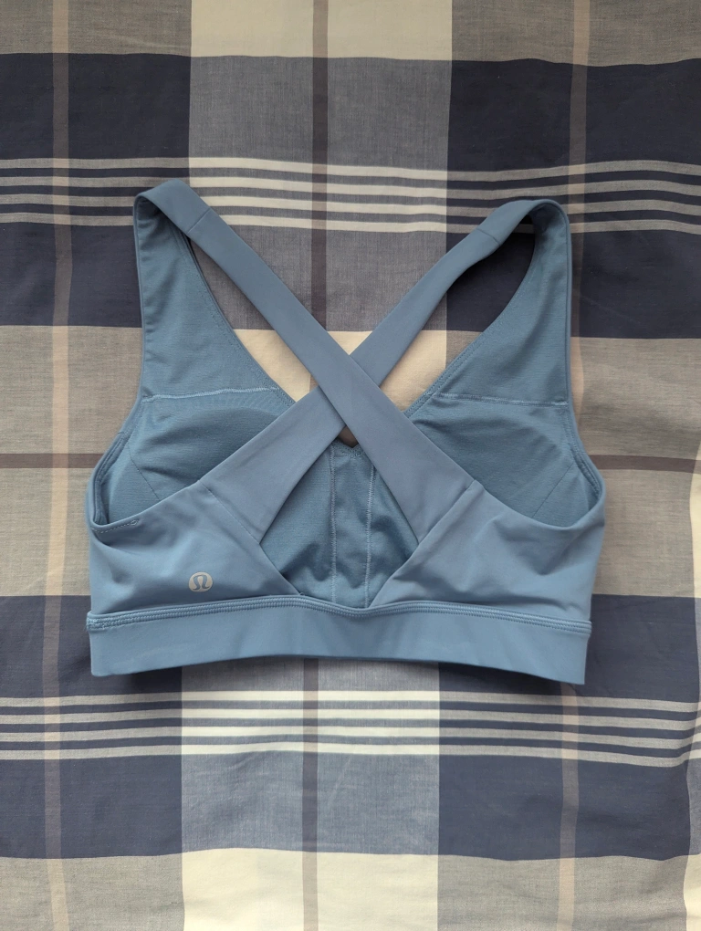 Lululemon sports bra, size 4 in utility blue colour. Has a stylish cross-back design and is in mint condition. Perfect for athletic leisure, yoga, etc.