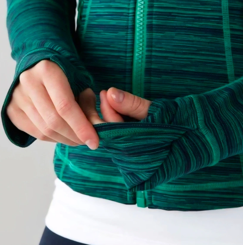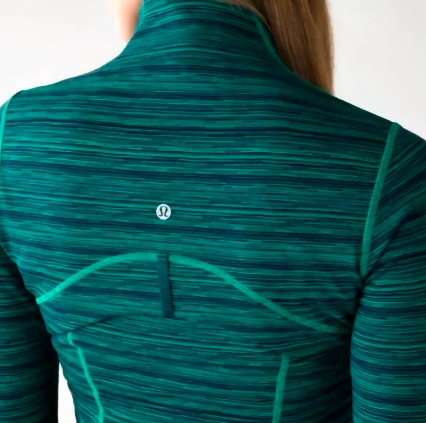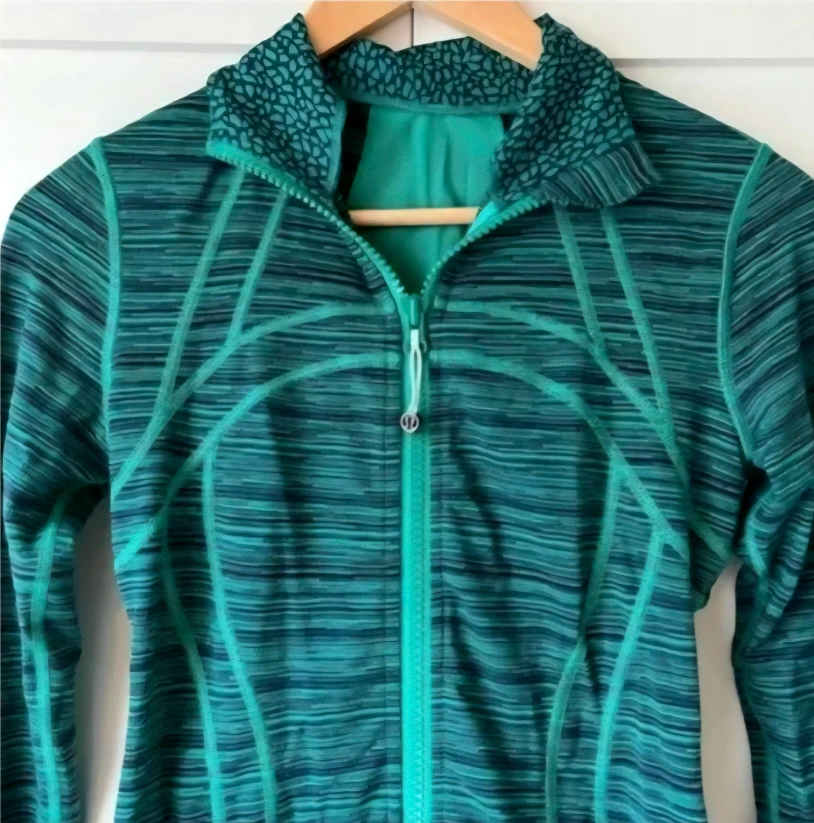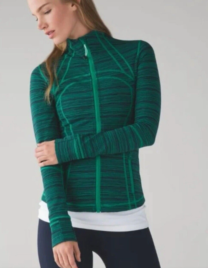 Excellent pre-owned condition Lululemon Define Jacket size 8 Zip Wee Stripe Cyber Green/Jungle Blue Measurements Laying Flat Pit to Pit 19" Sleeve length 26" Length top-bottom 25 to 27" Width at bottom 19.5" Approximate Measurements