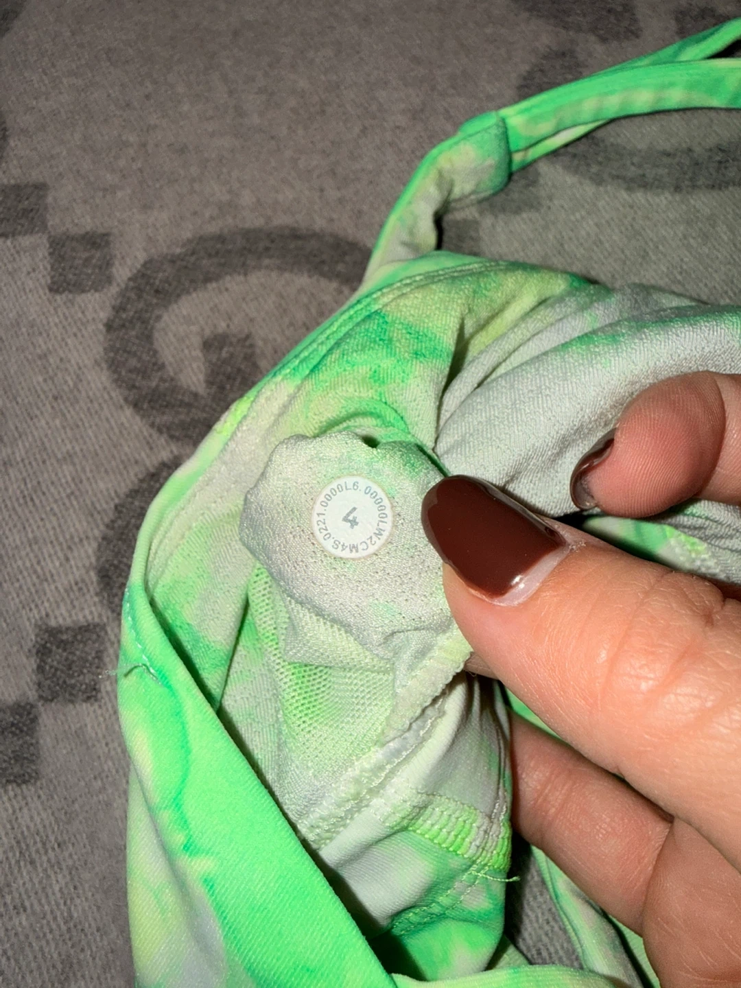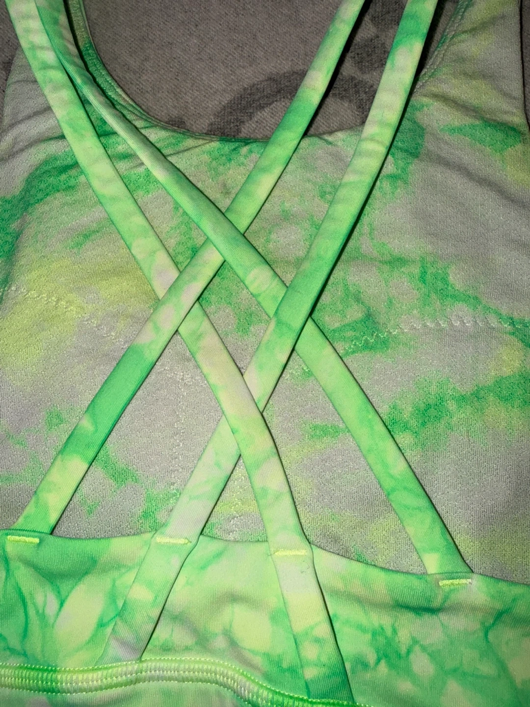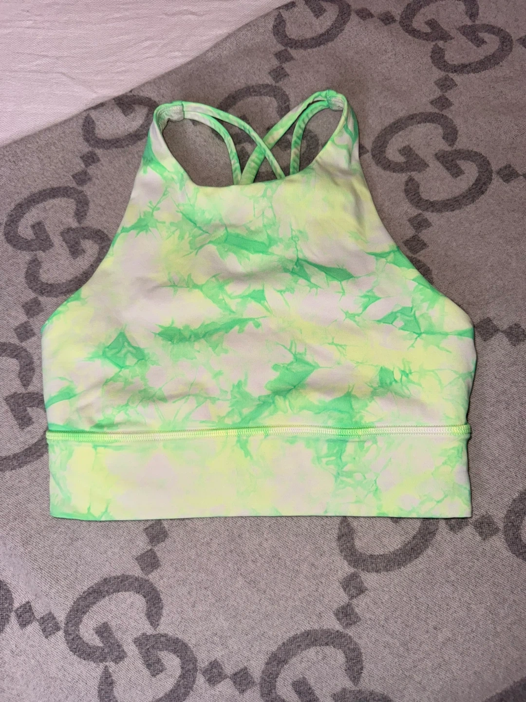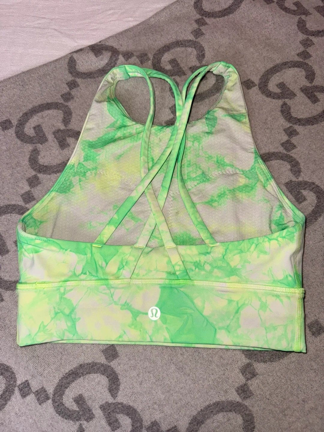 Selling a Lululemon sports bra in a vibrant green tie-dye pattern! It's a size 4 and features a stylish strappy back. Perfect for workouts or everyday wear Great condition Size 4 Energy bra, high neck, long line Vibrant green tie-dye sports bra with a stylish design. Luxtreme® fabric is sweat-wicking and four-way stretch with a cool, smooth feel • Added Lycra® fibre for stretch and shape retention • High neck for added coverage • Pockets for optional, removable cups • Intended to provide medium support for a B/C cup