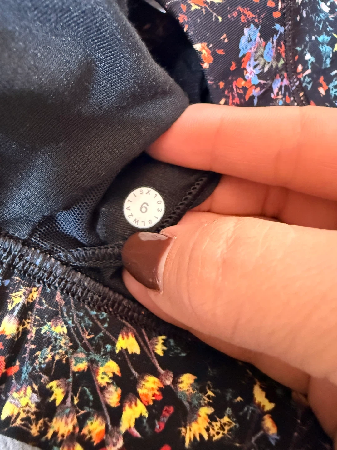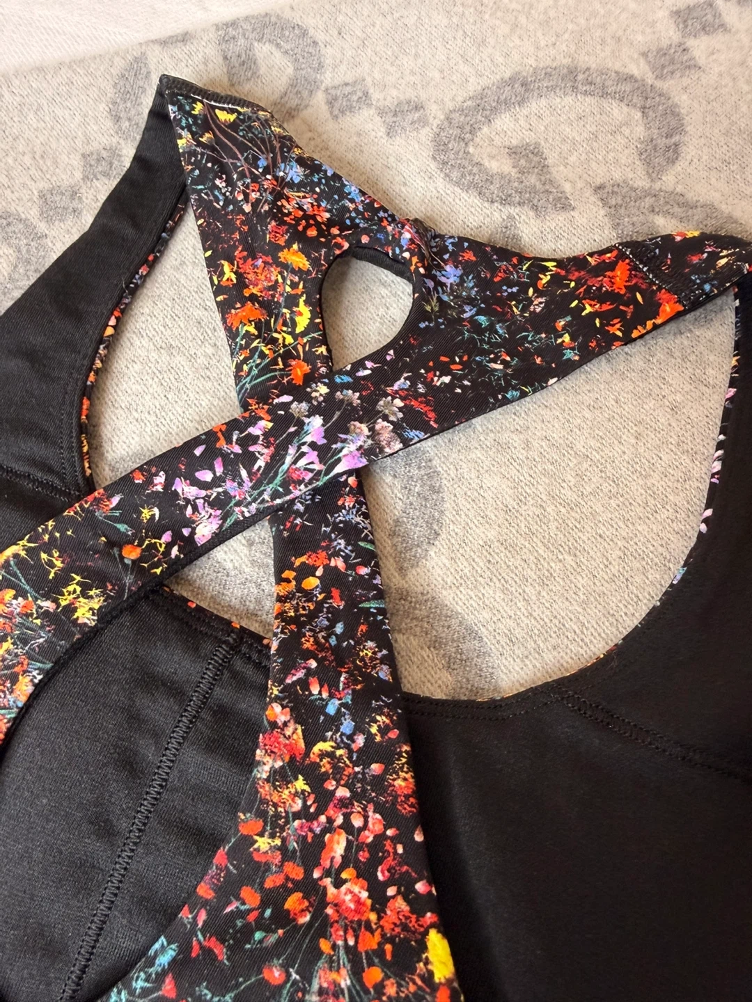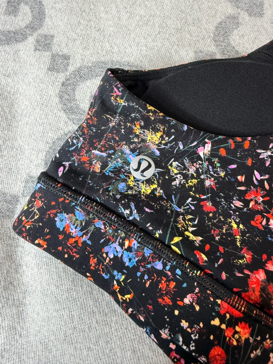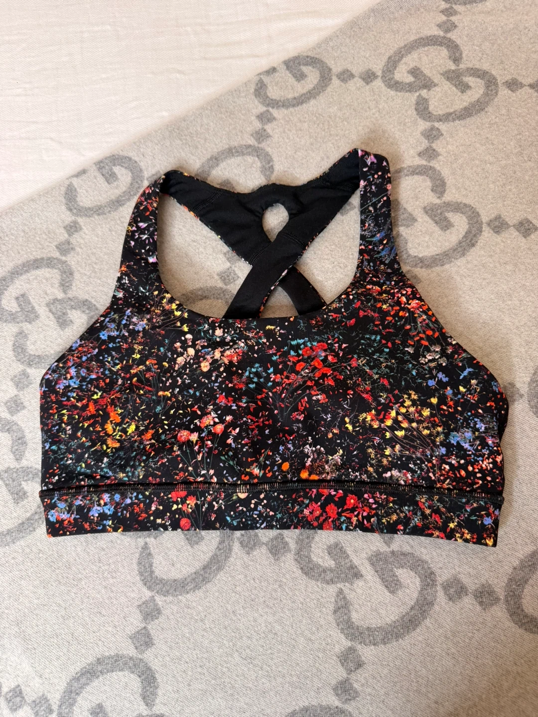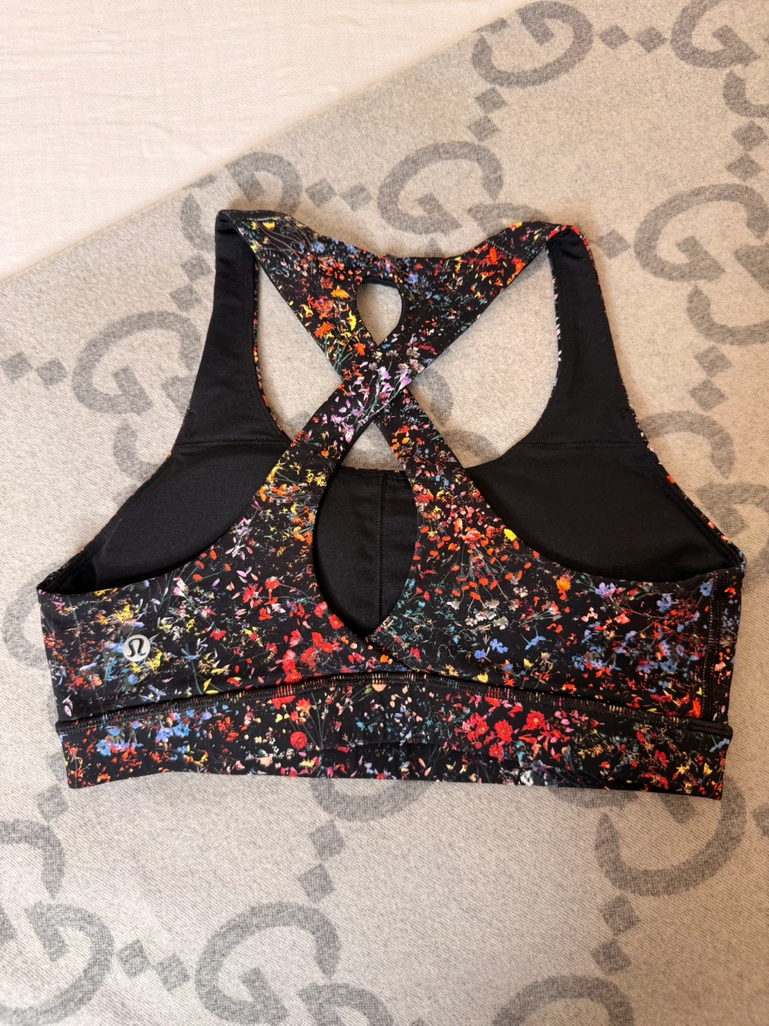 Selling a Lululemon sports bra in size 6. It features a beautiful floral pattern on a black background. The back has a unique criss-cross design. Great for workouts or everyday wear! Padding still intact