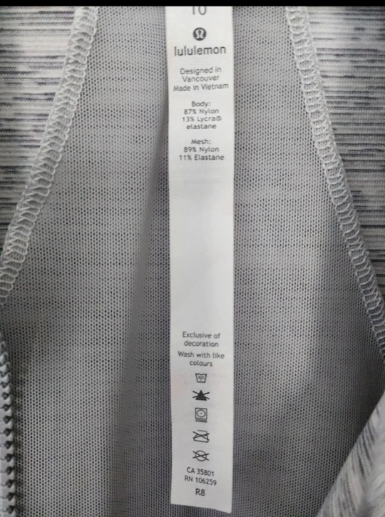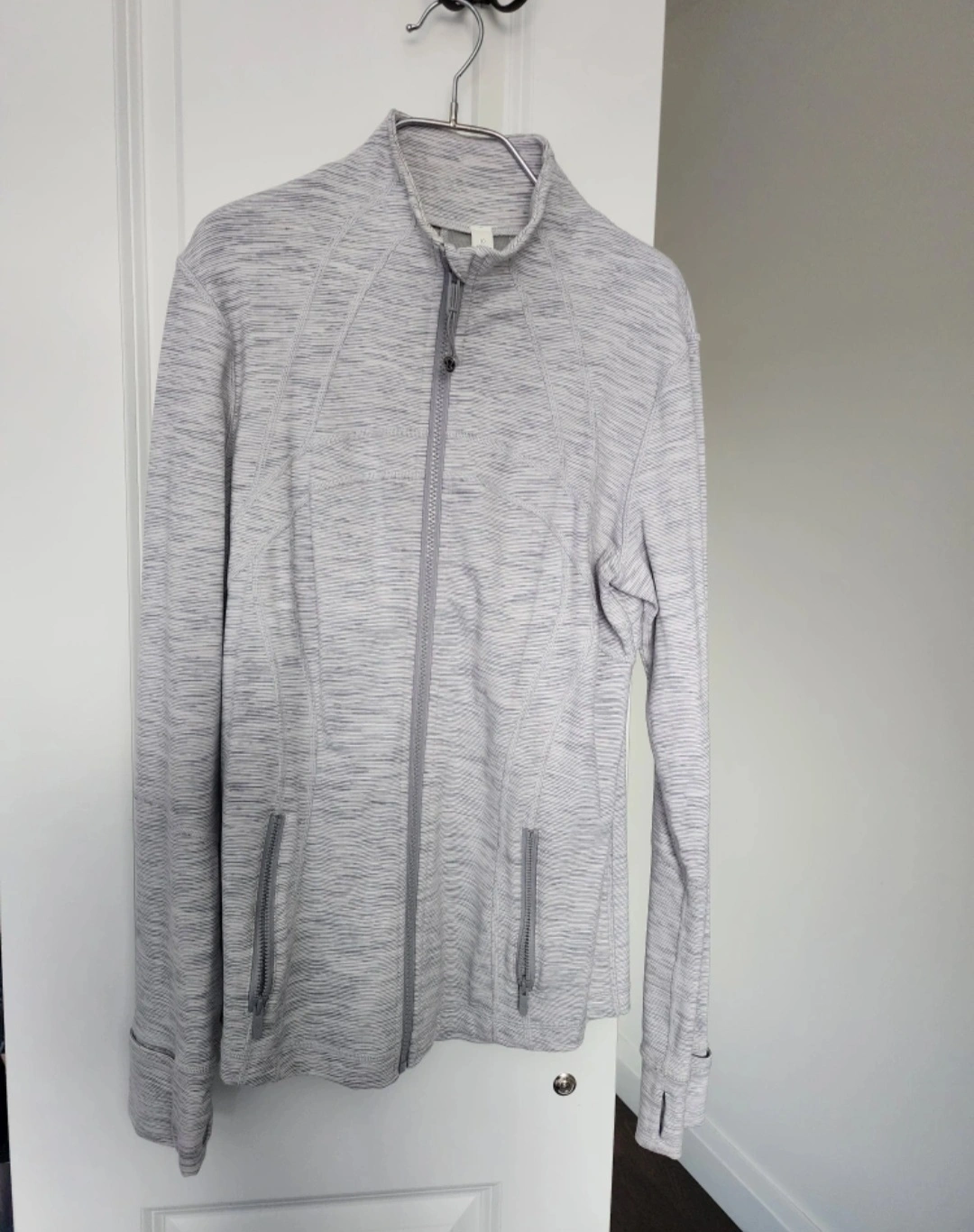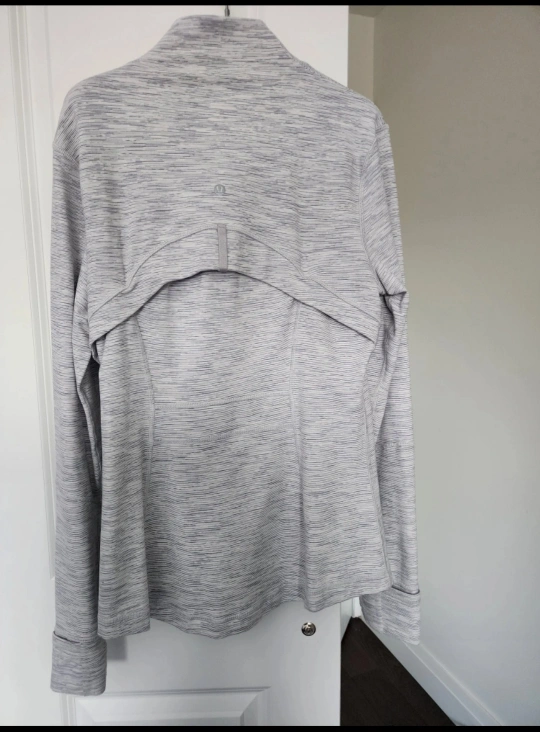 Selling a Lululemon jacket in a size 10! It's a light grey colour and made of 87% nylon and 13% Lycra spandex. The mesh is 89% nylon and 11% elastane. It's in great condition and perfect for layering or wearing on its own