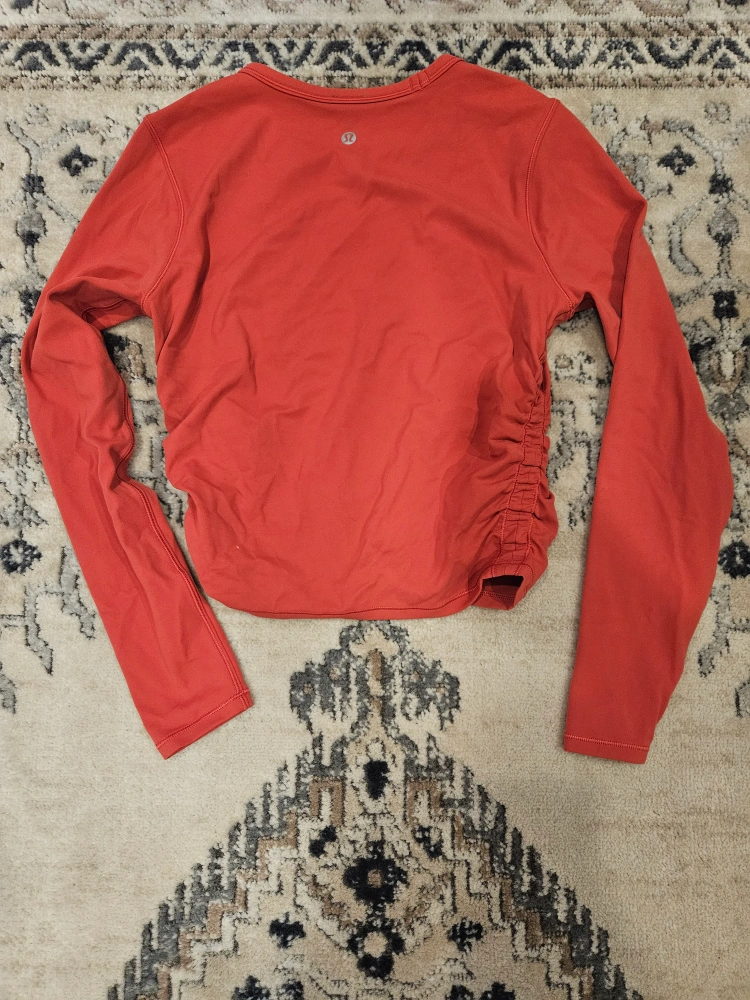 Selling a Lululemon long sleeve top in size 6. It's in great condition and ready for a new home! The colour is a lovely reddish-orange. Perfect for workouts or casual wear only best offer pls