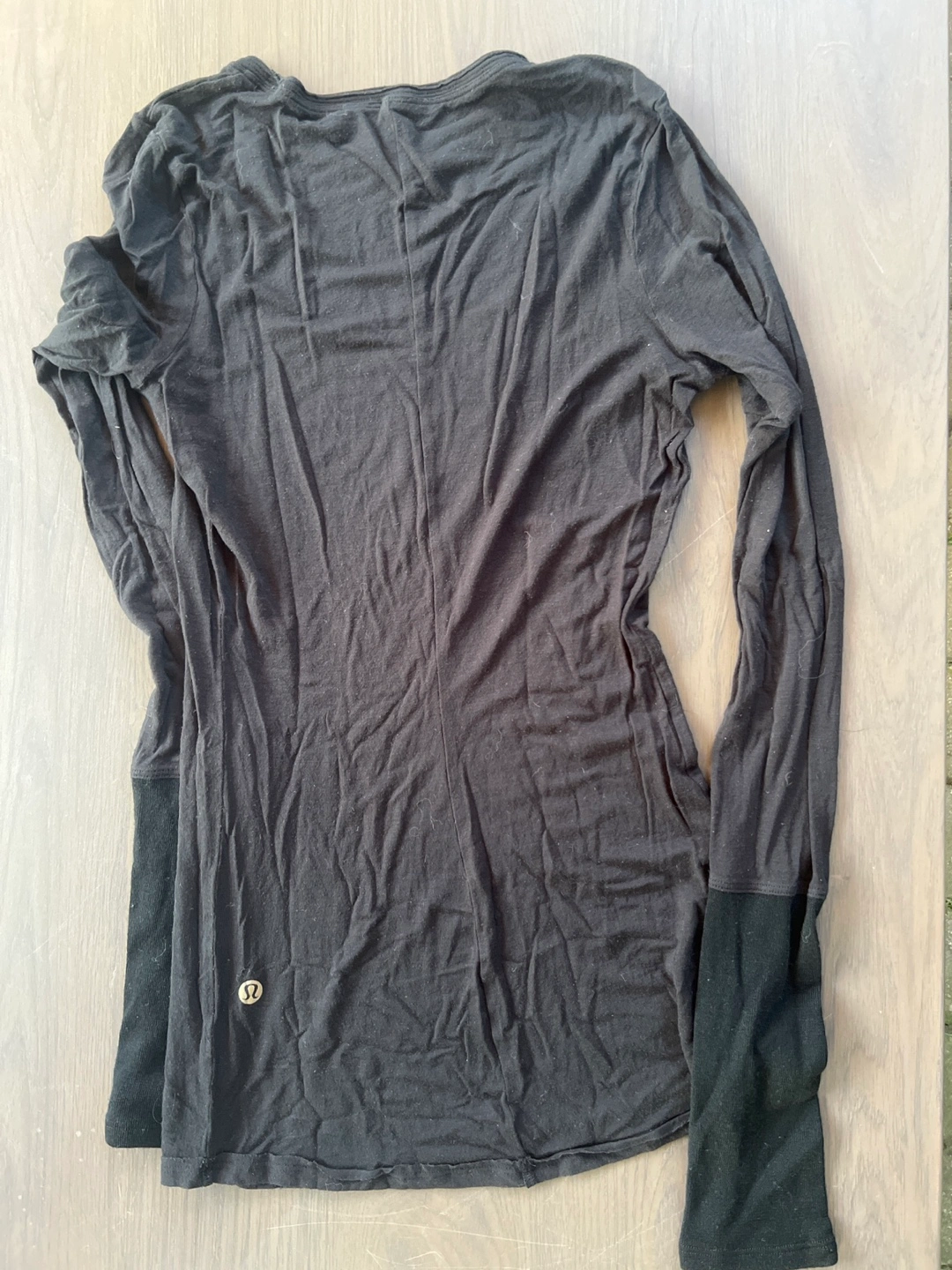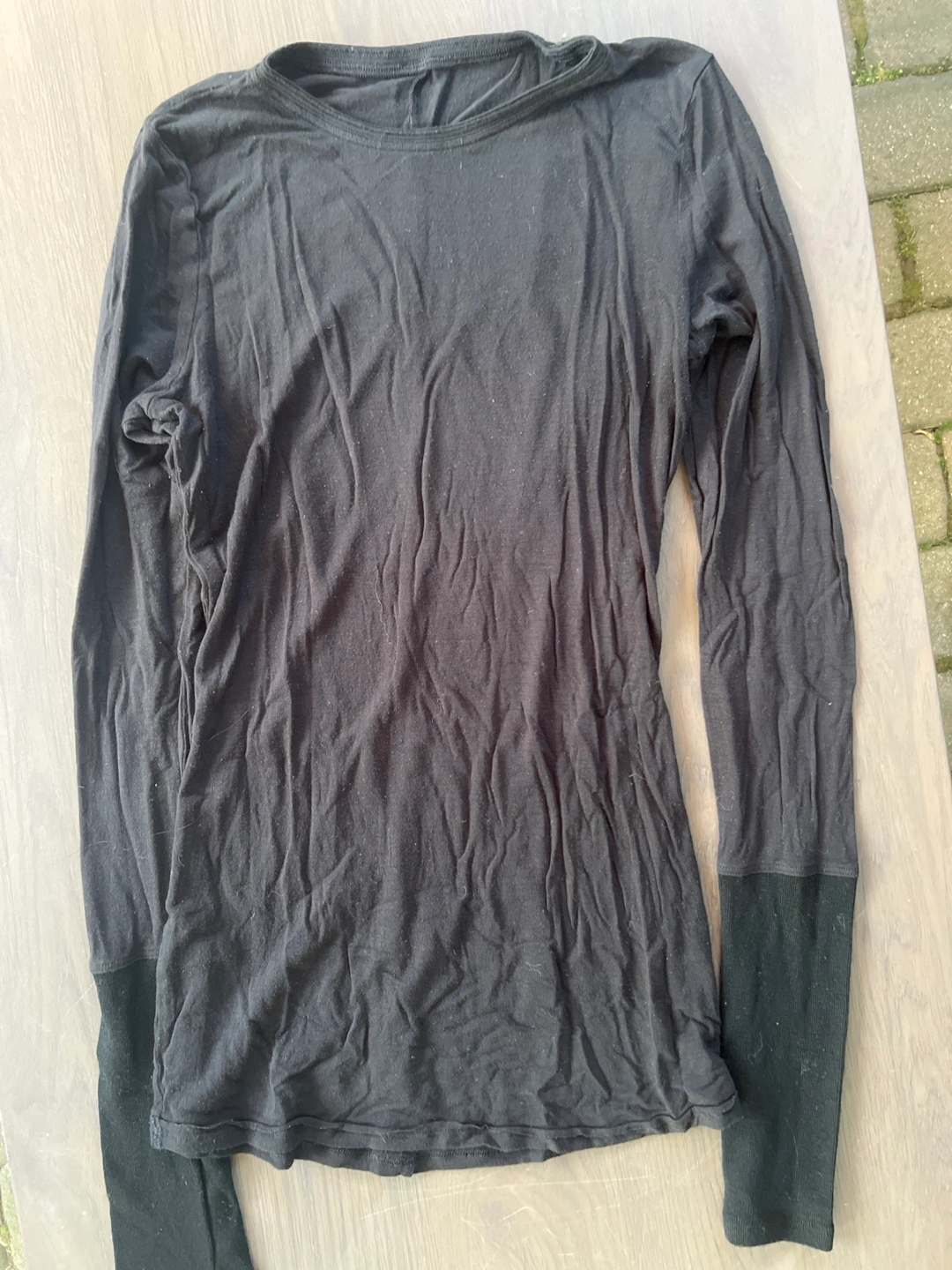 A black long-sleeve top. Featuring long sleeves with darker fabric at the cuffs. The neck appears to be a crew-neck. It is soft to the touch, perfect for yoga or a cozy afternoon at home.