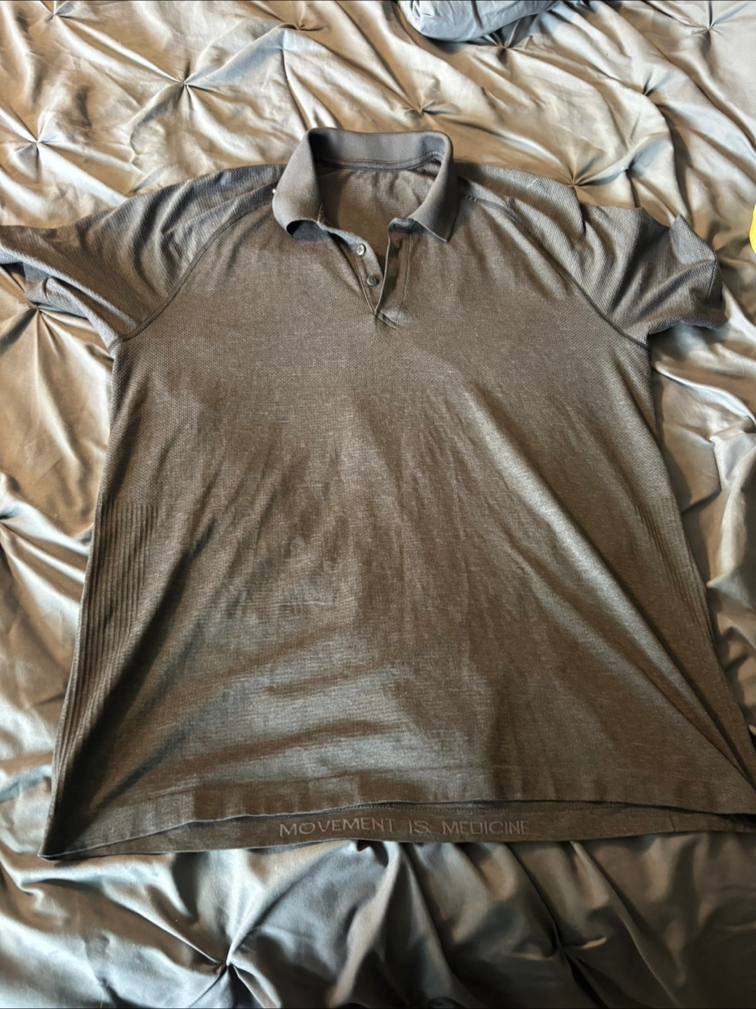Lululemon men's polo shirt in a nice gray colour. It's in great condition and ready for a new home! The material is very comfortable and the shirt is lightweight and breathable, perfect for everyday wear or a workout Xl