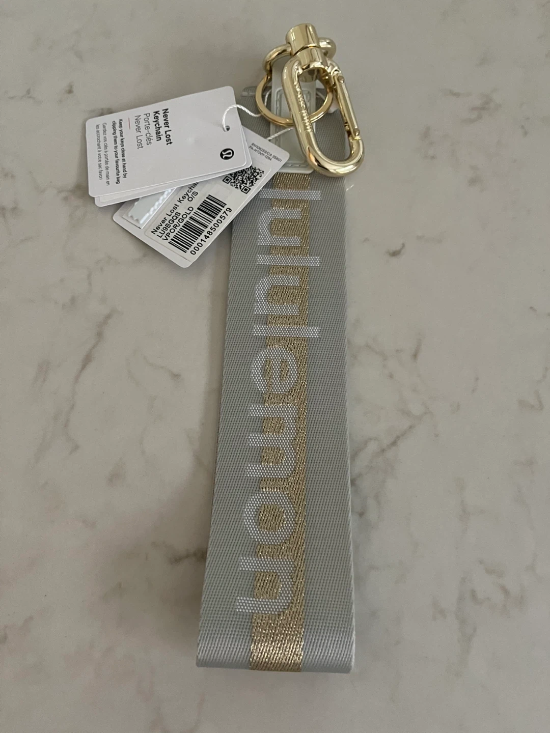 Selling a brand new Lululemon Never Lost Keychain! It's a stylish way to keep your keys handy by clipping them to your favourite bag. The keychain features a grey strap with gold accents and the Lululemon logo. Never Lost Keychain Porte-clés Never Lost.