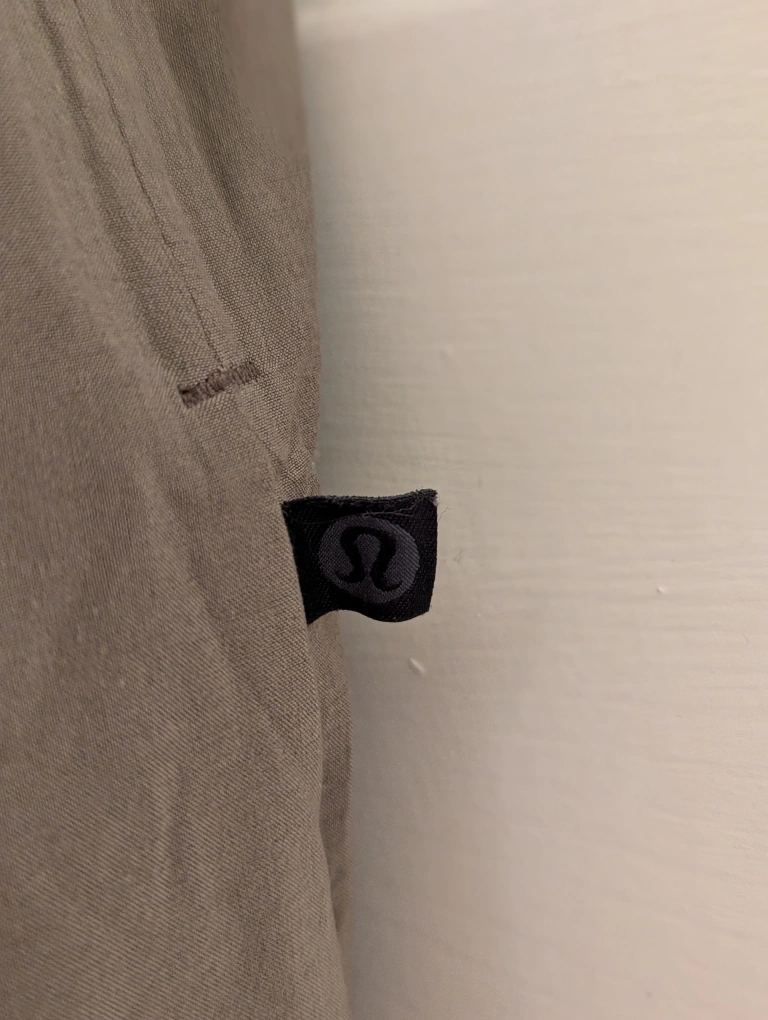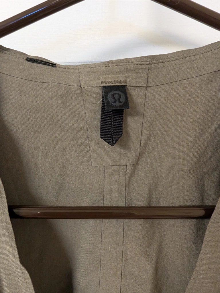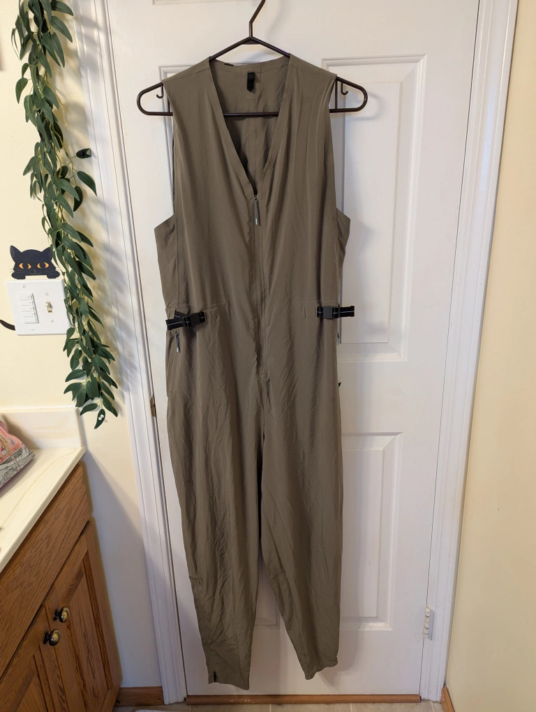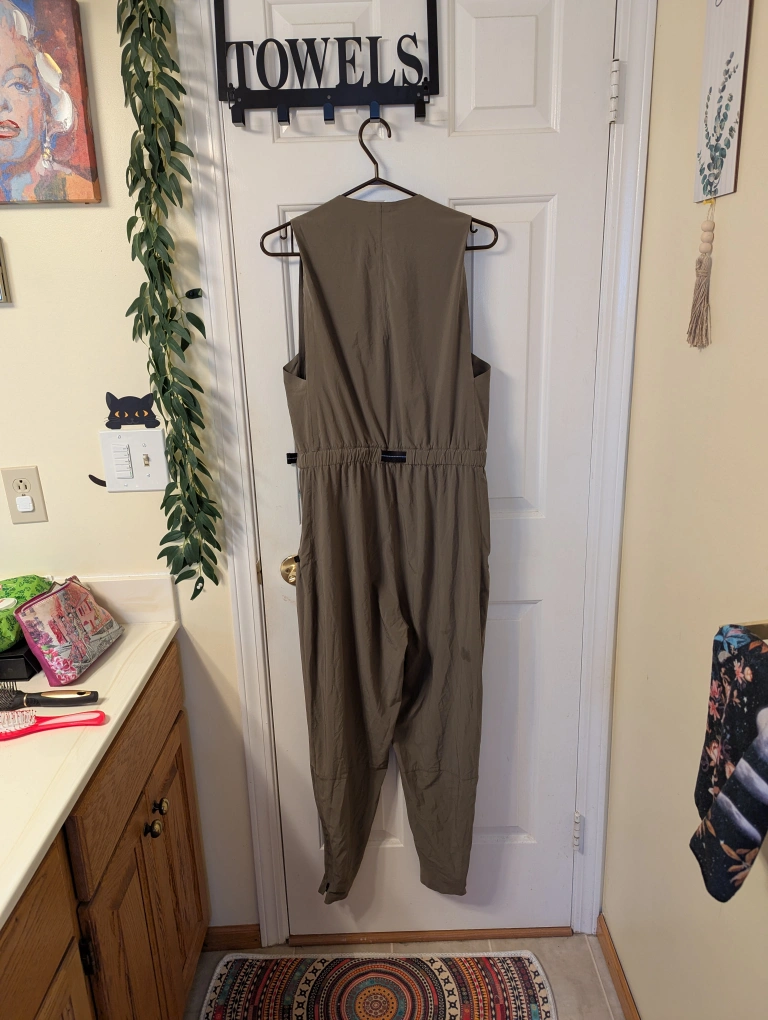 Olive green sleeveless jumpsuit. Zip front closure. Adjustable straps. Drawstring waist. Two pockets. Lightweight fabric. Size 8