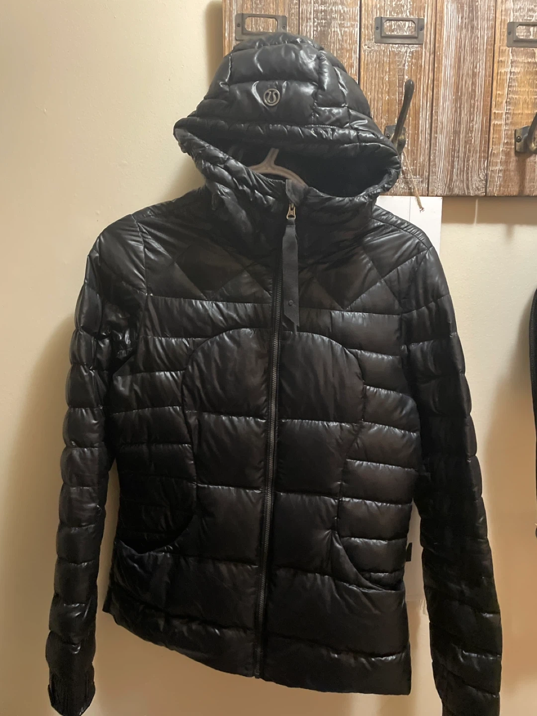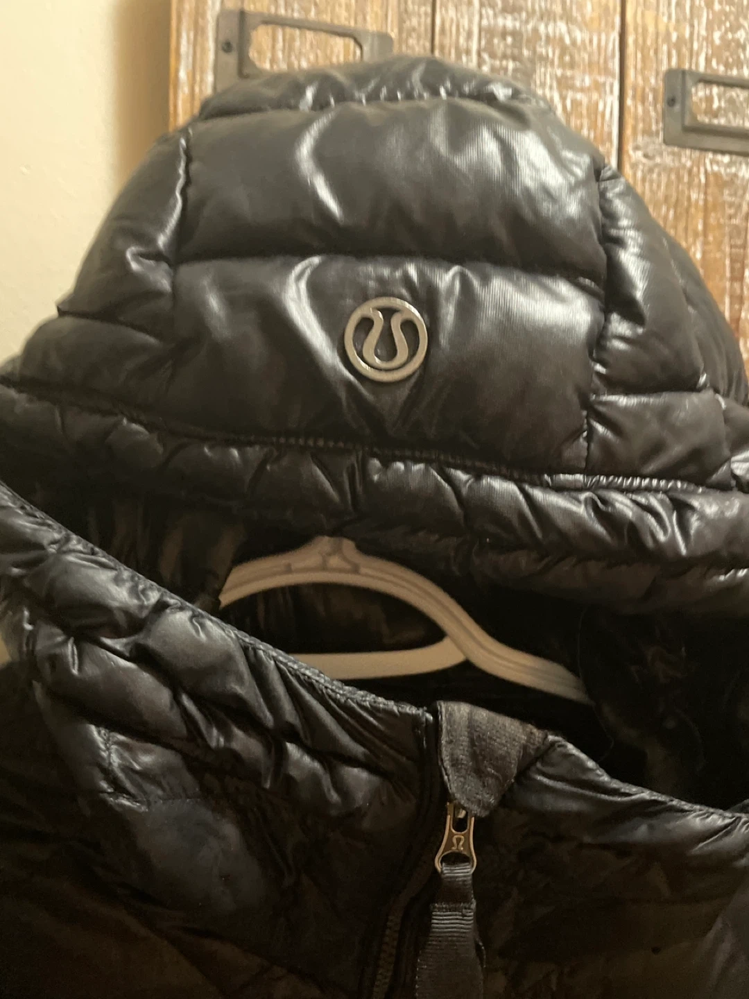 Selling a Lululemon puffer jacket in black. It's in great condition and perfect for staying warm during the colder months. The jacket features a sleek design and the iconic Lululemon logo.