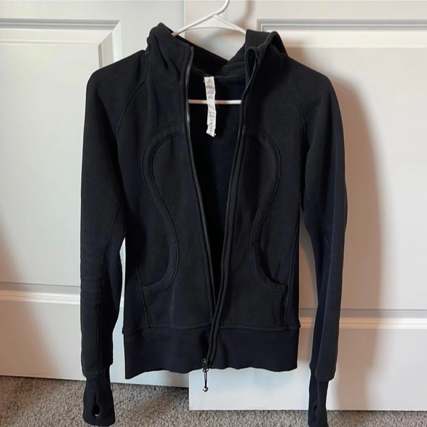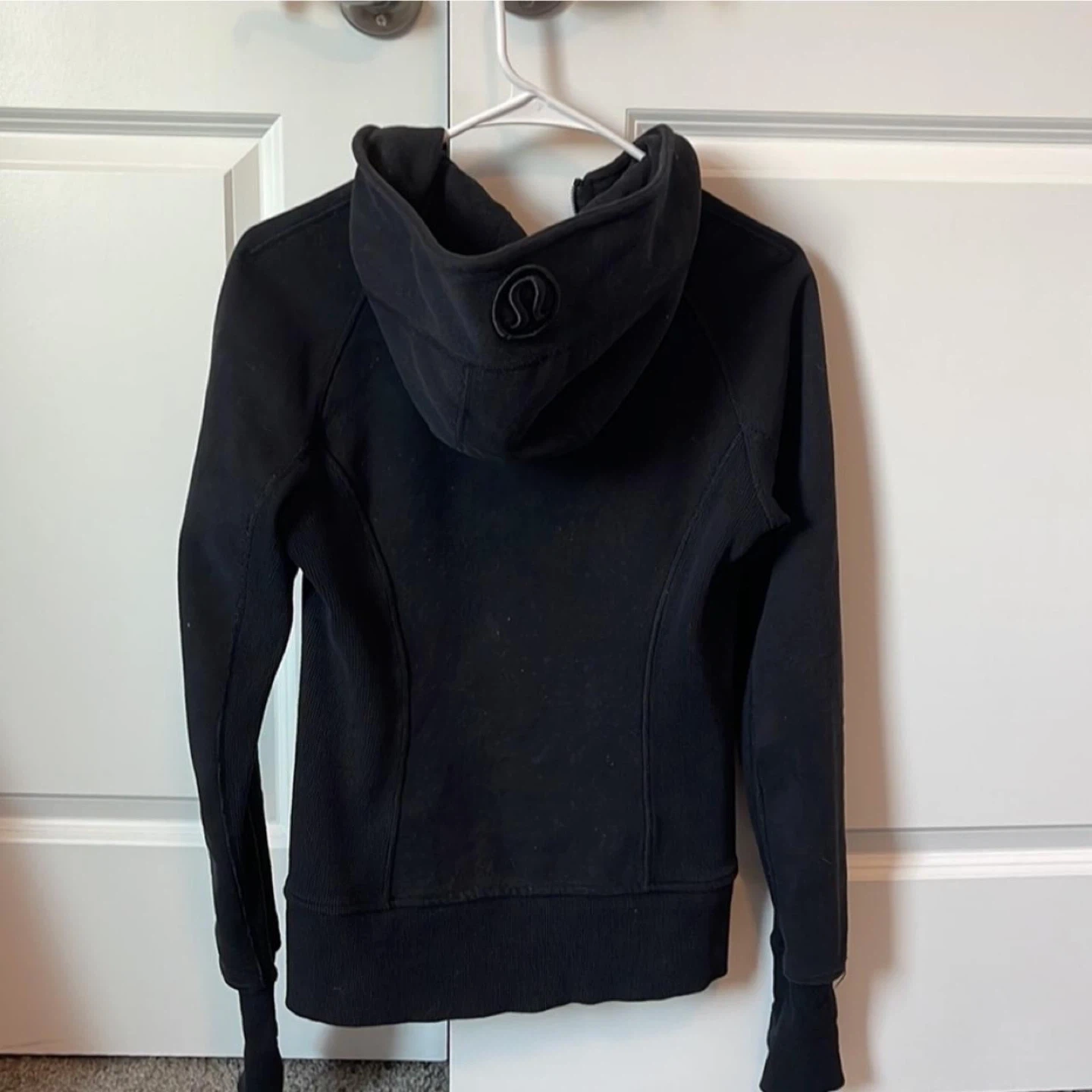 Selling a Lululemon Scuba Hoodie in black. It's in great condition and super cozy! Perfect for layering or wearing on its own. It features a classic Lululemon design with a hood and front zipper. A great addition to your activewear collection! SIZE 2 Also available in size 6 in burgundy colour