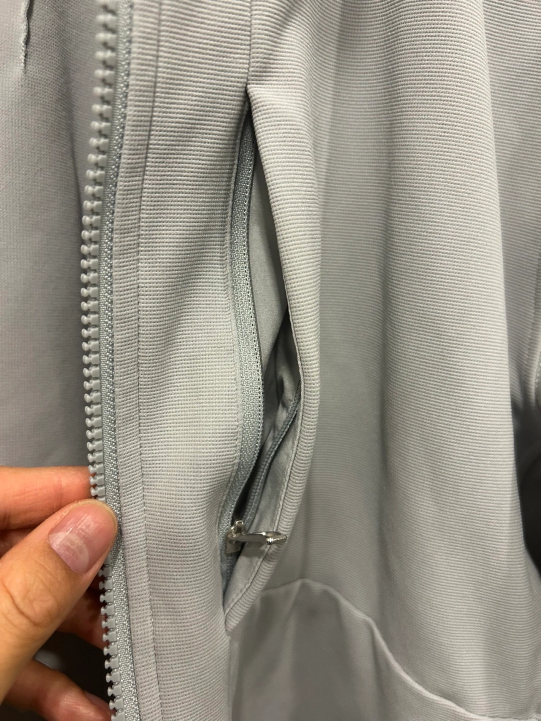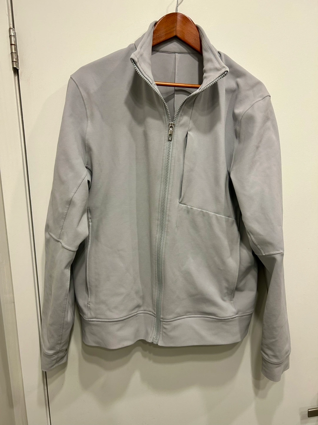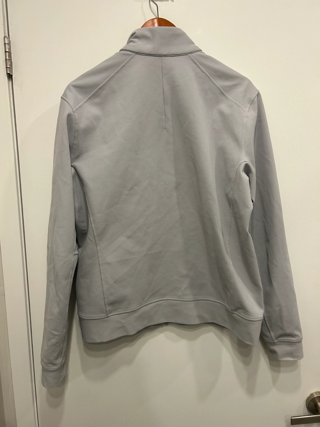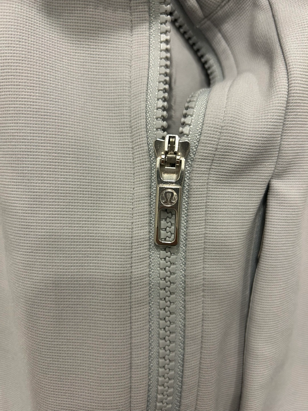 Lululemon zip-up jacket. Light grey colour. Full zip closure. Long sleeves with ribbed cuffs. Small pocket on the left side. Great for layering.