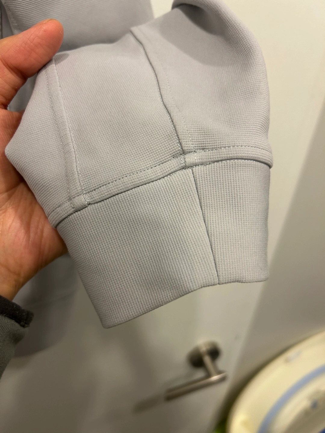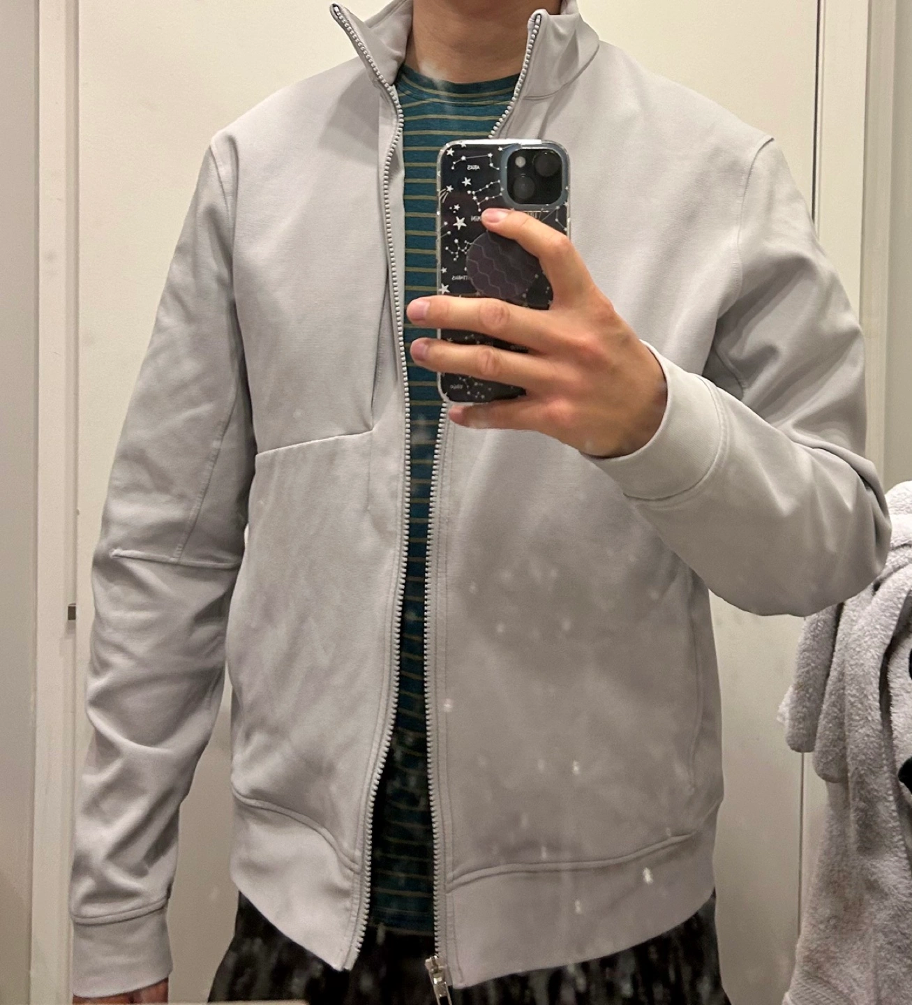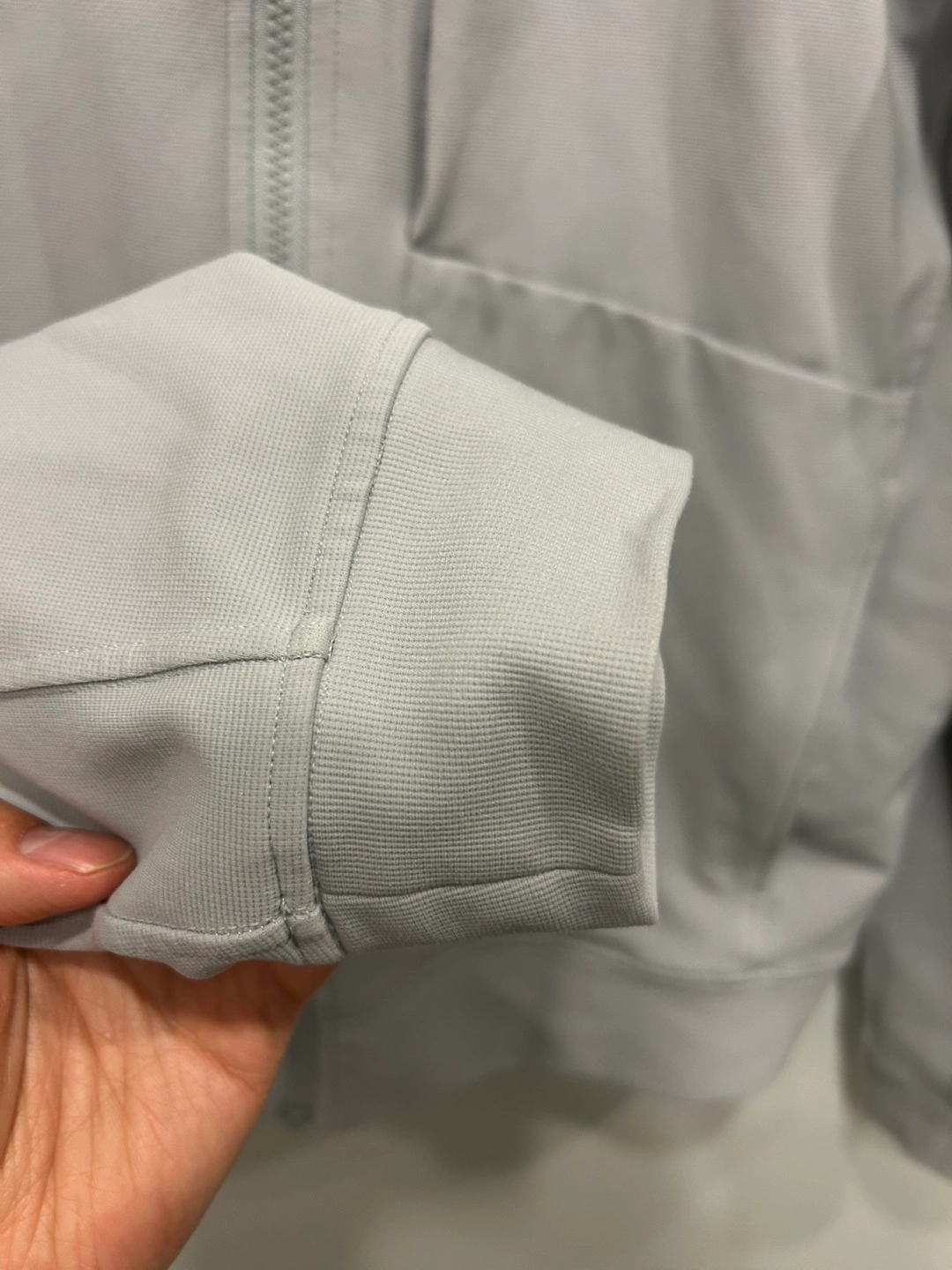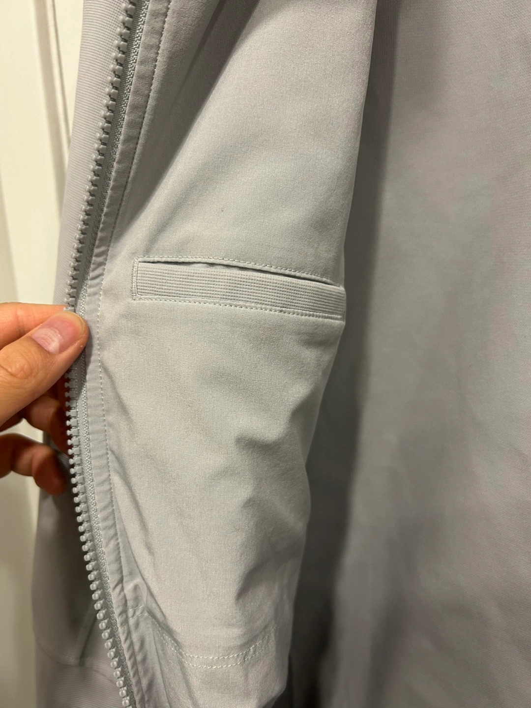 Lululemon zip-up jacket. Light grey colour. Full zip closure. Long sleeves with ribbed cuffs. Small pocket on the left side. Great for layering.