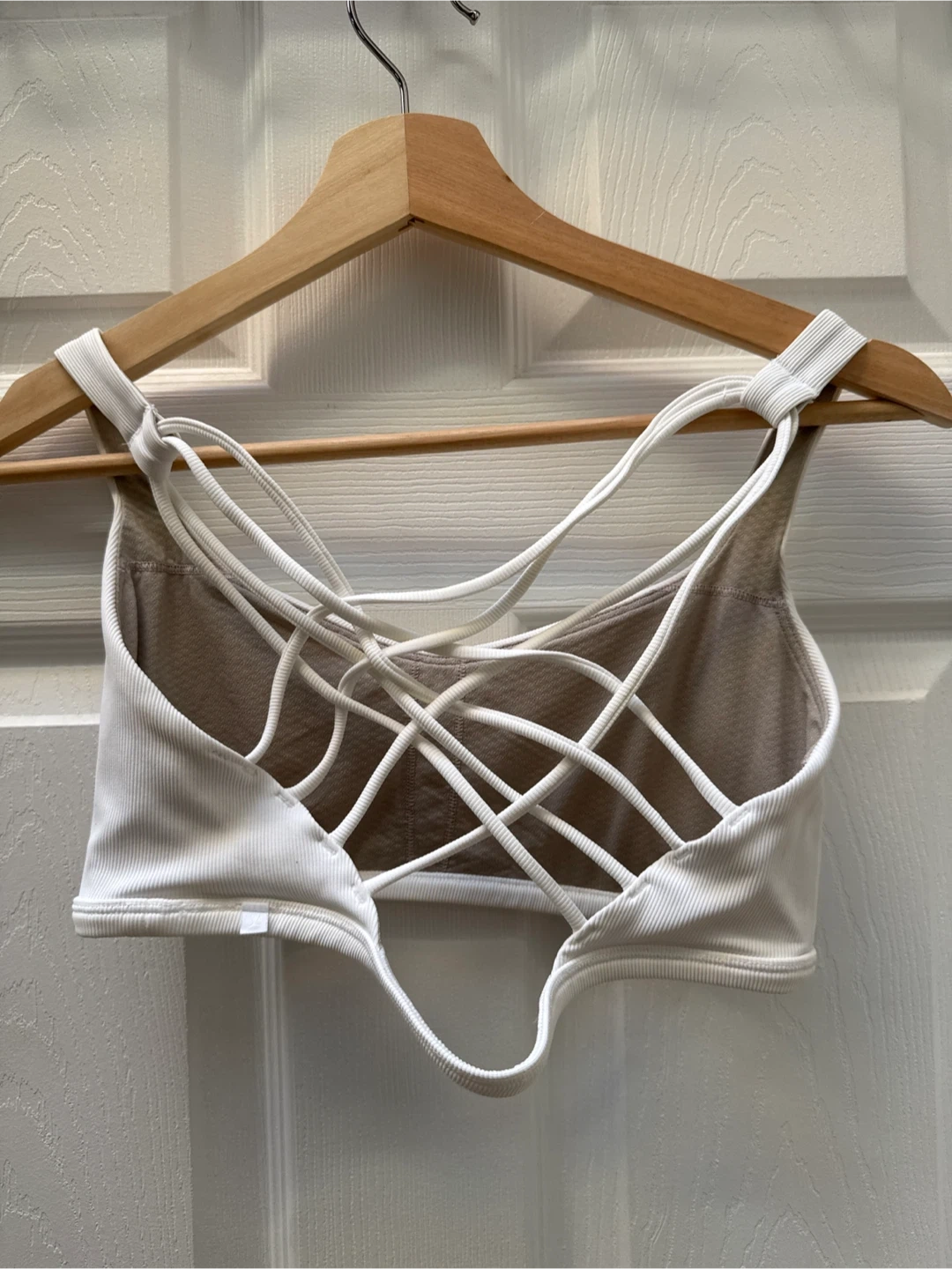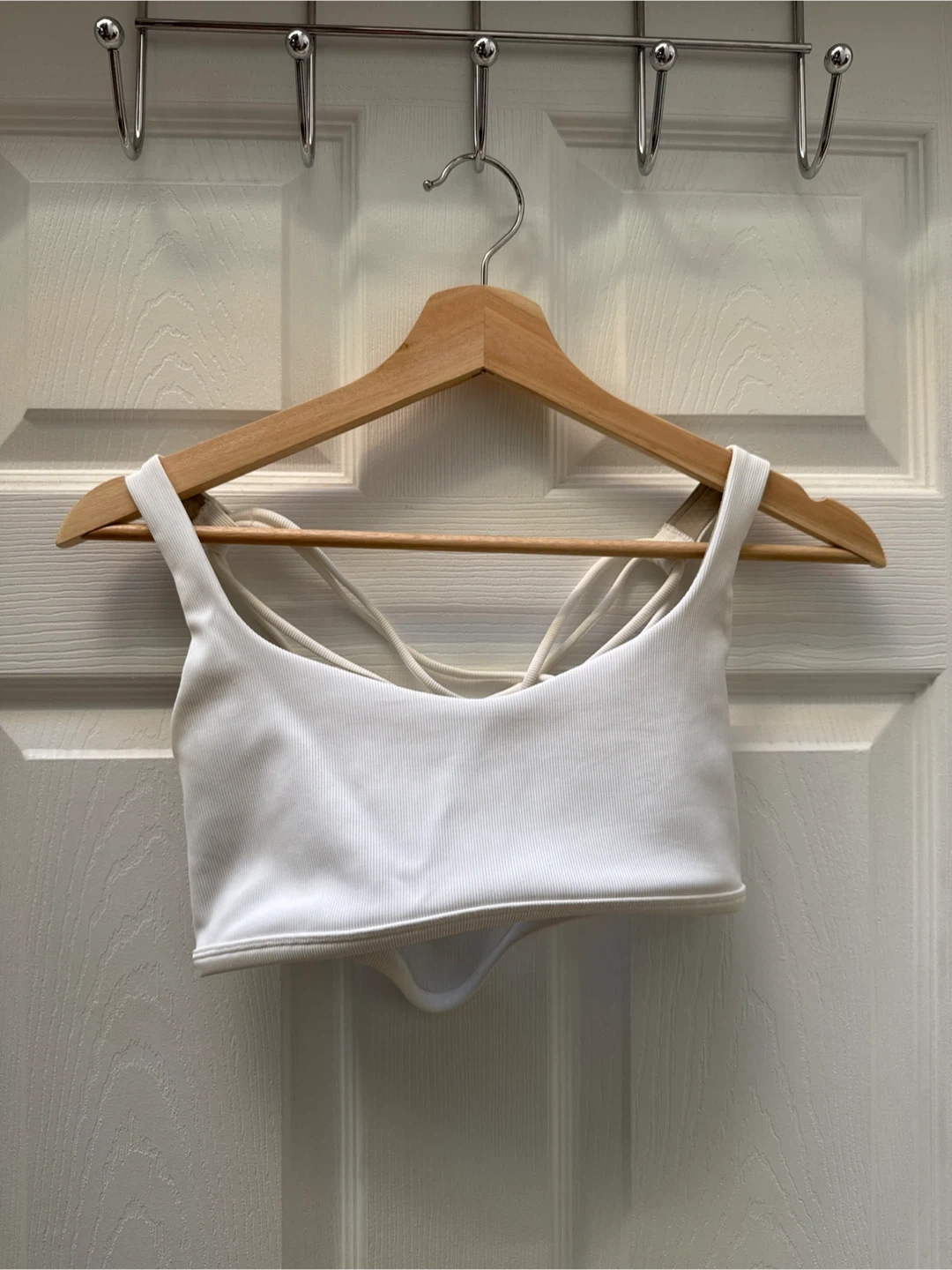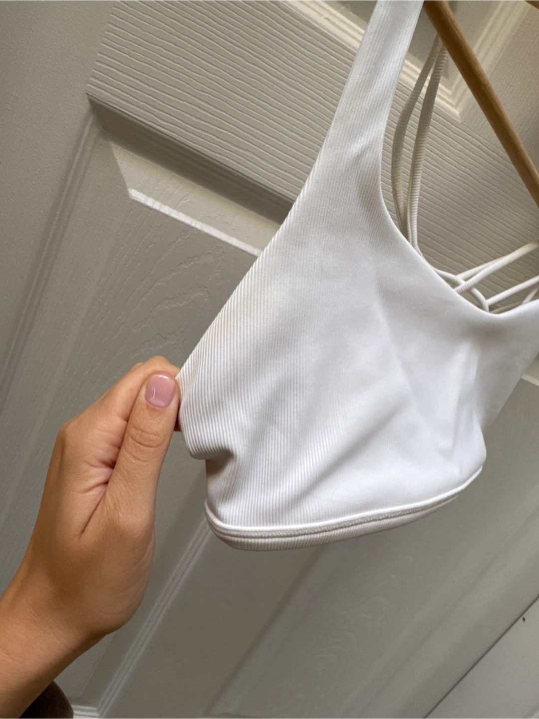 It's ribbed and has a strappy back. Perfect for workouts or everyday wear. Has some slight staining but in basically new condition. Size 6.