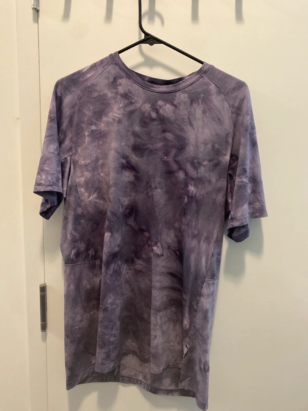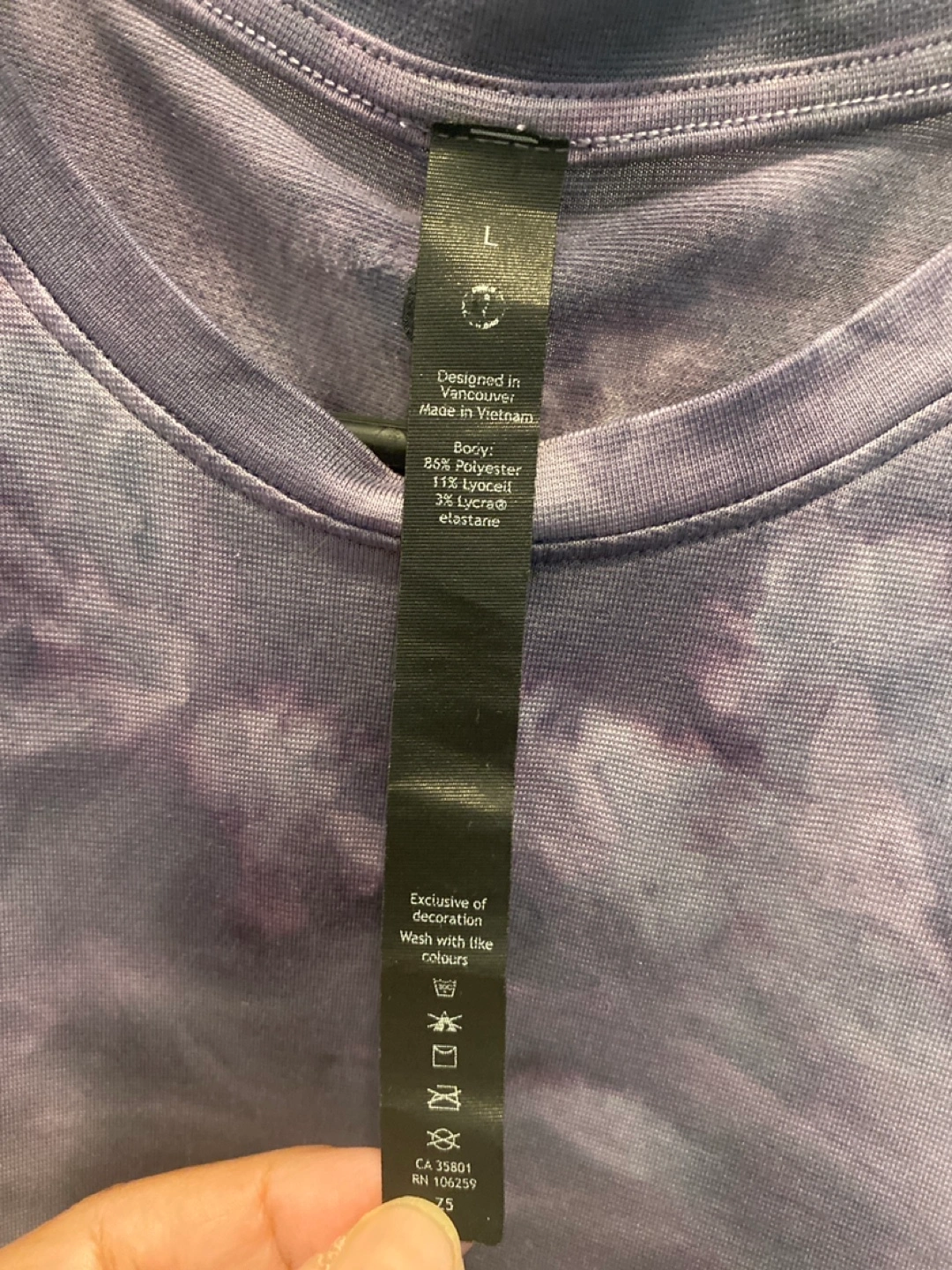 Selling a Lululemon t-shirt in size L. It's a nice tie-dye pattern in shades of purple and grey. The material is 85% polyester, 11% lyocell, and 4% elastane. Designed in Vancouver and made in Vietnam