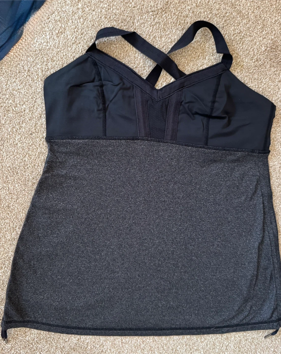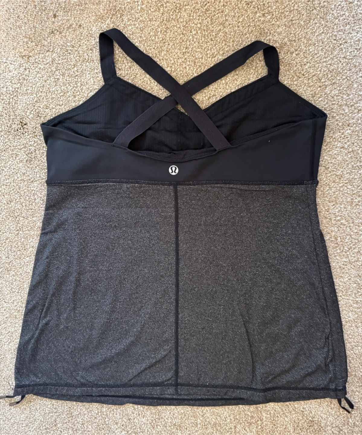 Selling a Lululemon tank top in excellent condition. It's a mix of black and grey, size 8. Perfect for workouts or casual wear!
