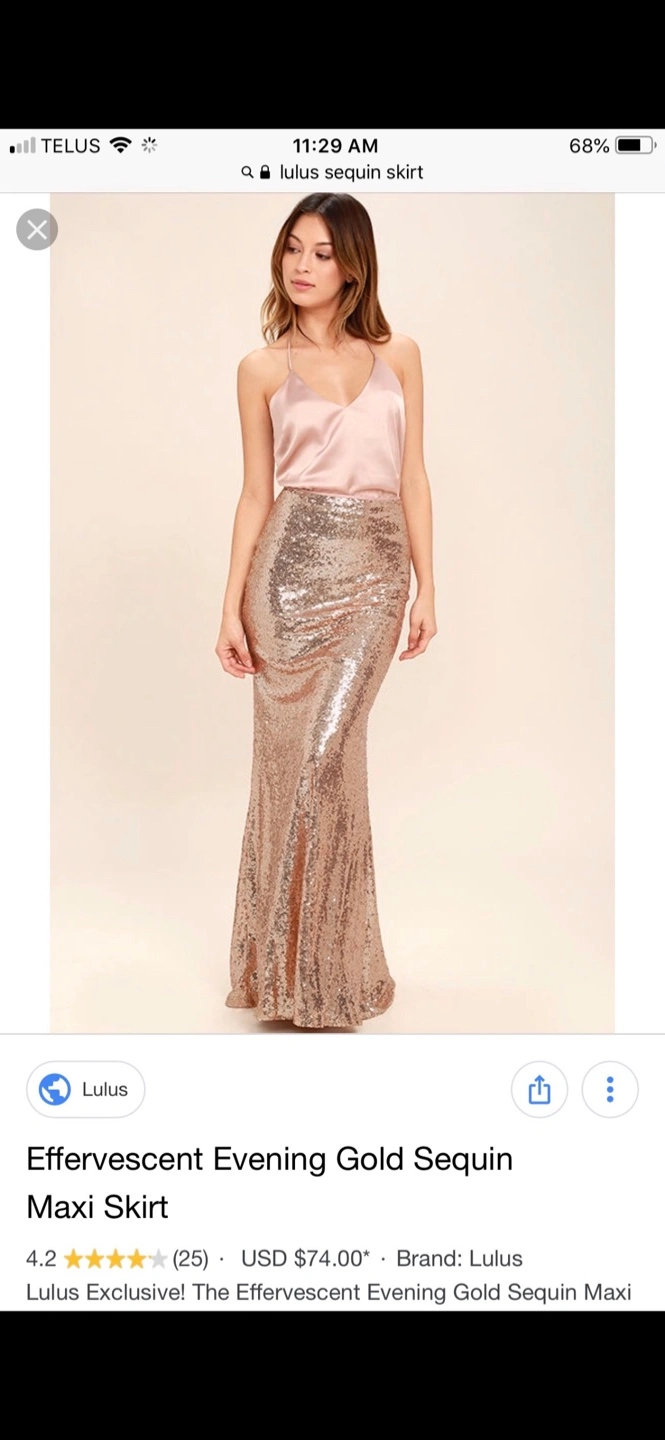 Selling a beautiful Lulus Effervescent Evening Gold Sequin Maxi Skirt. It's in great condition and perfect for a special occasion! The skirt features a stunning sequin design that catches the light beautifully. Originally bought for $74 USD