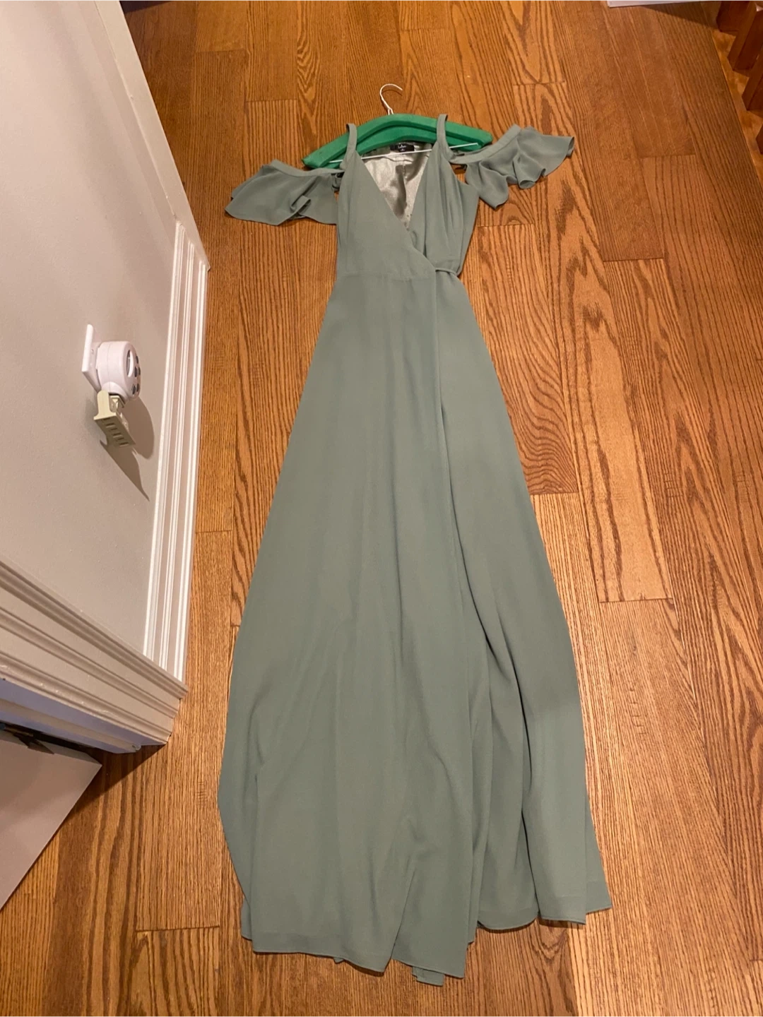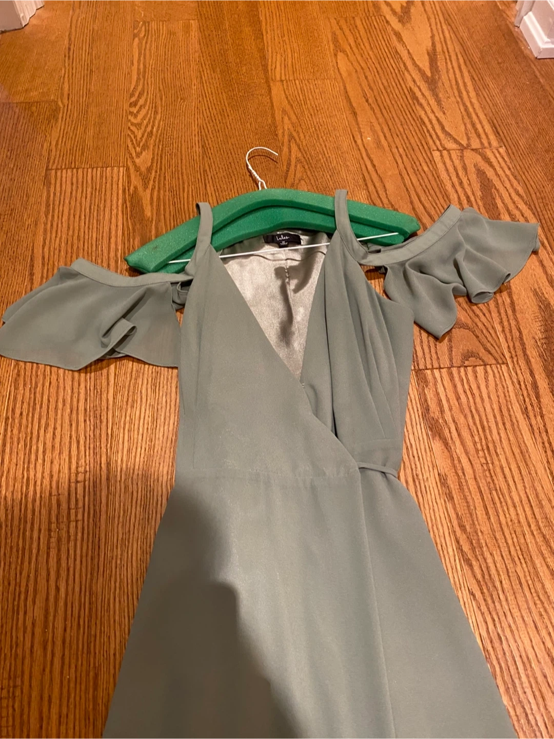 Selling a beautiful sage green gown from Lulus! It features a flattering wrap style and pretty ruffle details on the shoulders. Perfect for a special occasion or a night out. Only worn once.