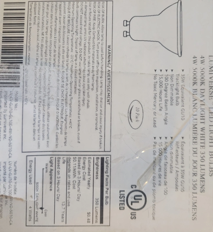 Selling a pack of Lumiverse LED light bulbs. These are 4W bulbs with a 5000K daylight white light. Each bulb produces 350 lumens and is equivalent to a 35W GU10 bulb. They are non-dimmable and have a 100-degree beam angle. These bulbs are mercury and lead-free, with a lifespan of 15,000 hours