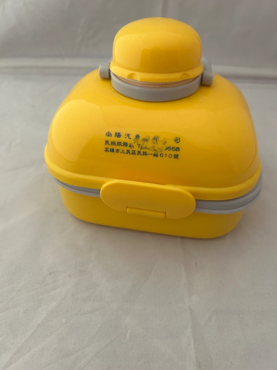 Selling a cute yellow lunch box! Complete with liquid container and snack compartment. It has a unique design. Great for kids. New, never used.