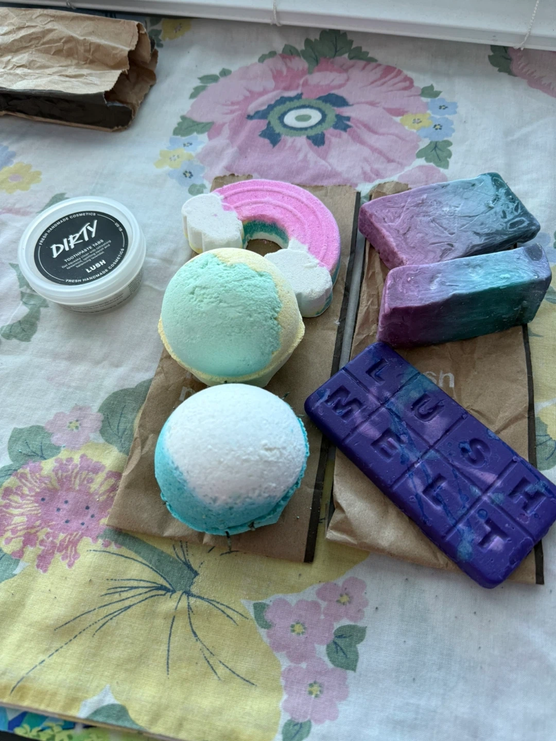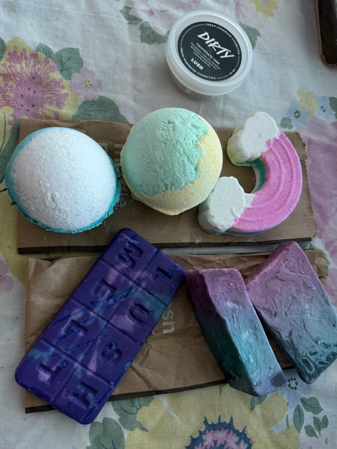 3 bath bombs $15 ($5 each) lavender lush melt soap $5 dirty tooth past tabs $5 Large mermaid tail soap $5 all 3 foot masks (exfoliating & repairing) $10 ALL BRAND NEW JUST NEVER BEEN USED