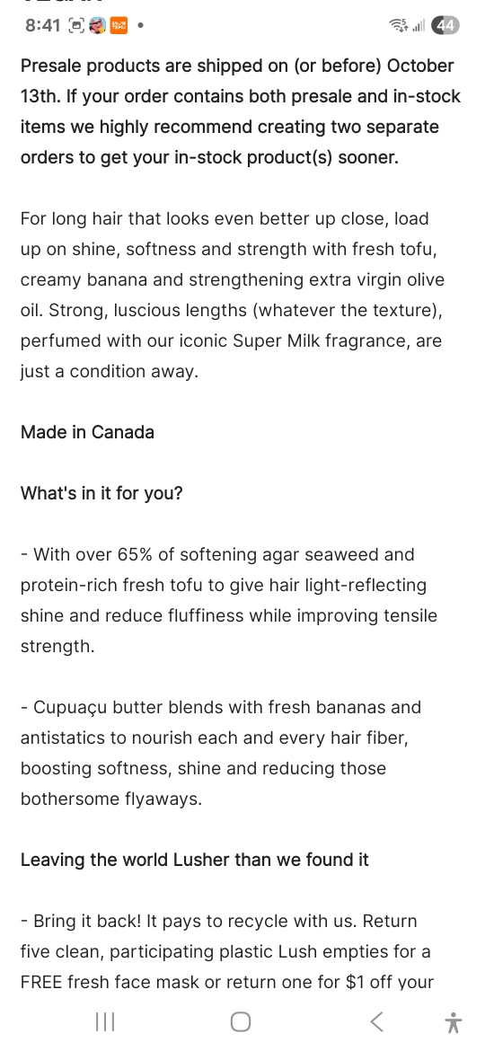 Selling a bottle of Lush Super Milk Conditioner! This is a great product for adding shine and strength to your hair. It contains softening agar seaweed and protein-rich tofu to give hair light-reflecting shine and reduce fluffiness, while improving tensile strength. It also contains cupuaçu butter blends with fresh bananas and antistatics to nourish each and every hair fiber, boosting softness, shine and reducing bothersome flyaways! The size is 100g