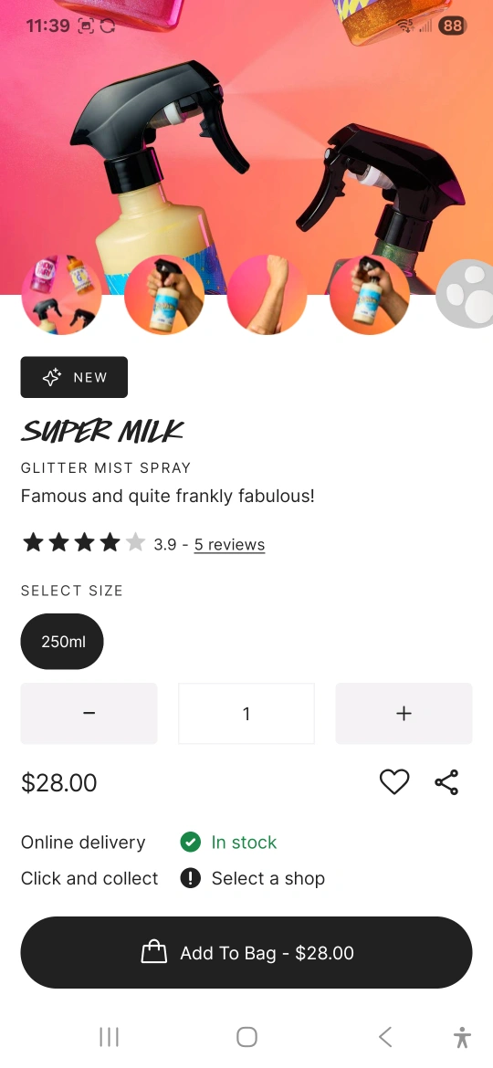 Selling a bottle of Lush Super Milk Glitter Mist Spray. It's famous and quite frankly fabulous! - Size: 250ml - The hydrating carrageenan works on softening the skin and acts as an emollient, keeping you not just looking brand new, but feeling it too! - Spritz glitter mist onto hair or body for an instant dose of sparkle Retails $28