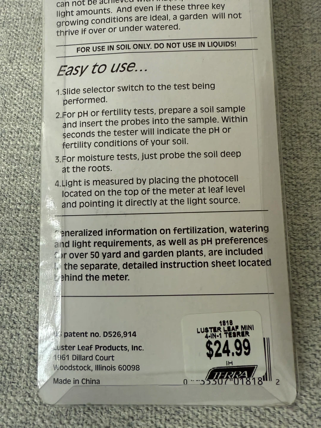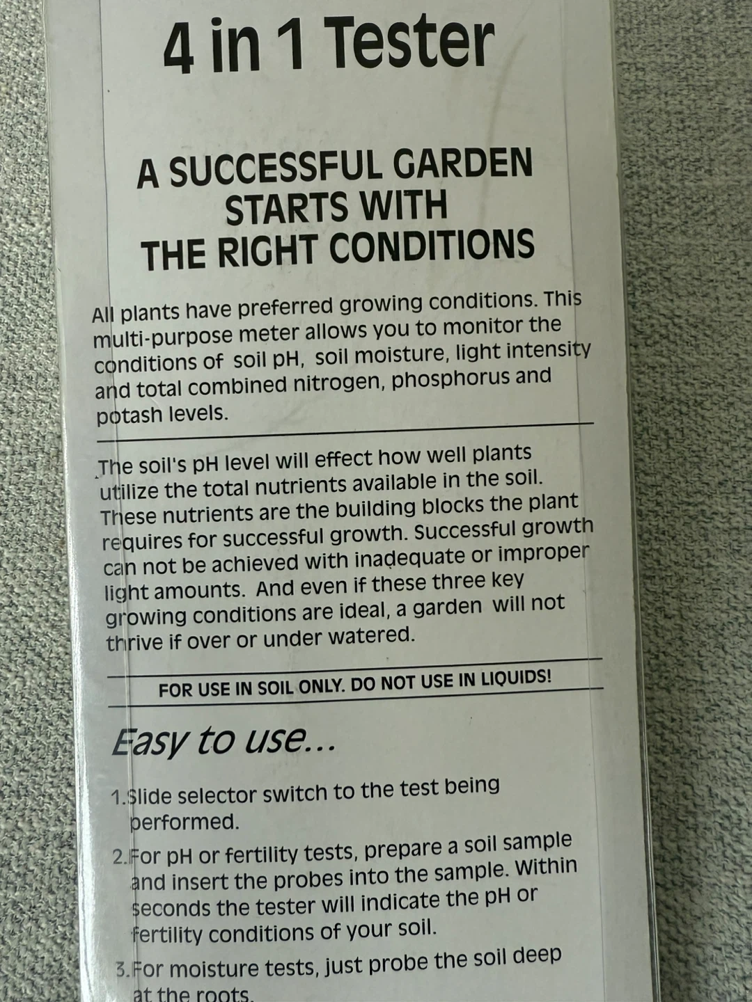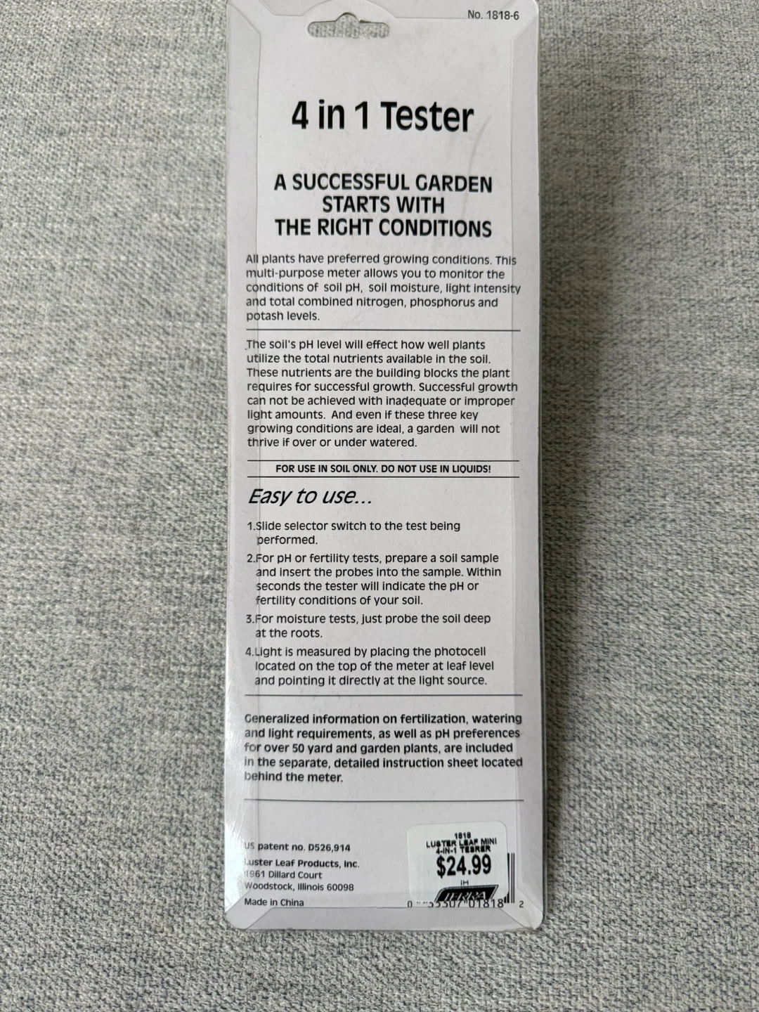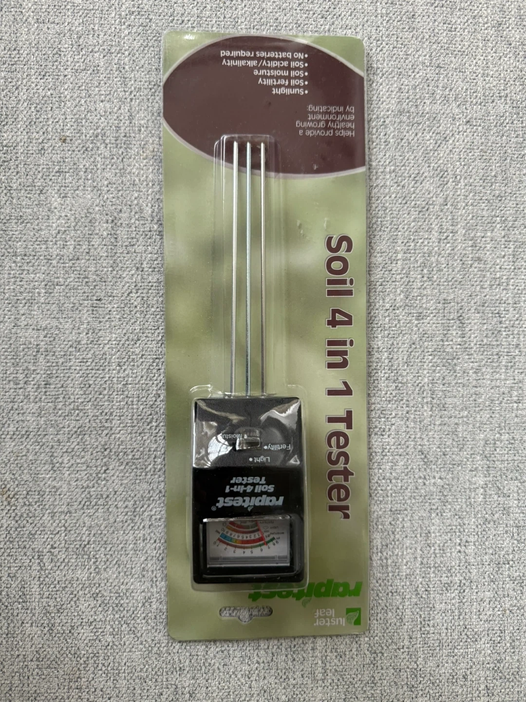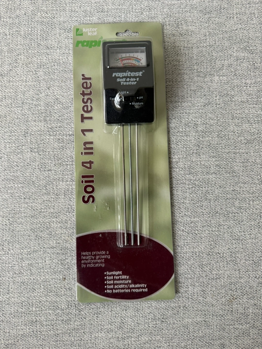 Get your garden growing with this Luster Leaf Rapitest Soil 4-in-1 Tester! ✨ This multi-purpose meter allows you to monitor the conditions of soil pH, soil moisture, light intensity and total combined nitrogen, phosphorus and potash levels. ✨ It helps provide a healthy growing environment by indicating sunlight, soil fertility, soil moisture, and soil acidity/alkalinity. ✨ No batteries are required either! Originally bought for $24.99 + tax. Never used as I found my other one 🪴