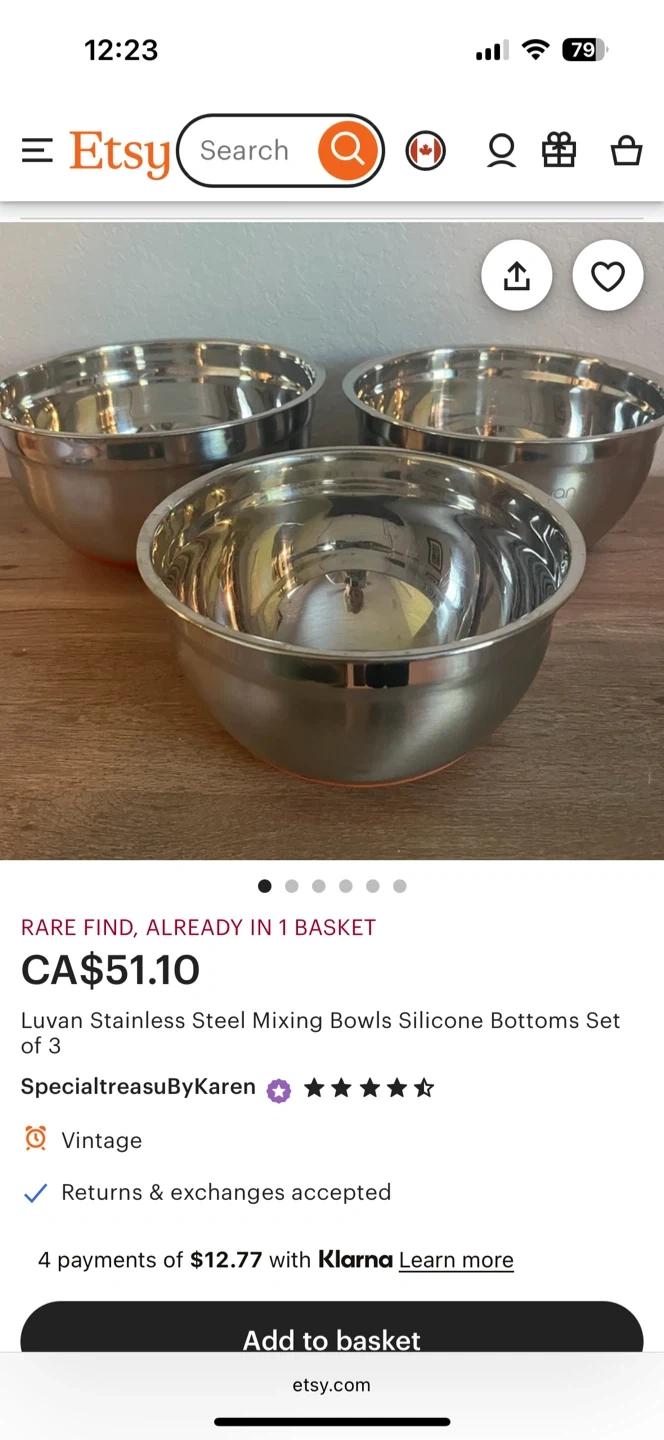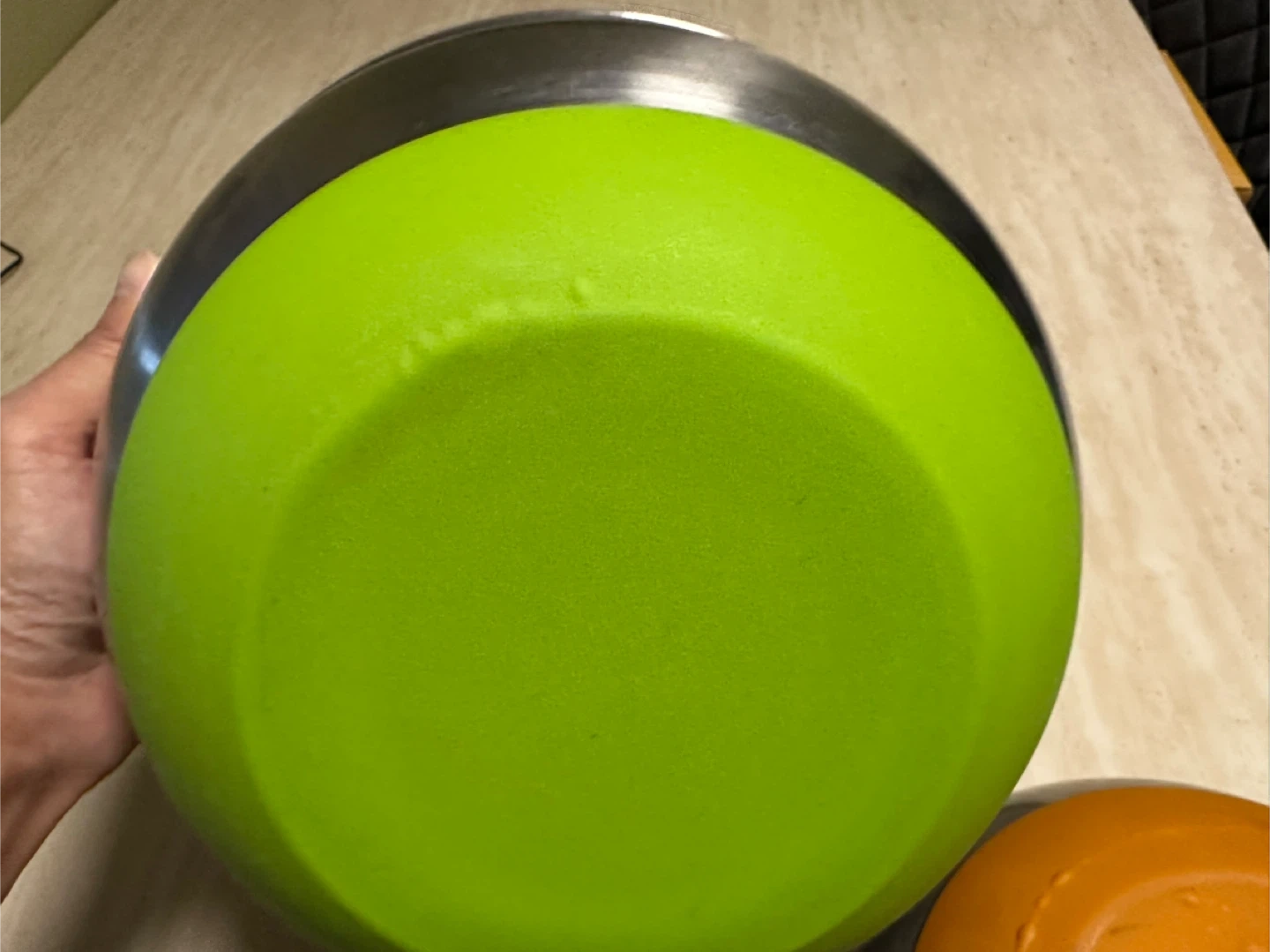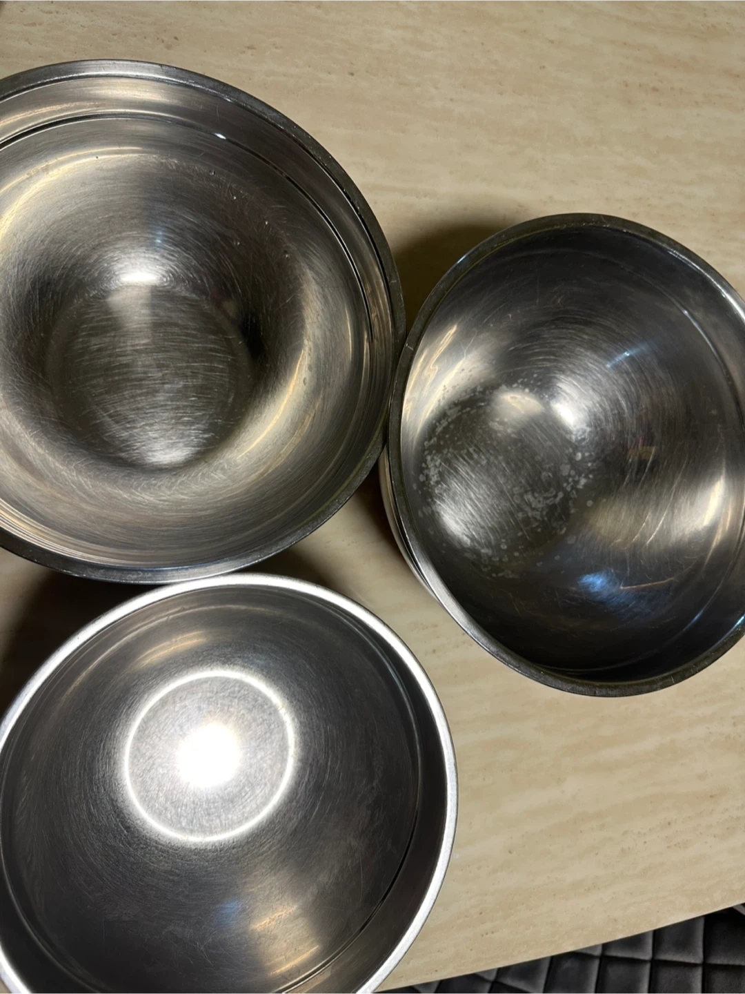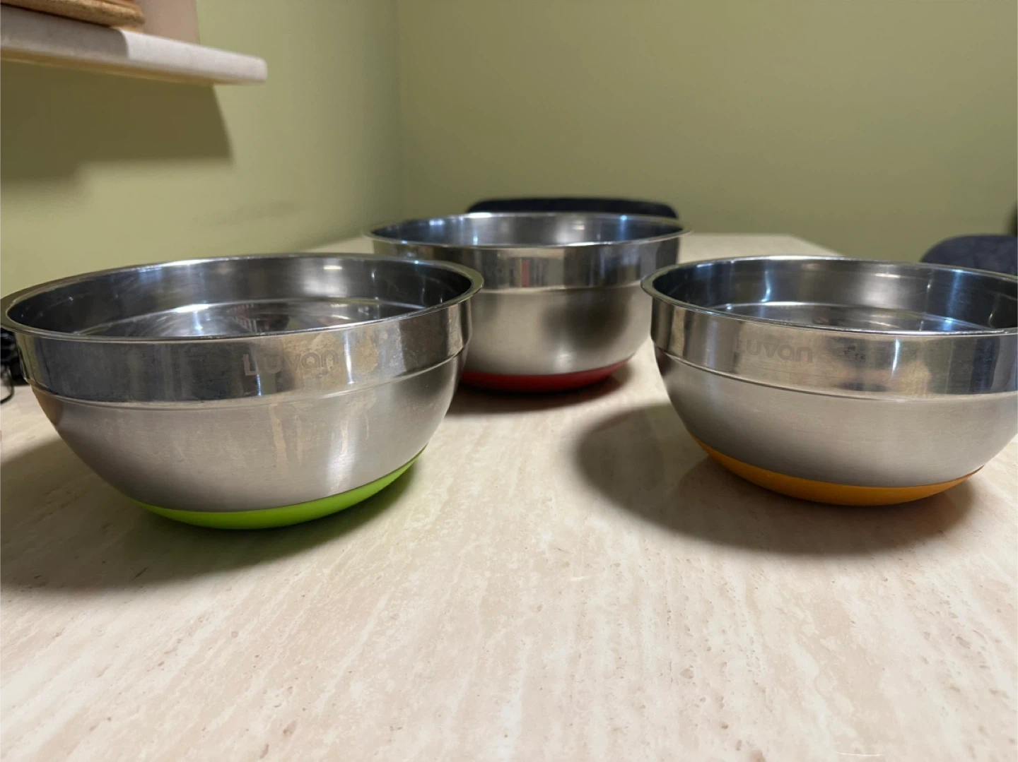 Selling a set of three Luvan stainless steel mixing bowls! It is high quality 304 stainless steel. They come in different sizes and have coloured bottoms: green, orange, and red. With silicon bottoms for non-slip mixing. Great for all your baking and cooking needs! Capacity: 2.6, 3.4, 4.2 quart Note: there is “bubbling” on the silicon bottoms, but the bowl is still sturdy and non-slip as it used to be. Price is adjusted accordingly
